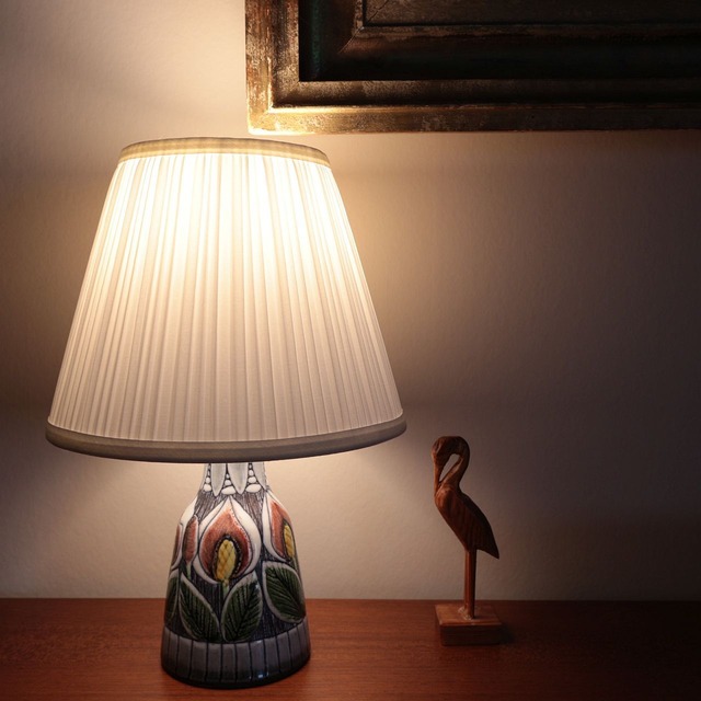 1960年代、スウェーデンのTilgmans Keramik で製作されたテーブルランプ。Siv Jakobssonがデザインを手がけました。 同社らしい素朴な素地に、華やかな花柄が描かれた意欲的な作品。プリーツシェードとランプ足元のプリーツも揃い、ナチュラルながらも上品な仕上がりとなりお部屋を優しく彩ってくれそうな照明です。 【ご確認ください】 日本国内用にコンセントプラグを交換後、通電テストを行っております。ソケットはE14、LED電球をご利用いただけます。(画像はLED/40W使用) ソケット、オンオフスイッチおよびコードはオリジナルを使用しております。 ヴィンテージ作品であることをご理解の上、ご自身の責任をもってご利用下さい。 サイズ: 直径195×高さ290(シェード上まで)(mm) コード:全長約184㎝/本体から約32㎝の場所にオンオフスイッチあります。 ※電球(LED40W相当:設計時間20000時間)・シェードが付属します。