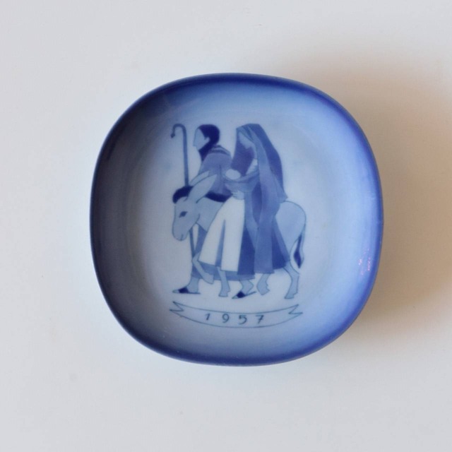 フィンランドのアラビアで製作されたクリスマスプレート。確認出来る範囲で、1953年から1991年まで製作が続いていたシリーズです。 アラビアではいくつかイヤープレートを製作しています。叙事詩カレワラの物語やフィンランドの街並みを描いた大小の陶板などに加え、製作数は限定的ながら製作されたのがこちらの小さなクリスマスプレートです。 初期は宗教的、あるいはフィンランド的なデザインが中心でしたが1960年代頃からはアラビアらしいデザインが徐々に中心となり、60年代後半以降はよりデザイン的なものや野生生物といった時代の流行を取り入れたモチーフが選ばれるようになりました。 1957年のテーマは【ヨハネと聖母子】。Anja Juurikkalaがデザインをしたものとなります。 サイズ:約120×120(mm)