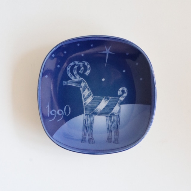 フィンランドのアラビアで製作されたクリスマスプレート。確認出来る範囲で、1953年から1991年まで製作が続いていたシリーズです。 アラビアではいくつかイヤープレートを製作しています。叙事詩カレワラの物語やフィンランドの街並みを描いた大小の陶板などに加え、製作数は限定的ながら製作されたのがこちらの小さなクリスマスプレートです。 初期は宗教的、あるいはフィンランド的なデザインが中心でしたが1960年代頃からはアラビアらしいデザインが徐々に中心となり、60年代後半以降はよりデザイン的なものや野生生物といった時代の流行を取り入れたモチーフが選ばれるようになりました。 1990年のテーマは【ユールボック】。Gunvor Olin-Grönqvistがデザインをしたものとなります。 サイズ:約120×120(mm)