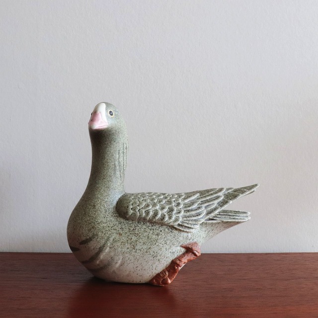 1975年、リサ・ラーソンはグスタフスベリとWWF(世界自然保護基金)の協働プロジェクトとして、「Utrotningshotade Djur(絶滅危惧種動物)」シリーズをスタートさせました。プロジェクトは1982年からはPaul Hoff が引き継ぎ、1987年までの13年間製作が続きました。 製作されたフィギュアは北欧の野生動物が直面する環境問題を伝えるため、スウェーデンのストックホルムとヨーテボリにあるNKデパートで限定販売され、売上の一部はWWFの保護活動に寄付されました。 リサ・ラーソンが手がけたのはオオヤマネコ(1975年)イヌワシ(1976年)アザラシ(1977年)ヨーロッパバイソン(1978年)ハリネズミ(1979年)カワウソ(1980年)ハヤブサ(1981年)の合計7種類。その後はPaul Hoffにより、ミドリヒキガエル(1982年)ホッキョクグース(1983年)メンフクロウ(1984年)ホッキョクギツネ(1985年)ワシミミズク1986年パンダ(1987年)と製作されています。 2000体~3000体と製作数はごく限定的で、現在で北欧ヴィンテージの中でも特に高い人気を誇るモデルとなっています。 1983年はシリーズの 9作目 として、北欧の高地やツンドラ地帯に生息する ホッキョクグース(Fjällgås / Lesser White-fronted Goose) が制作されました。ホッキョクグースは渡り鳥として知られ、スウェーデンでも古くから観察されてきましたが、1970年代以降は生息地の減少や狩猟の影響により個体数が急激に減少し、WWFが重点的に保護を進めていた種のひとつです。 Paul Hoff は、この渡り鳥の慎ましくも凛とした佇まいを、丸みを帯びたフォルムと落ち着いた釉薬の色調で表現しています。胸を張り、静かに前を見つめる姿は、長い旅路を生き抜く鳥の強さと繊細さを同時に感じさせます。羽の重なりを思わせる細かな凹凸や、柔らかなラインの処理は、彼の動物造形の特徴がよく表れた仕上がりです。 サイズ:幅150×奥行き90×高さ130(mm)