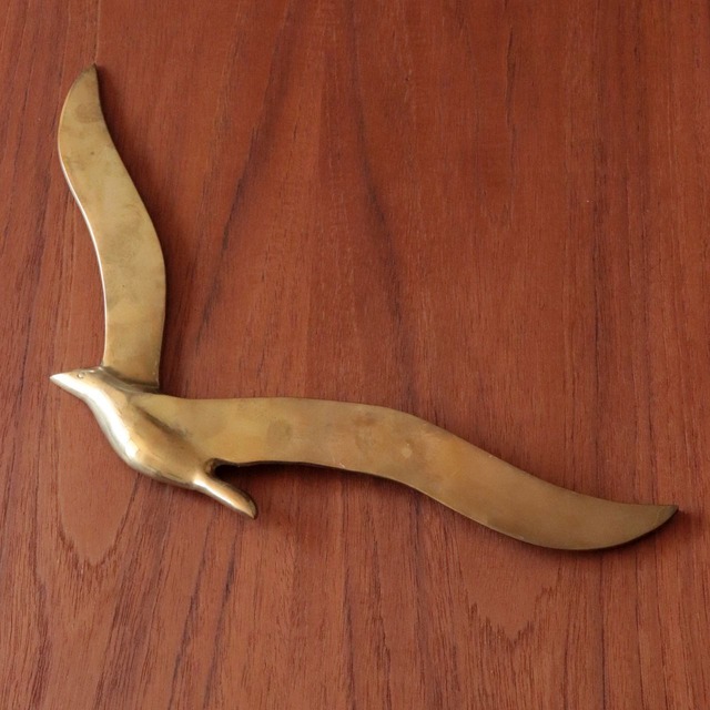 ノルウェーから届いた鳥の壁飾り。カモメを描いた製品で、大きさもあり存在感のあるお品です。 背面には壁掛けなどで引っ掛けることができるように金属のリングが付いています(写真4) ミッドセンチュリーで時折見かける鳥の壁飾りですが、空間にちょっとしたアクセントを加える演出として使い勝手の良いアイテムです。 サイズ: 幅440×270(最長)(mm) *経年による金属の摩耗が見られます。見た目には大きく害していないように思われますが、価格はコンディションを考慮したものとなります。