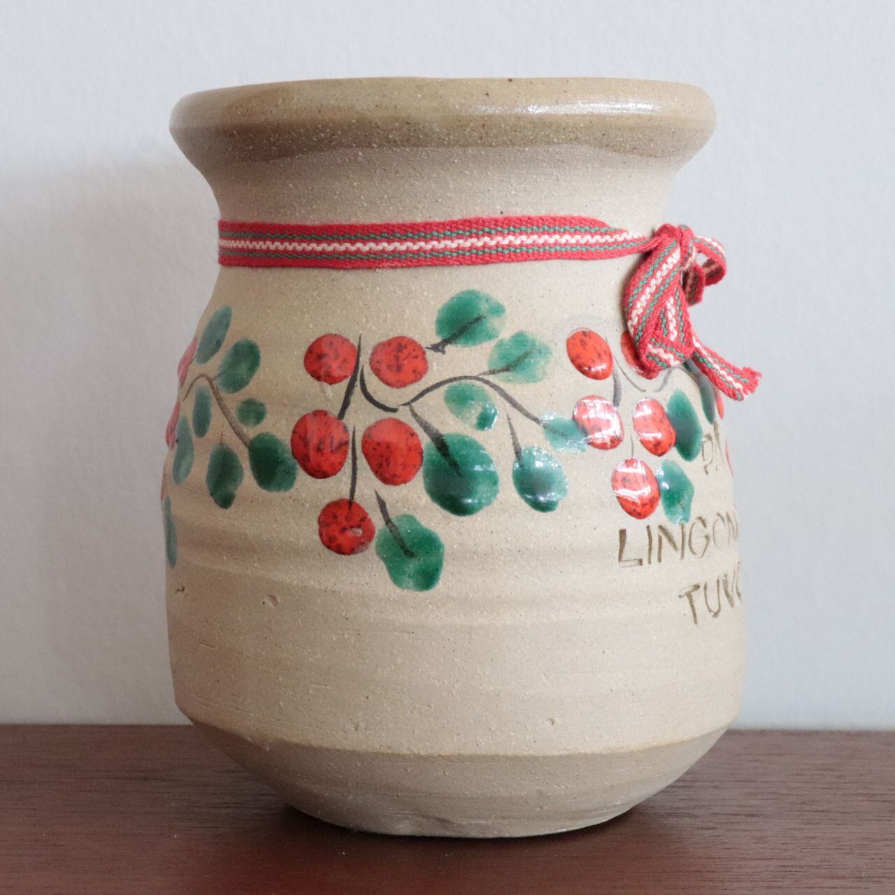 1970-80年代にスウェーデンで製作されたポット。側にはリンゴンベリーの実が可憐に描かれています。「Mosakrukan」もしくは「Smalandkurukan」と呼ばれるもので、スウェーデン南部スモーランドで製作されたものとなります。