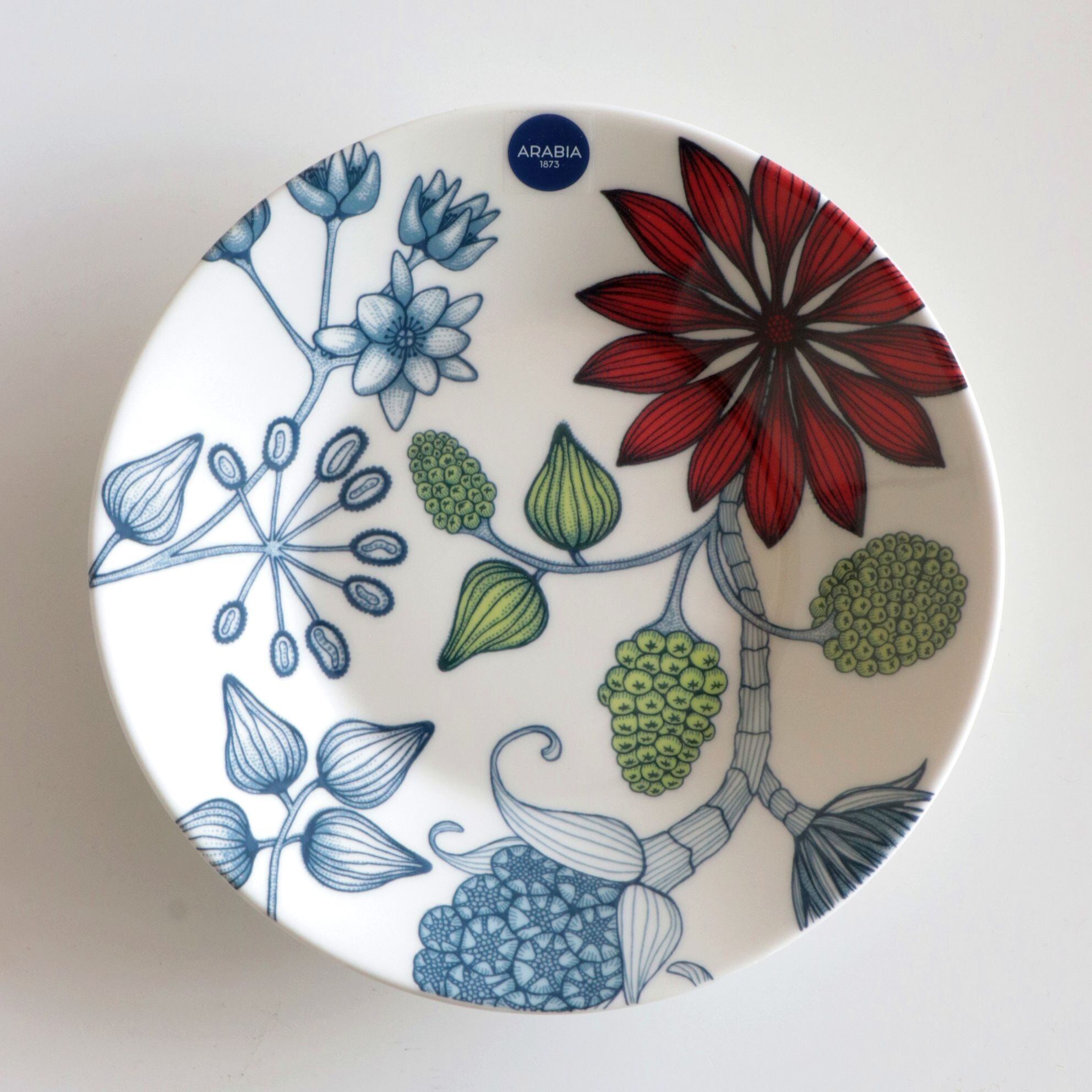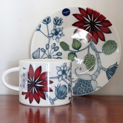 このたび復刻したのはルノ”サマーレイ”シリーズ。カップ&ソーサー、マグ、ボウル(17cm)、プレート(26cm)の4フォルム。いずれも2009年に発売された高い人気を得たアイテムで、華やかな花柄が食卓を彩るHeini Riitahuhtaらしいデザインです。