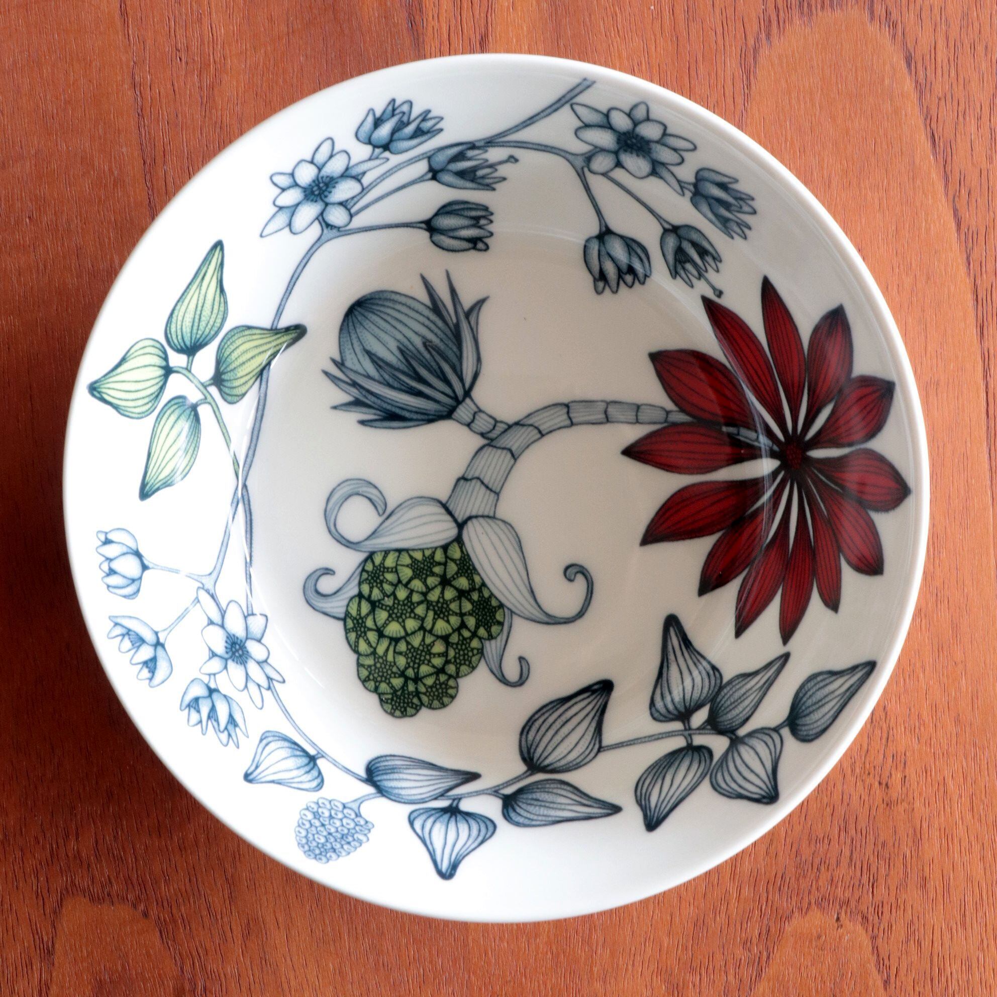 このたび復刻したのはルノ”サマーレイ”シリーズ。カップ&ソーサー、マグ、ボウル(17cm)、プレート(26cm)の4フォルム。いずれも2009年に発売された高い人気を得たアイテムで、華やかな花柄が食卓を彩るHeini Riitahuhtaらしいデザインです。