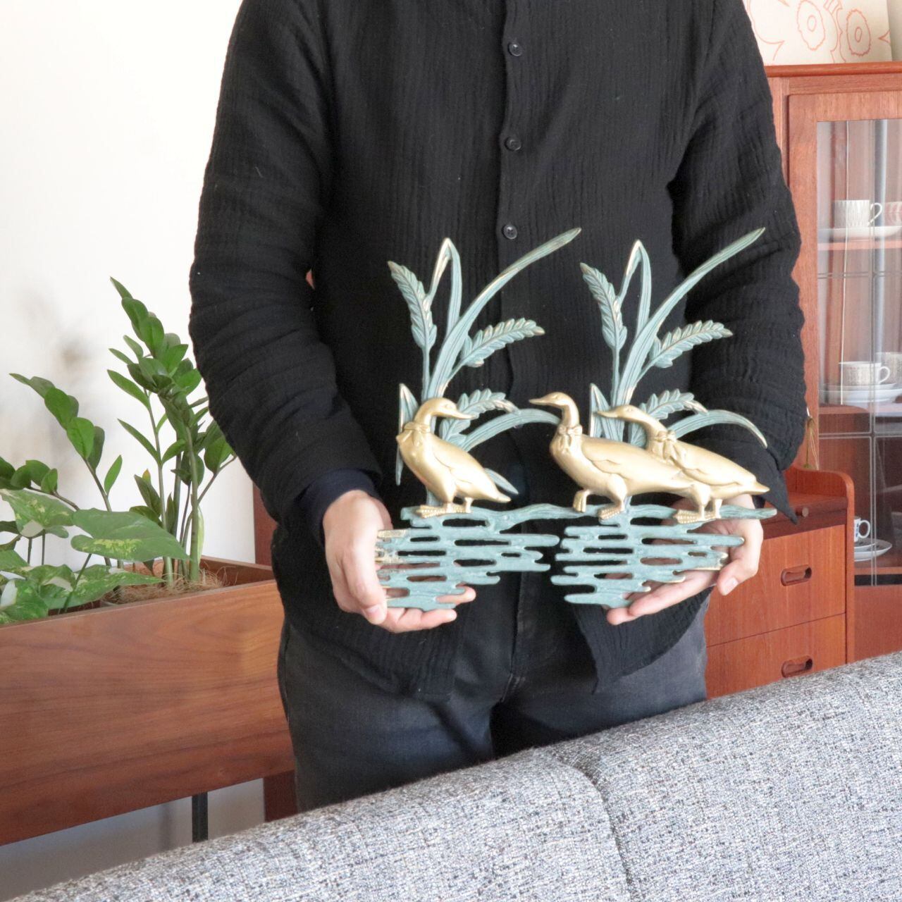 真鍮製で、壁に立てかけて使うように製作されたようです。それなりに重量もあり、安定感のある作品です。製造は数十年前の台湾のようで、経年によるものか色の差が出ており魅力的です。サイズも大きく、空間に彩りを出してくれるようなアイテムです。