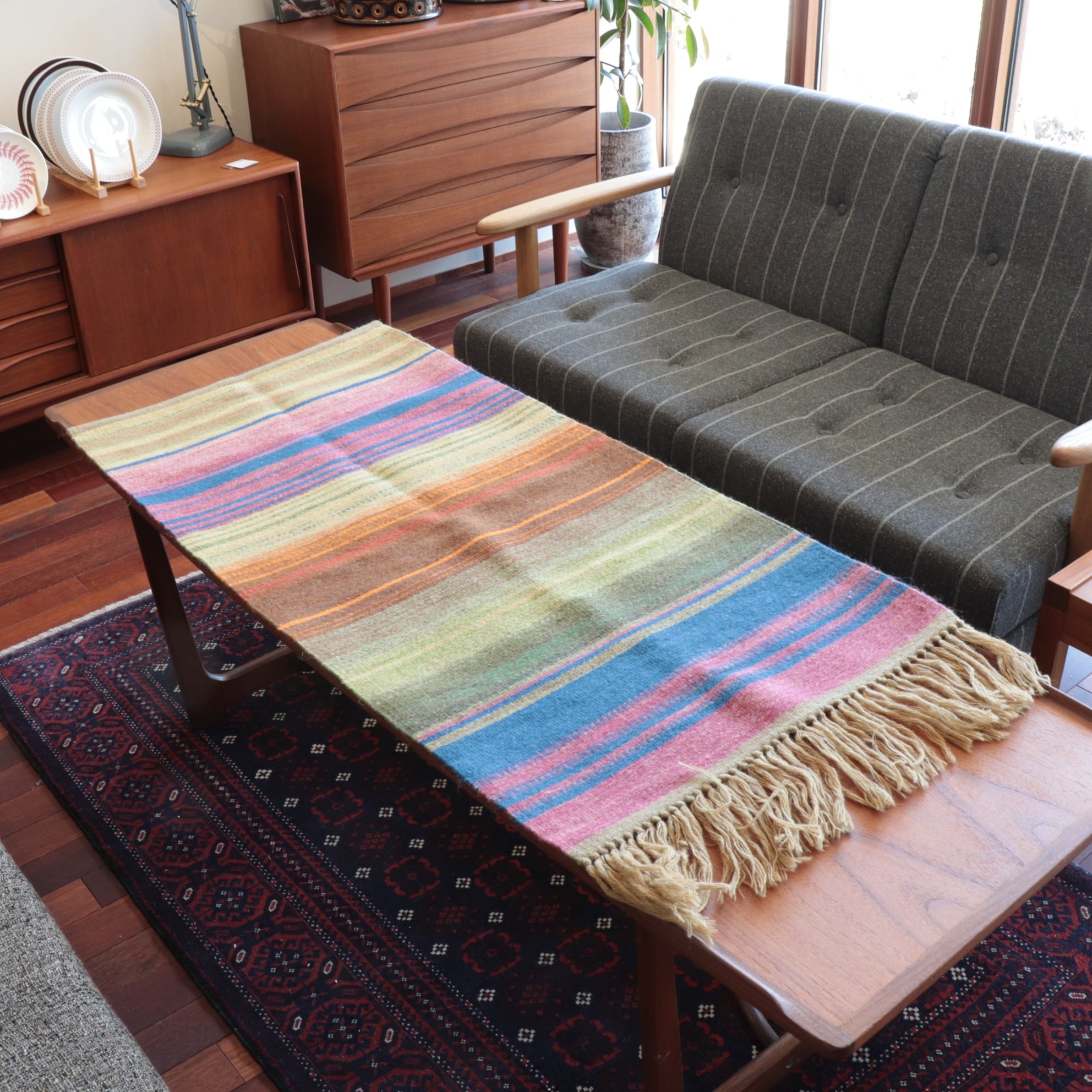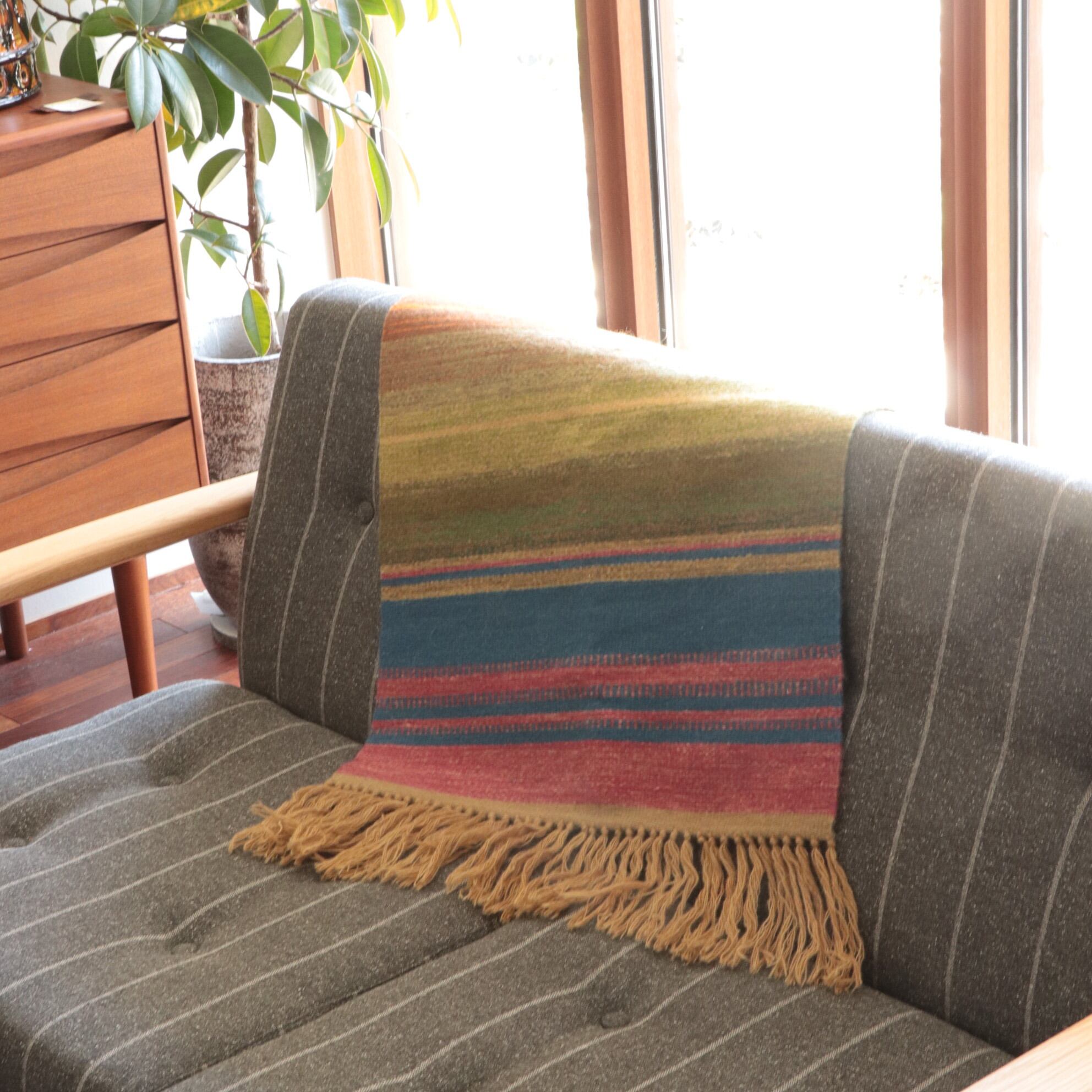 ウール素材のフォークロアなデザインで、シンプルながらも手仕事らしい温かみのあるデザインです。片側はループ状に加工されており、ソファなどのカバーに、また棒を通してタペストリーのように使用していただけるように製作されています。