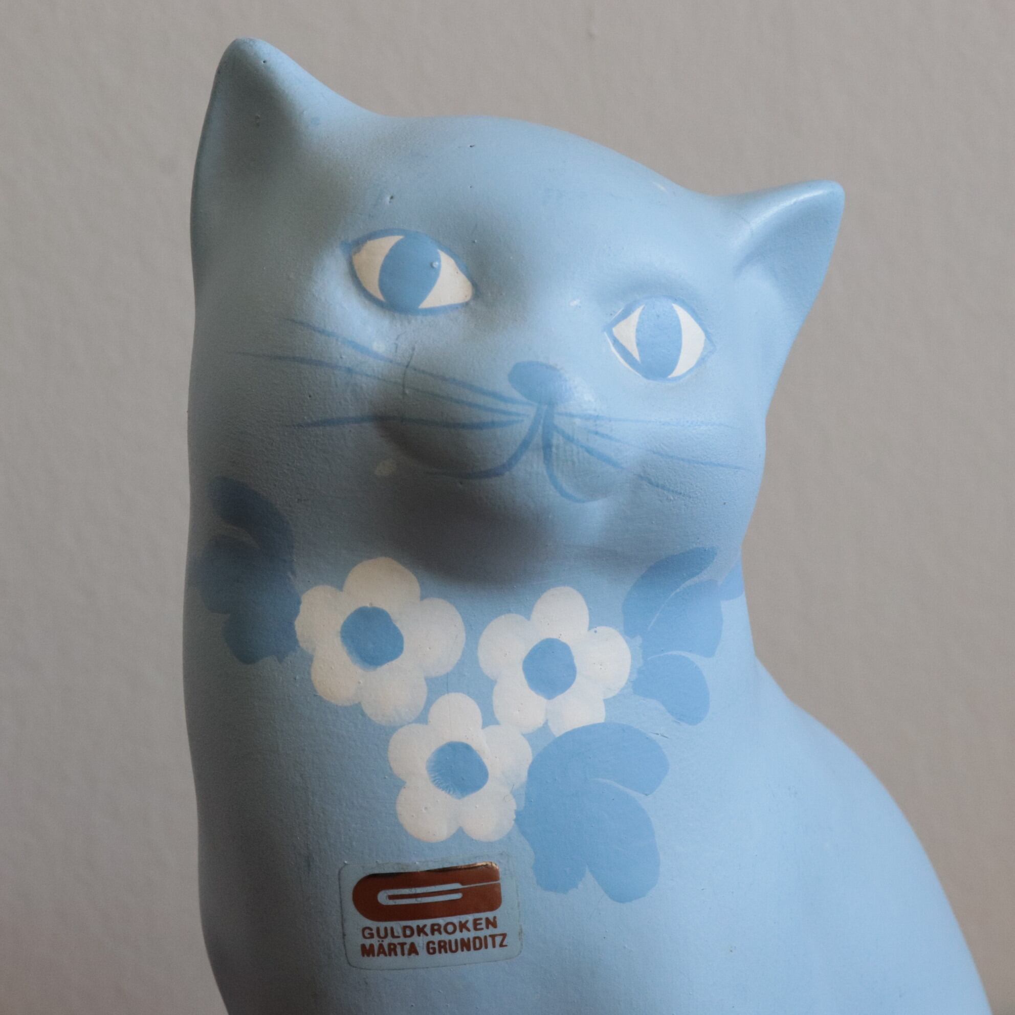 スウェーデンのGuldkroken Keramikで製作された猫のオブジェ。 特に1960-70年代にスウェーデン国内で高い人気をほこった工房で、花柄の動物シリーズなど数多くの製品を輩出してきました。ブルーの瞳に白いお花の首飾りをした可愛い仔猫がすました表情をしています。