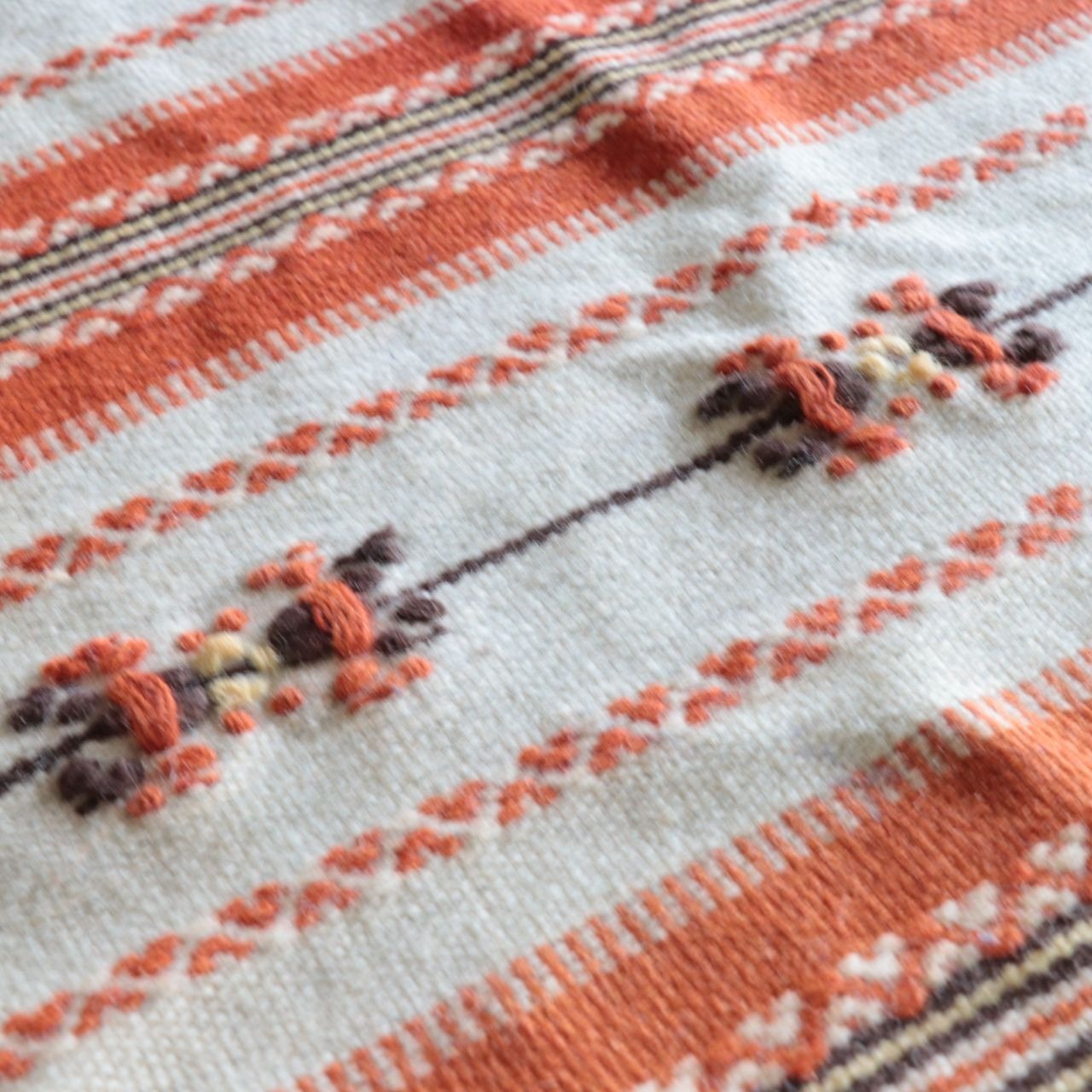 もこもこと立体感もあるお品で、ノスタルジックなオレンジ×黒の相性も抜群です。除去しきれなかった薄い染みがありますが大きく目立たず、テーブルを優しく飾ってくれそうなアイテムです。