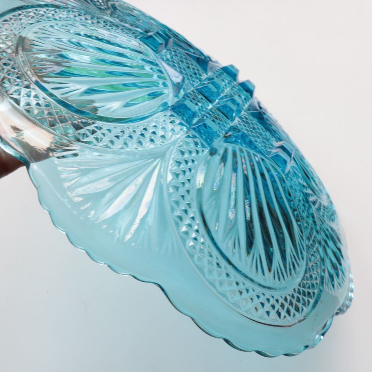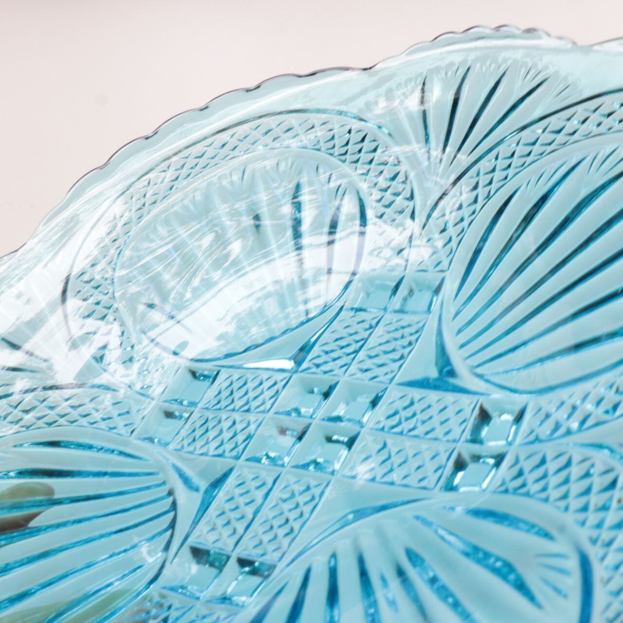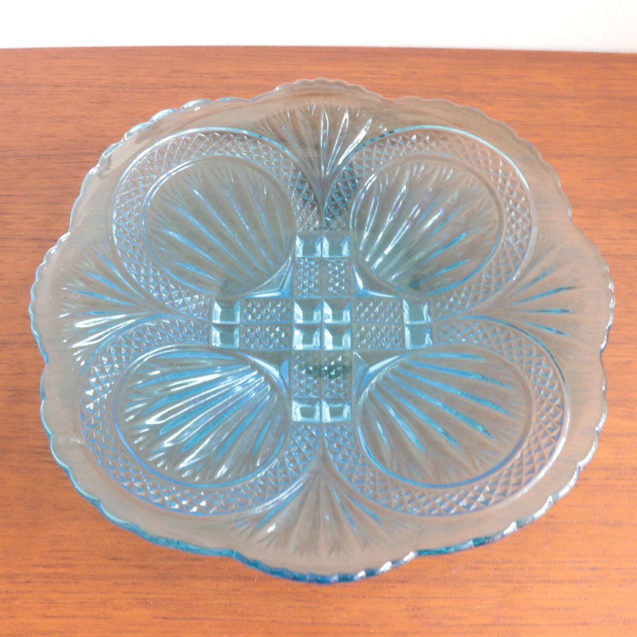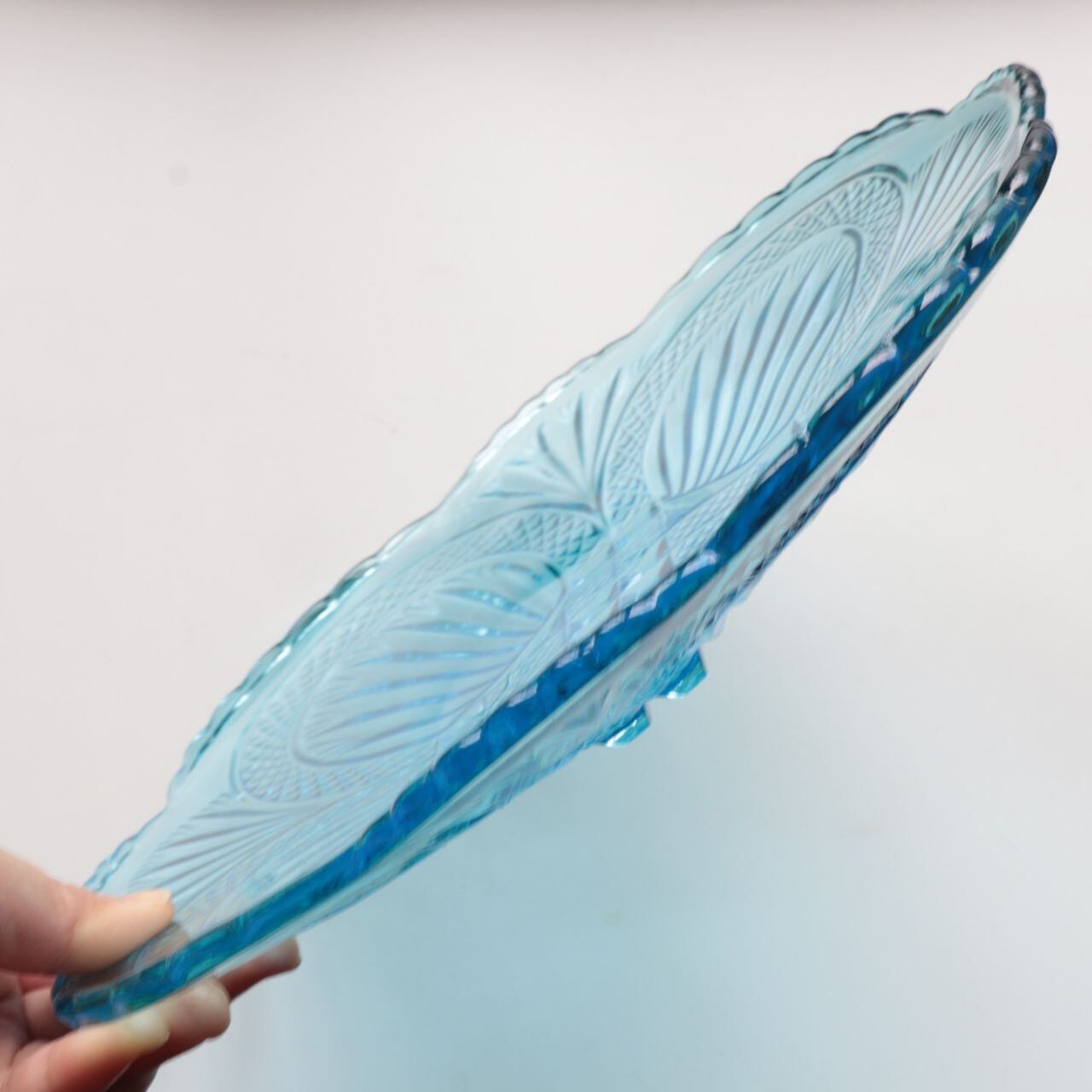 淡いブルーのガラスをカットガラスの技法で製作されたもので、植物柄を象徴的にカットして製作したものとなります。少し高さもあり、パーソナルな用途のほかにもサービングプレートといった用途で使用されても良さそうです。