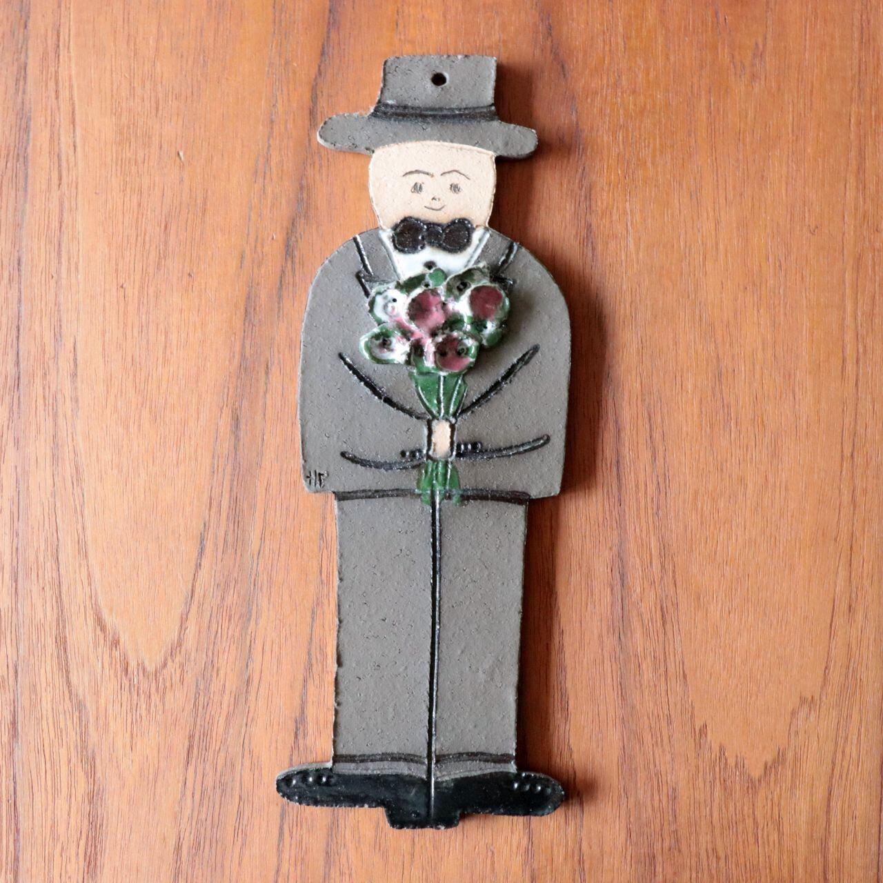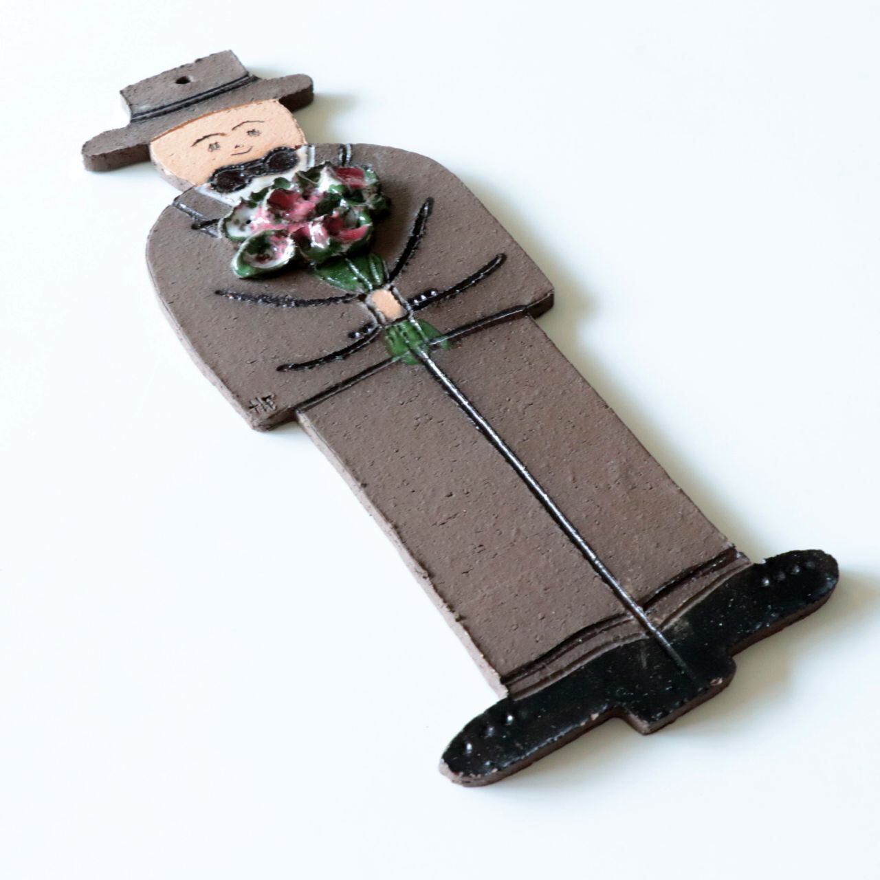 素朴な造形で味わいのあるデザインで、頭部(帽子)部位に穴が開けられており釘やフックで引っ掛けられるようになっています。
