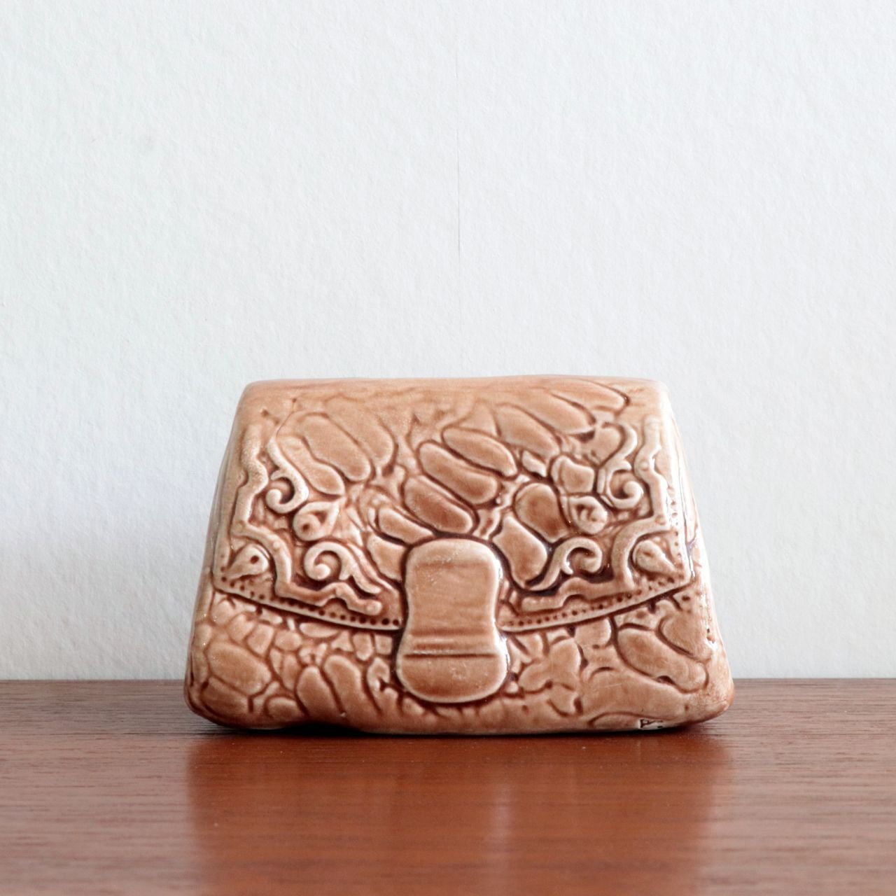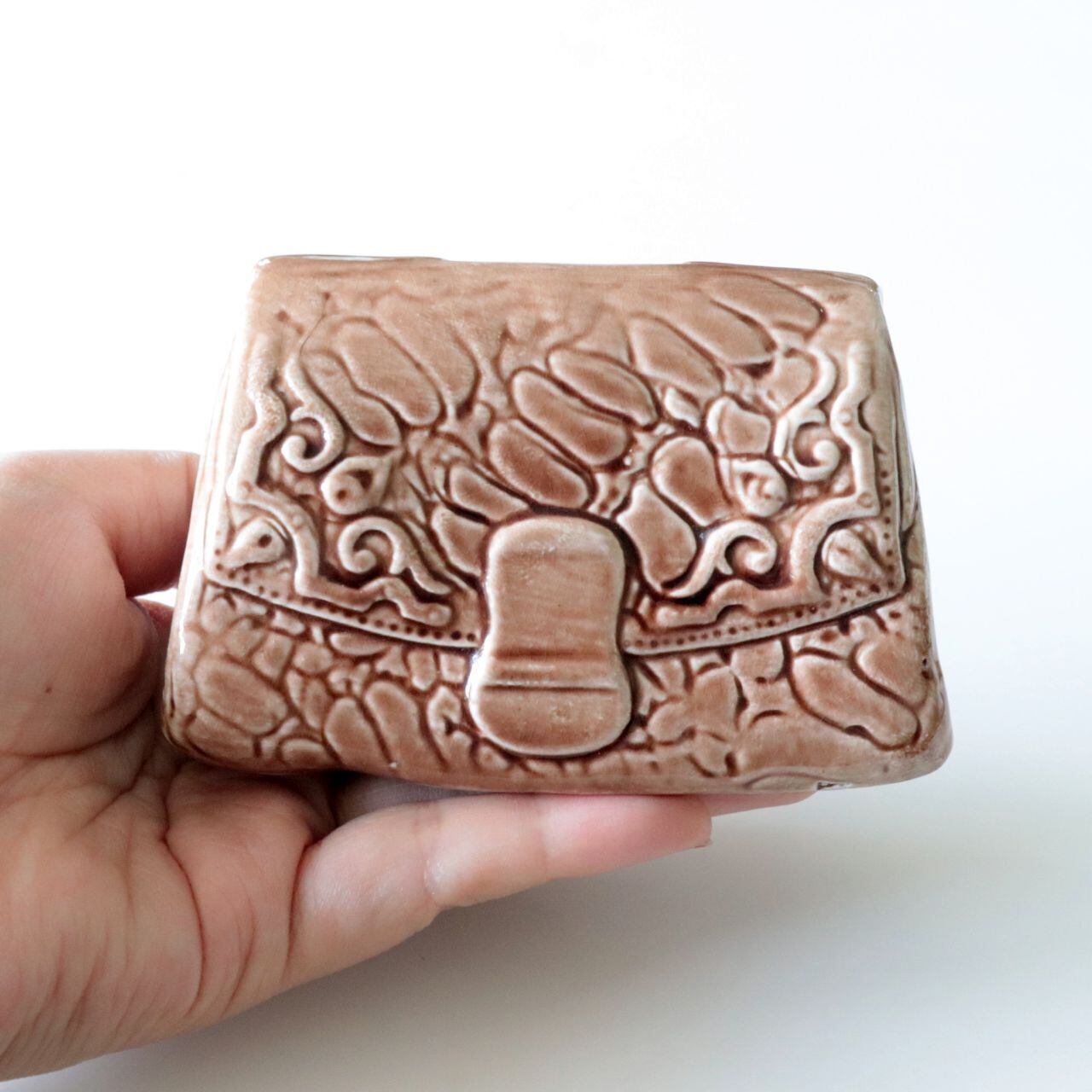 1960-70年代頃に製作された貯金箱。現地コレクターの情報によるとグスタフスベリ社で製作されたものという記載がありましたが、バックスタンプやグスタフスベリ社の資料で確定が出来ず、確証はありません。バッグ型の貯金箱と当時としても珍しめのデザインで、作りはよく面白いアイテムです。