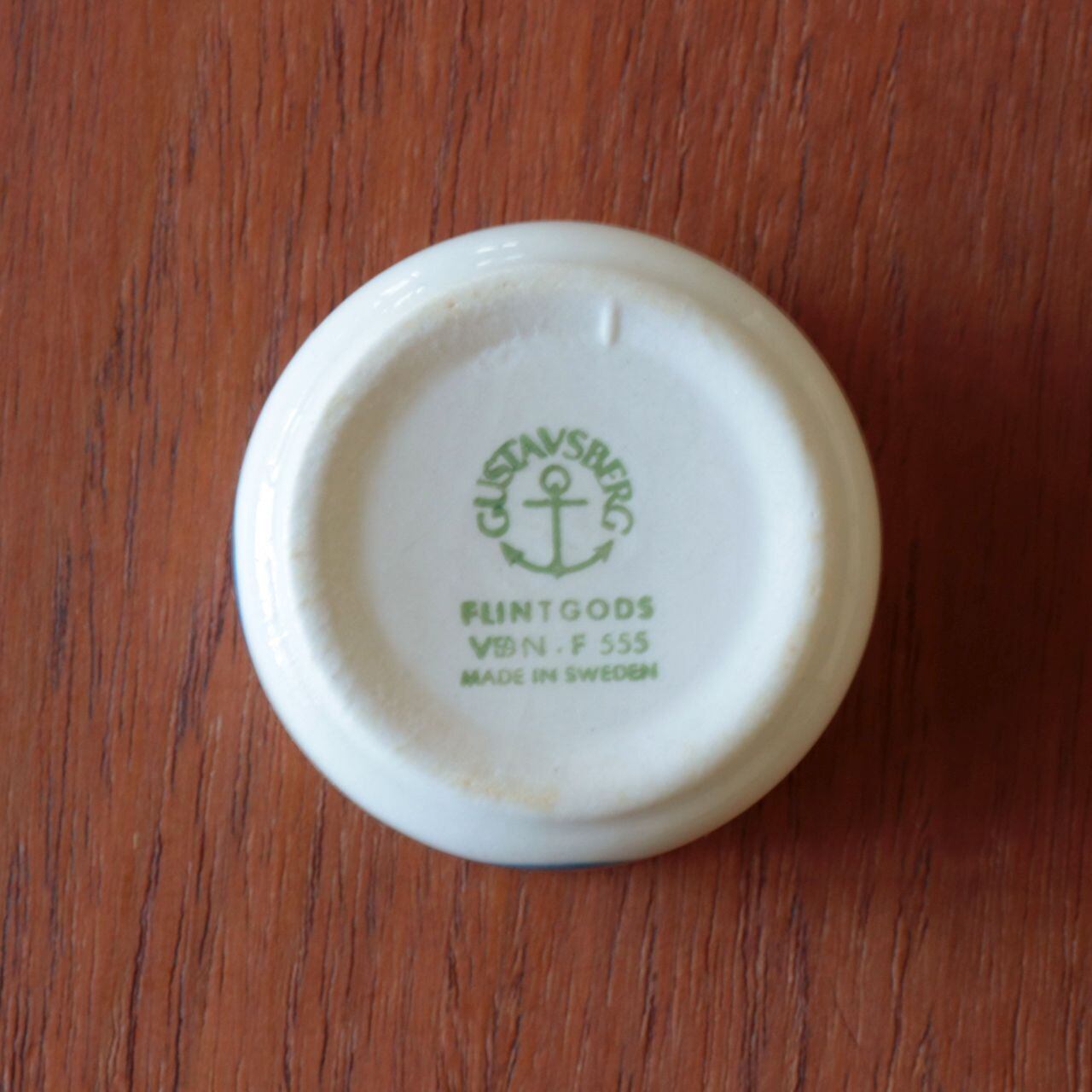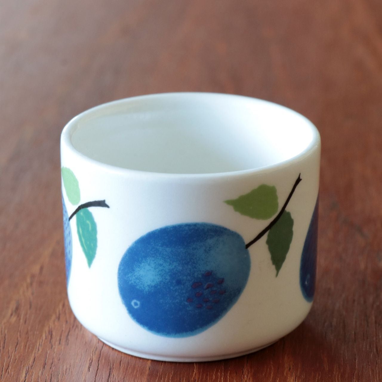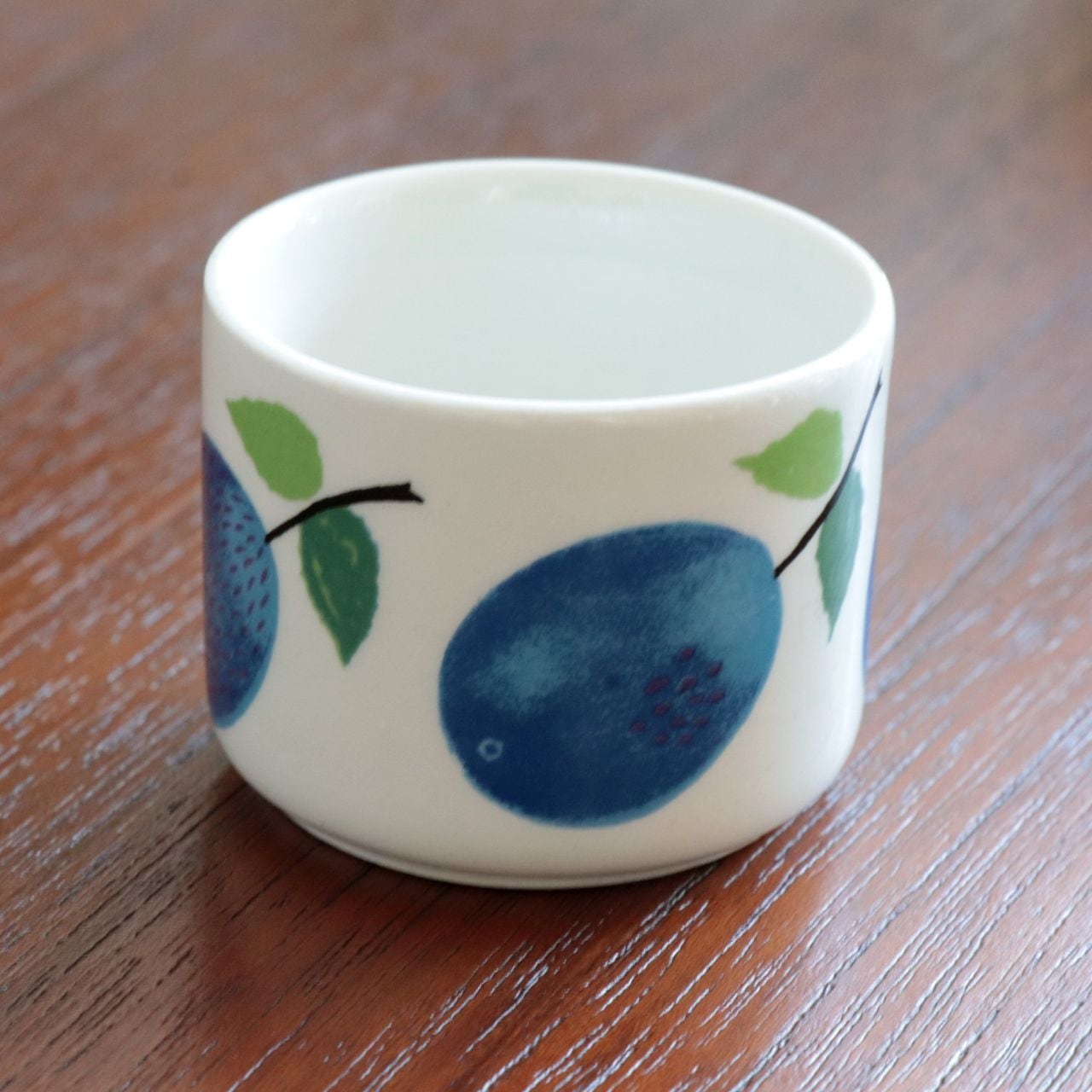 大胆に描かれたPrunus (プラム)が象徴的なこのシリーズは北欧ミッドセンチュリーを代表するアイテムの一つで、廃盤後数十年経ち現在では復刻もされている人気のシリーズです。ヴィンテージは現行と比べると色が若干紫がかった青で、バックスタンプもプラム柄のオリジナルデザインとなっています。
