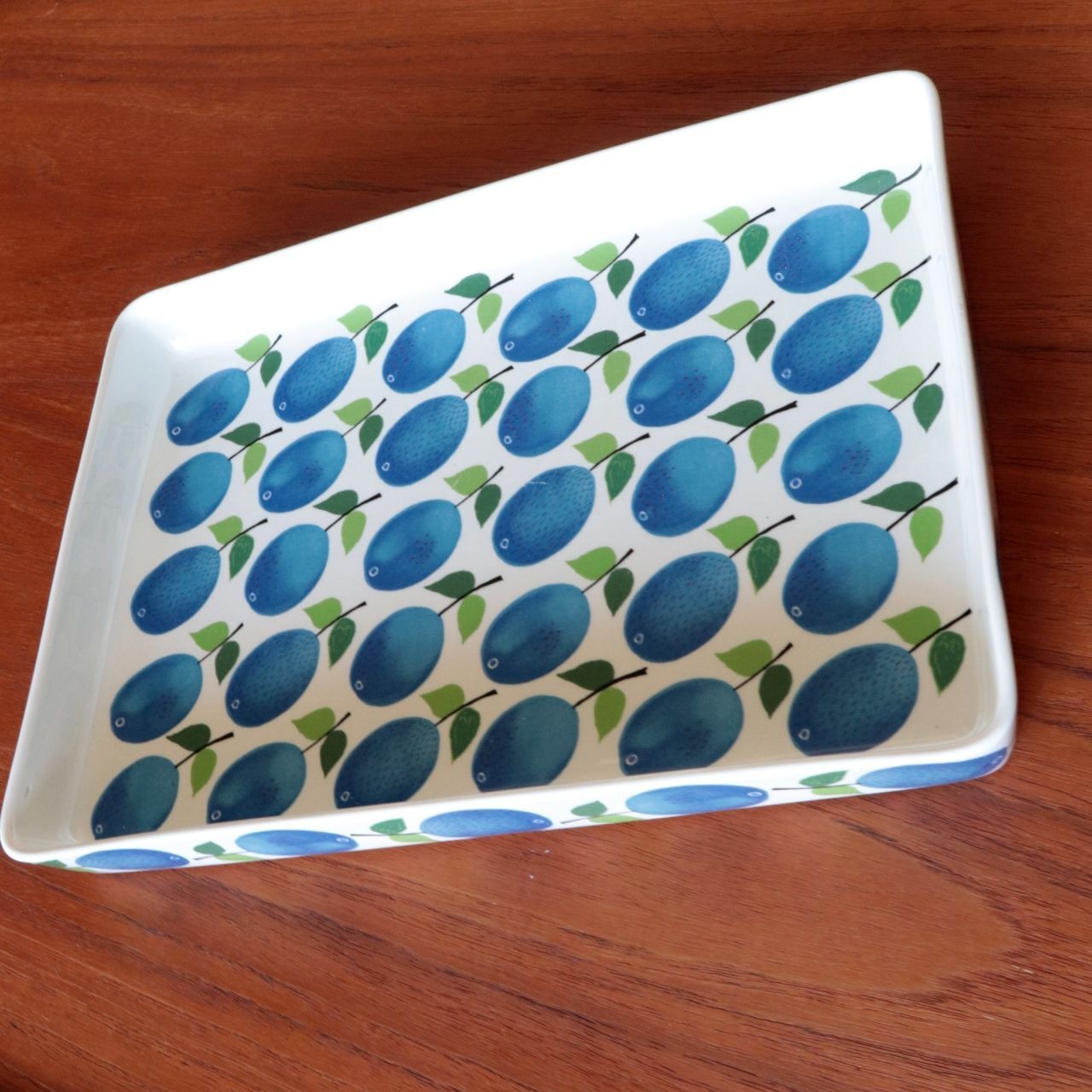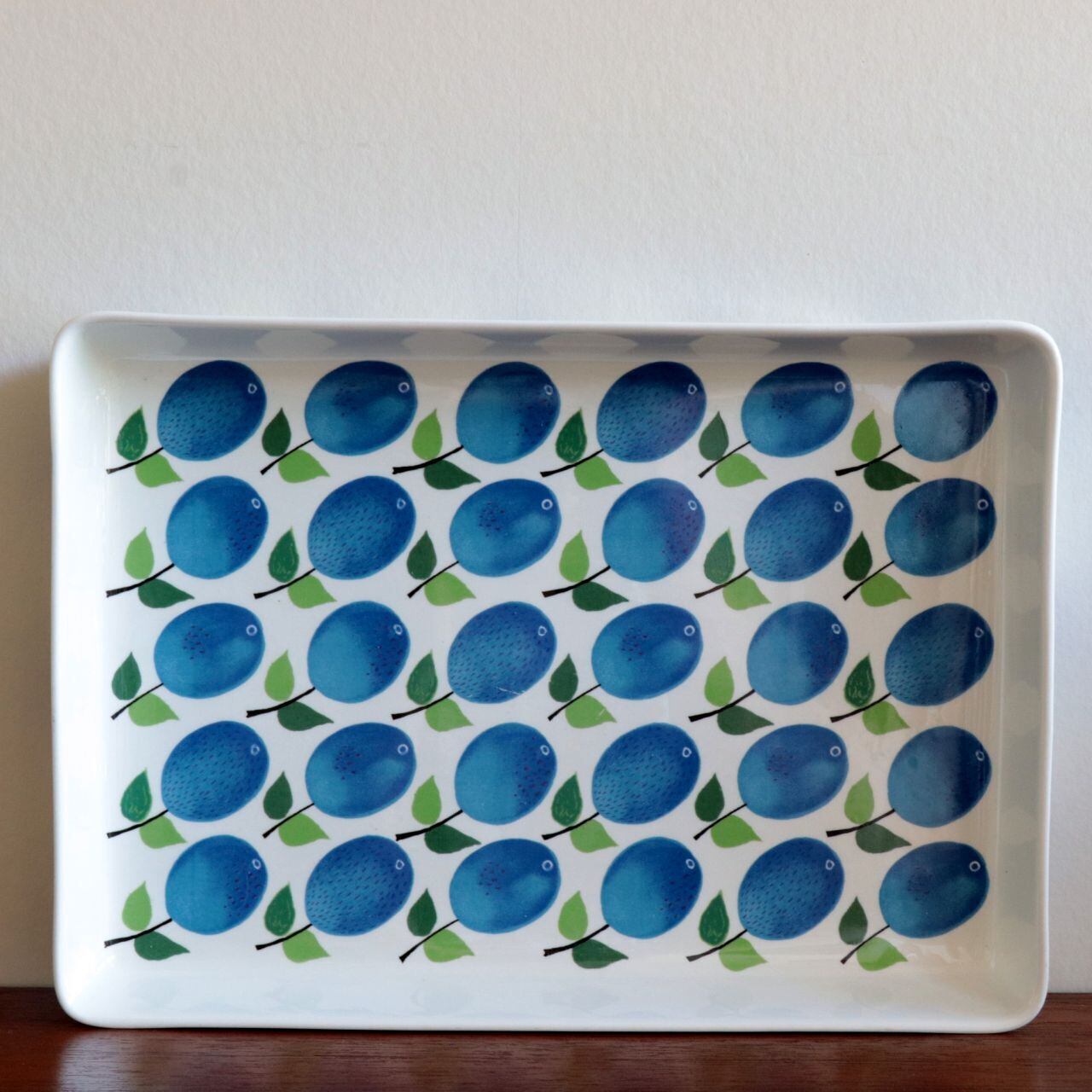 大胆に描かれたPrunus (プラム)が象徴的なこのシリーズは北欧ミッドセンチュリーを代表するアイテムの一つで、廃盤後数十年経ち現在では復刻もされている人気のシリーズです。ヴィンテージは現行と比べると色が若干紫がかった青で、バックスタンプもプラム柄のオリジナルデザインとなっています。