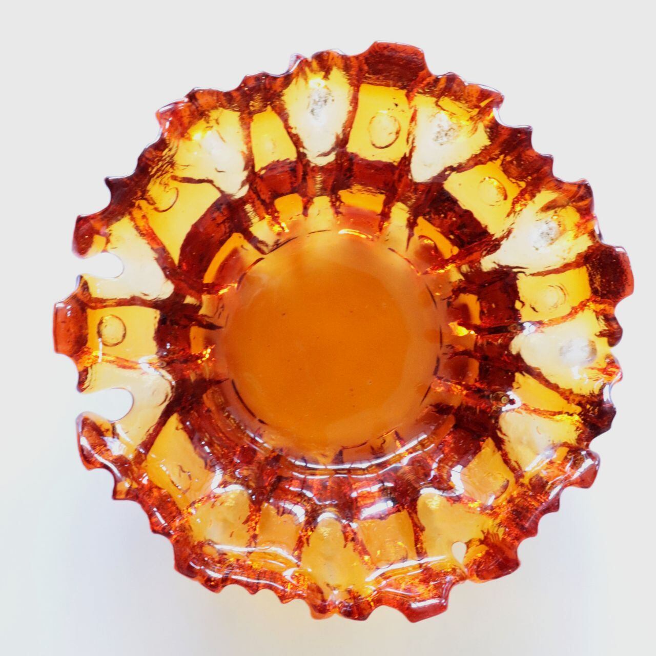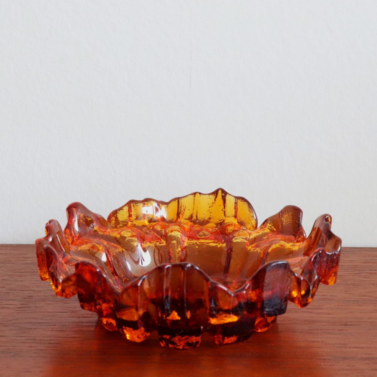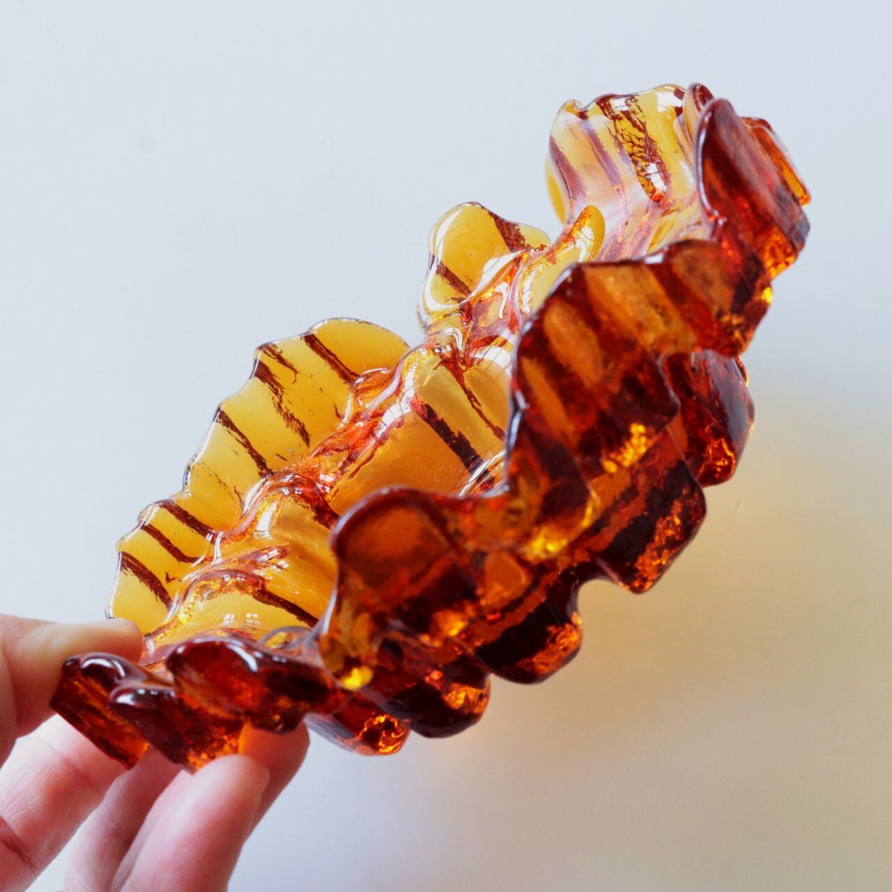 波打つようなフォルムは、光を受けるたびに表情を変え、テーブルの上に温かな陰影を描き出します。デザイナー名は残念ながら不詳ですが、その造形には当時の北欧ガラスの魅力が凝縮されています。