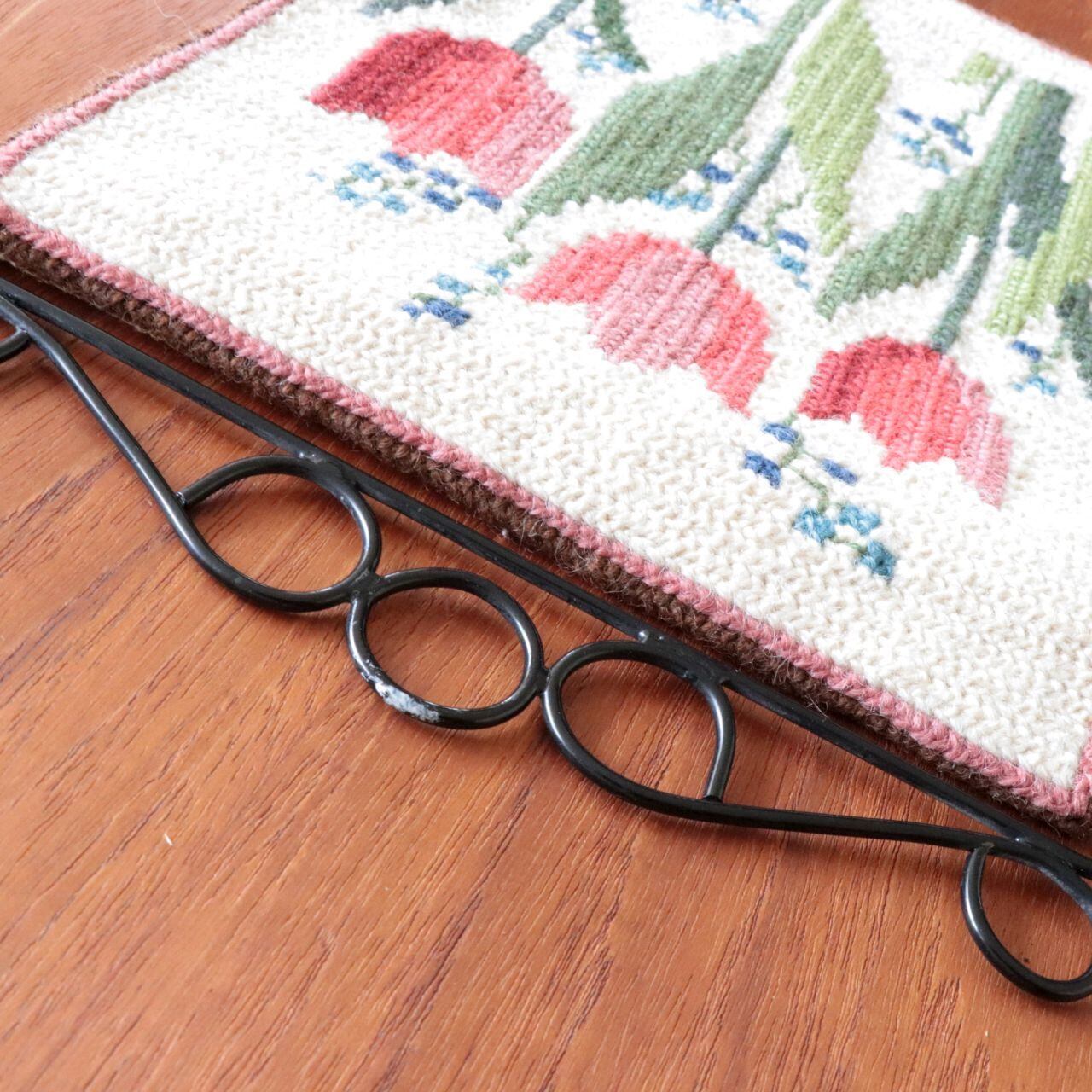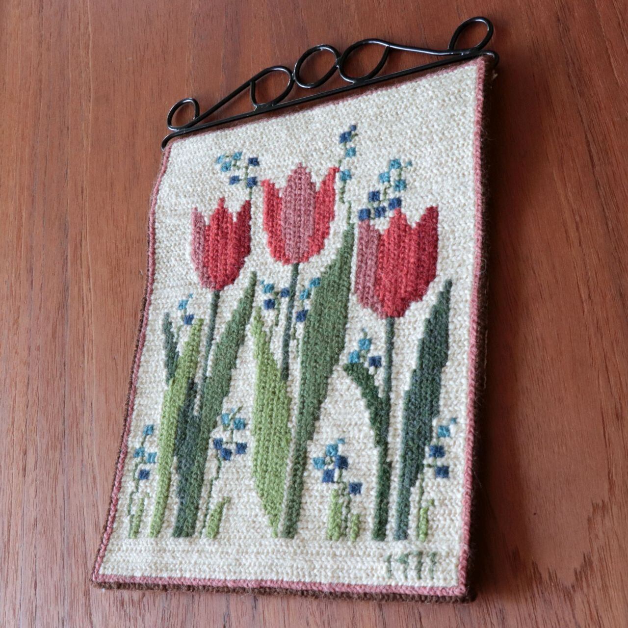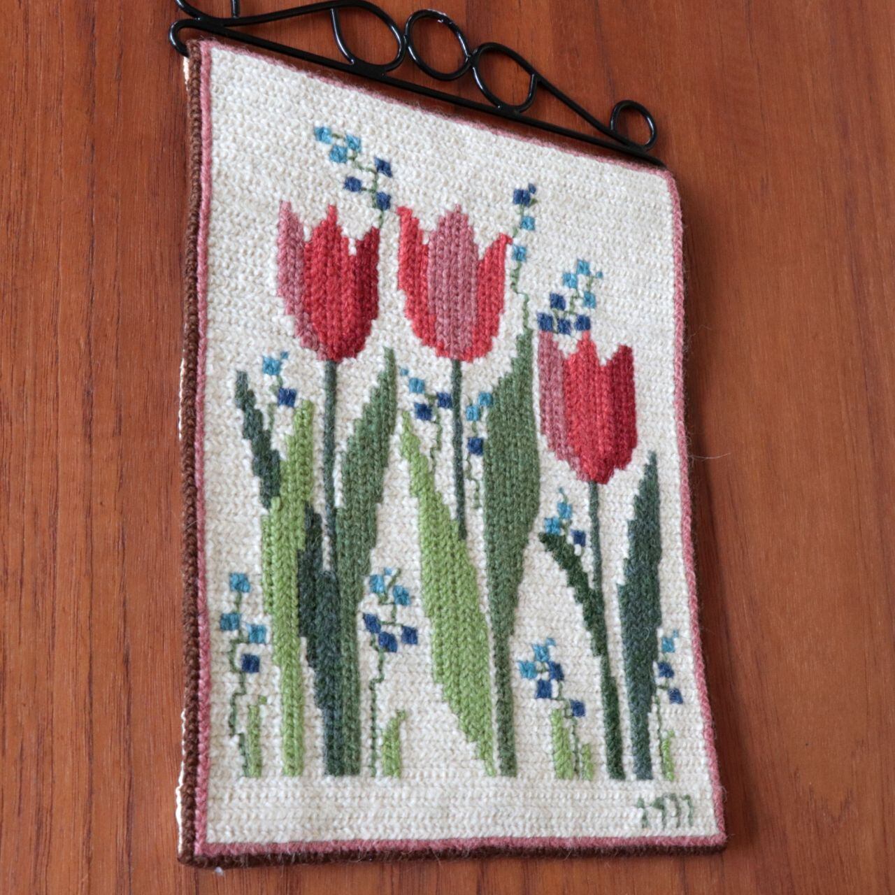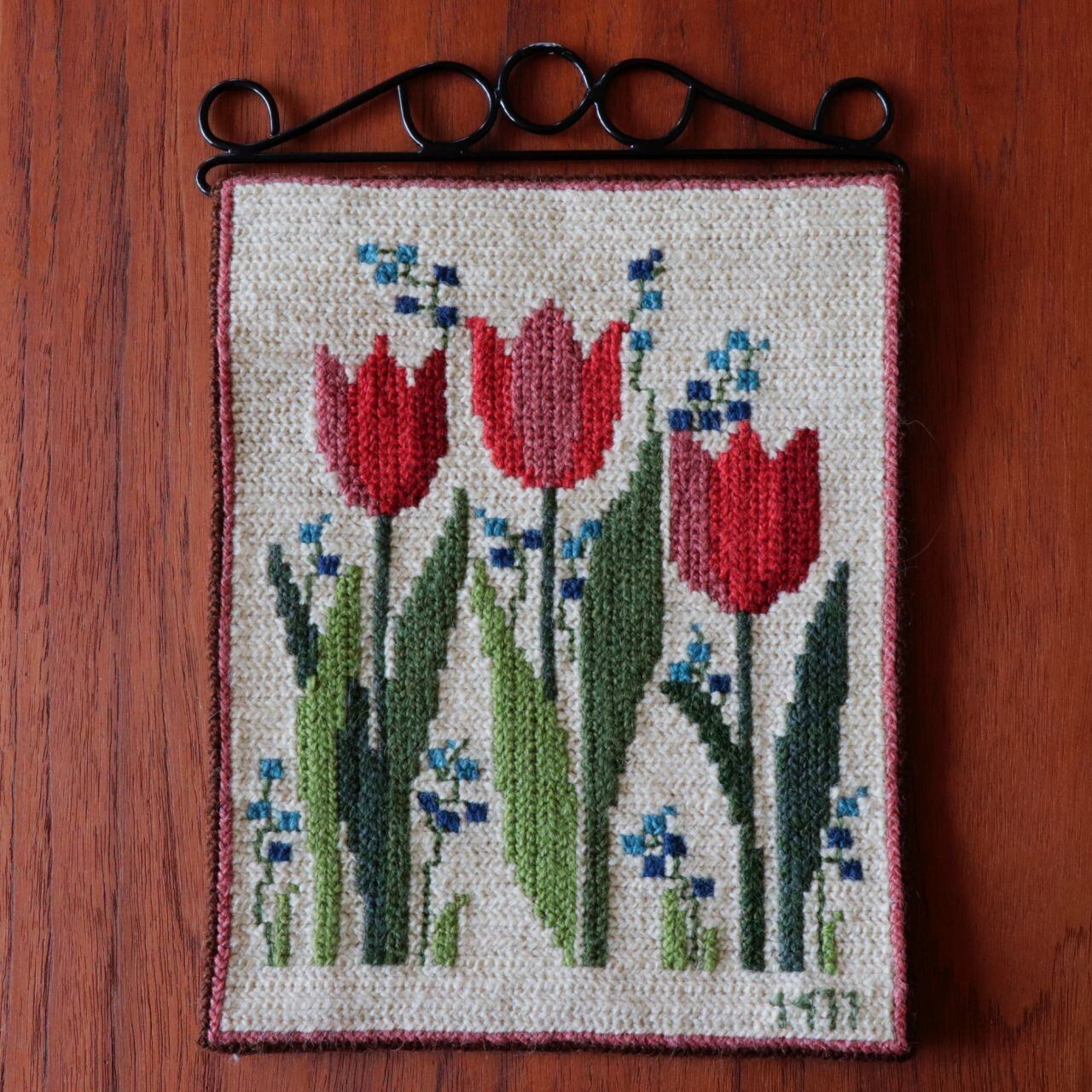 1970年代頃、スウェーデンで製作された手刺繡のタペストリー。レトロなチューリップが描かれており、壁掛けが出来るように上部には金具が付いています。