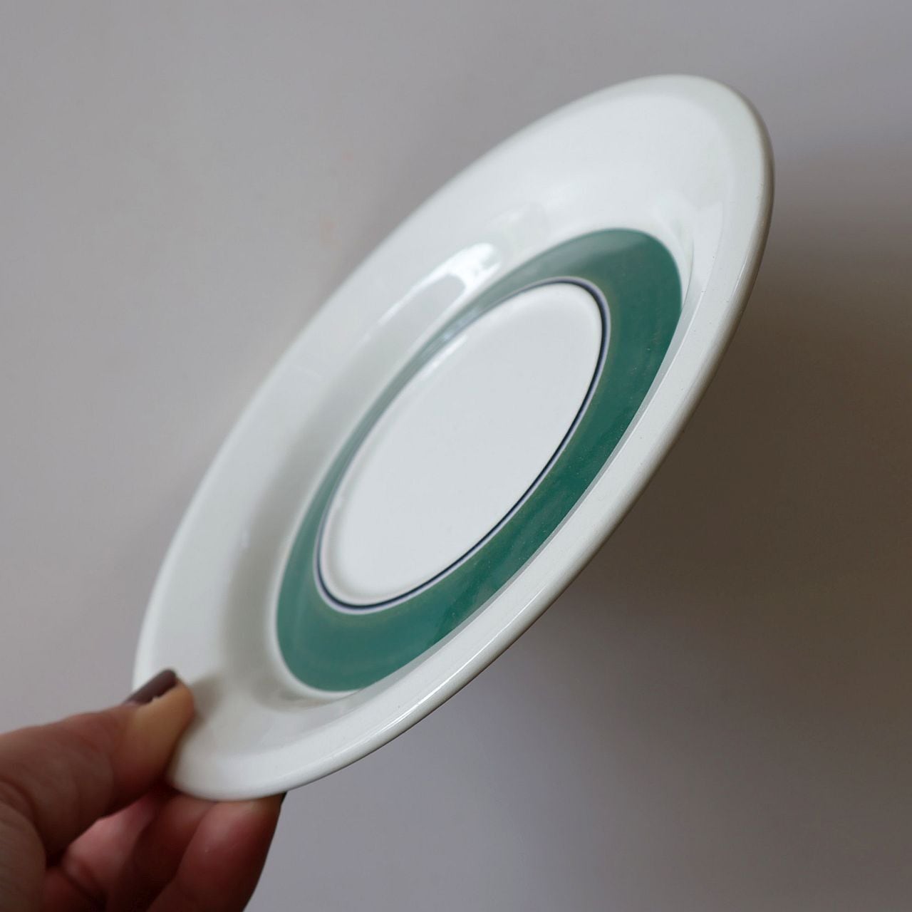 Kirsikka(=サクランボ)という名前の通り、鮮やかなサクランボが全面に描かれています。緑・黒・赤と象徴的な色で組み合わされた色彩で見た目にも楽しい作品です。Kirsikkaシリーズはその製作の手法により装飾部分がペイントロスが生まれやすく、食器洗いの際の摩耗などでダメージがおきやすい特徴があります。写真ではそのうち目立つ部分をピックアップして撮影しています。