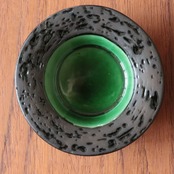 凹凸のある素朴な縁回しと、内側の鮮やかな釉薬とのコントラストが印象的で、存在感溢れるデザインです。