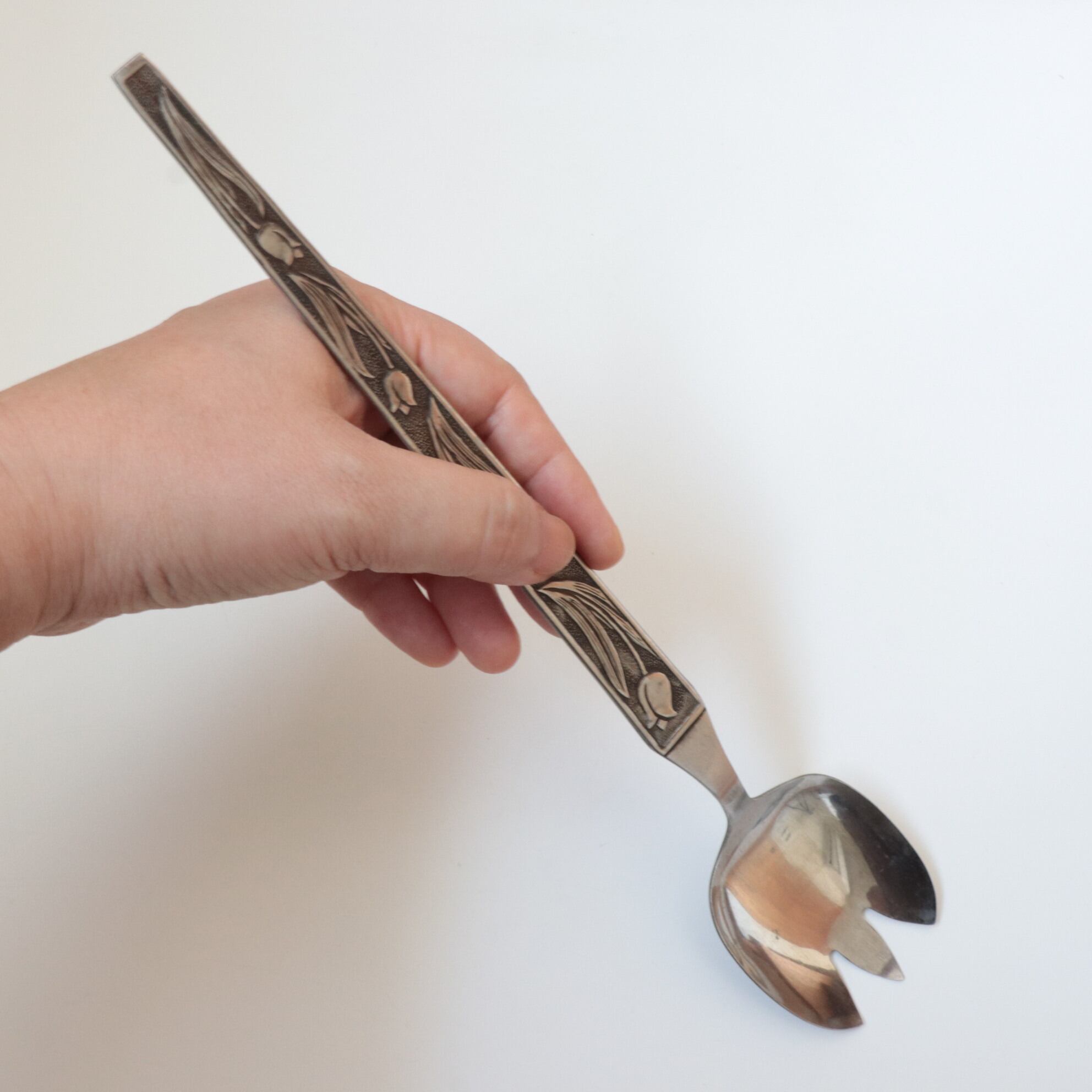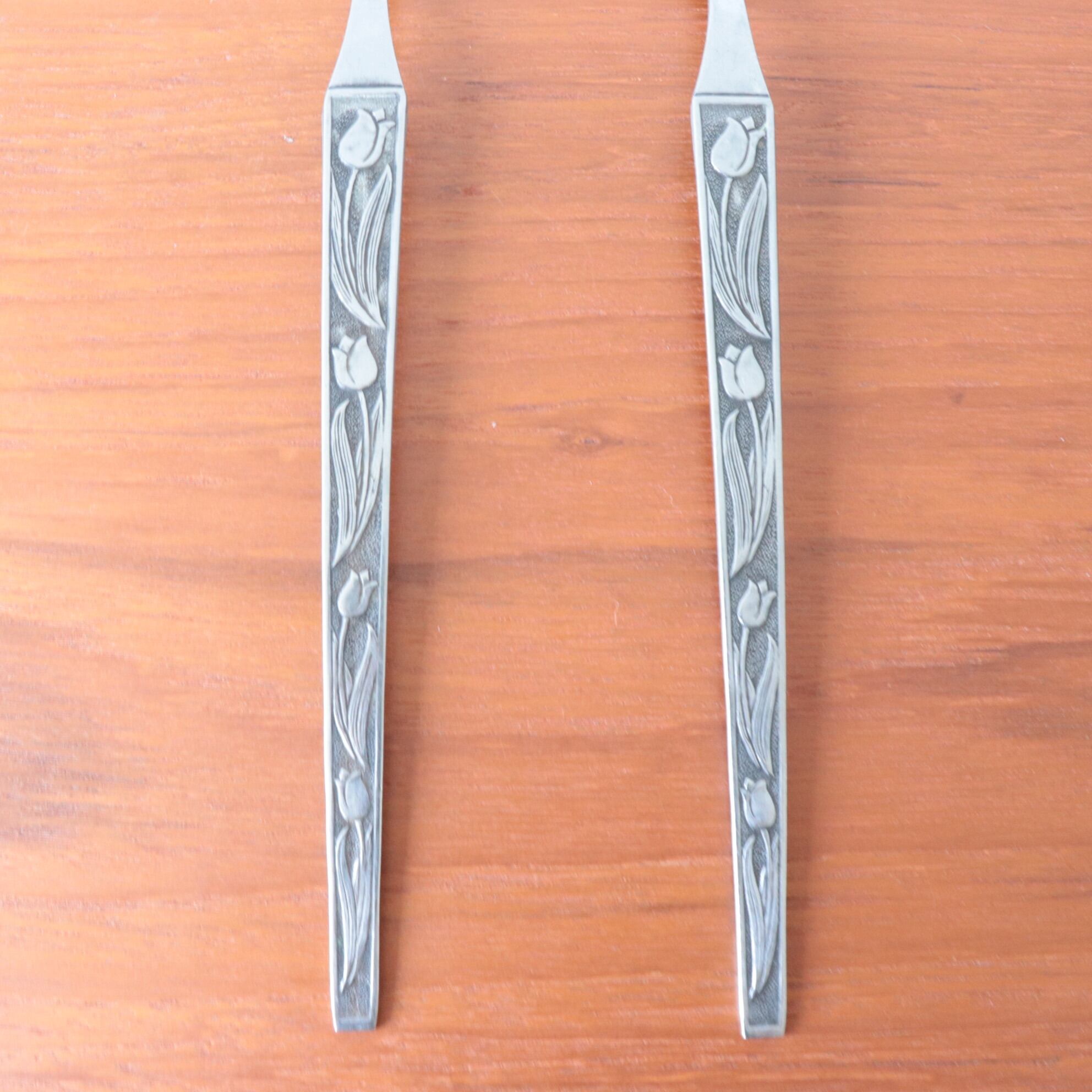 サラダの盛り付け用などに使うサービングセットで、25㎝ほどのサイズとなります。チューリップの絵柄が描かれており、レトロな雰囲気が可愛いお品です。素材はステンレスとなります。