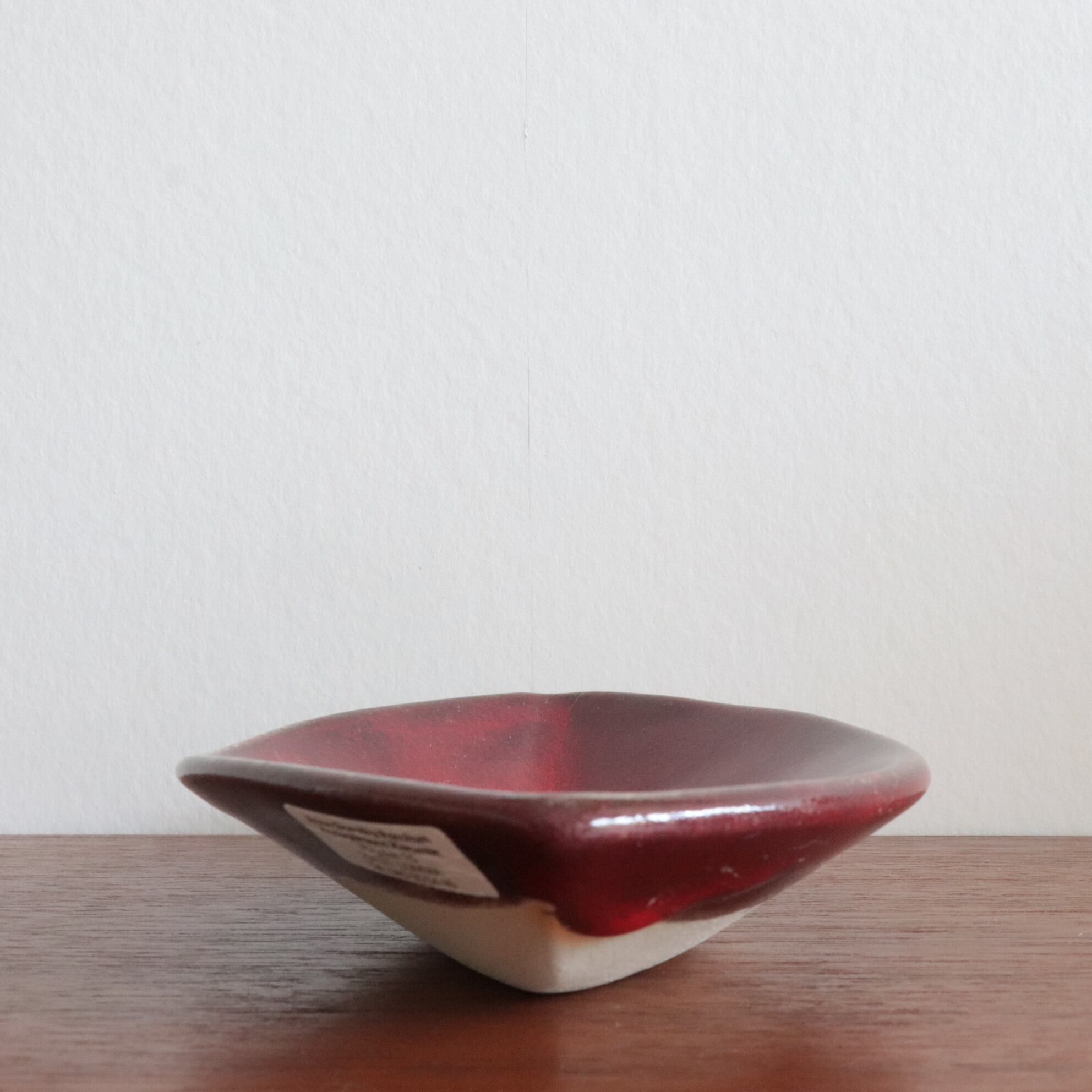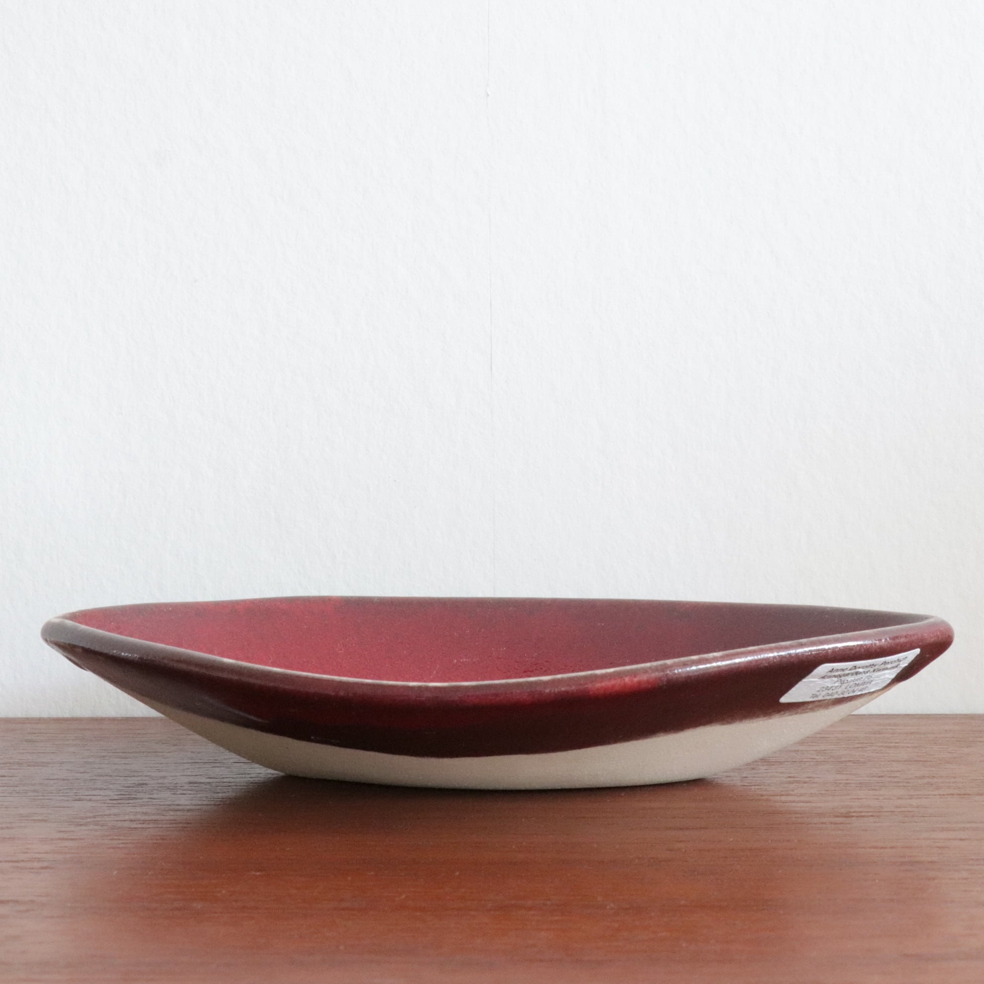 深紅の釉薬を流すように使用されており、まだらな模様が造形の美しさを際立たせます。現地の小規模な工房で、世界的に名前が知られるデザイナーではありませんが、独特の存在感を示す作品です。