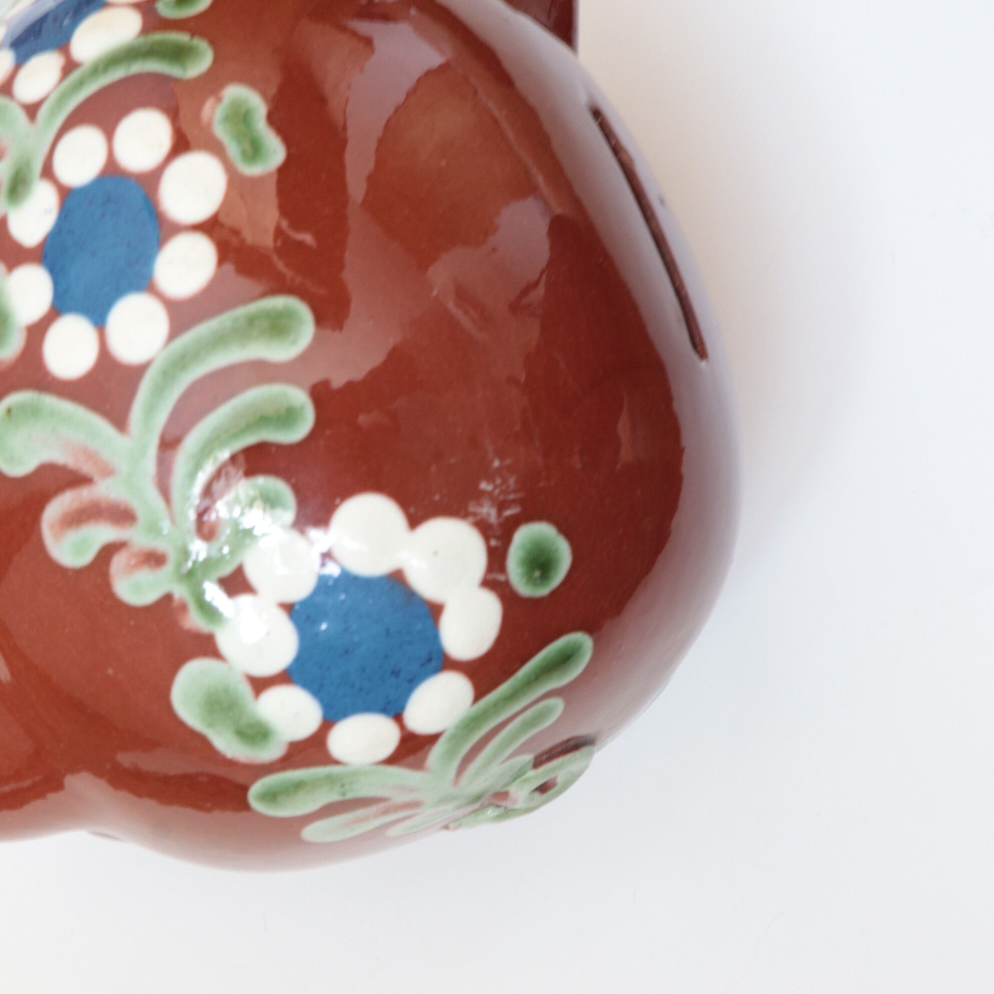 同社はレトロな花柄の装飾を得意としており、特にこうした豚の貯金箱が人気となり数多く生産されています。時代によって少しずつ表情や鍵の様式が変わり、長く家庭に愛されてきたデザインです。