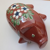 同社はレトロな花柄の装飾を得意としており、特にこうした豚の貯金箱が人気となり数多く生産されています。時代によって少しずつ表情や鍵の様式が変わり、長く家庭に愛されてきたデザインです。