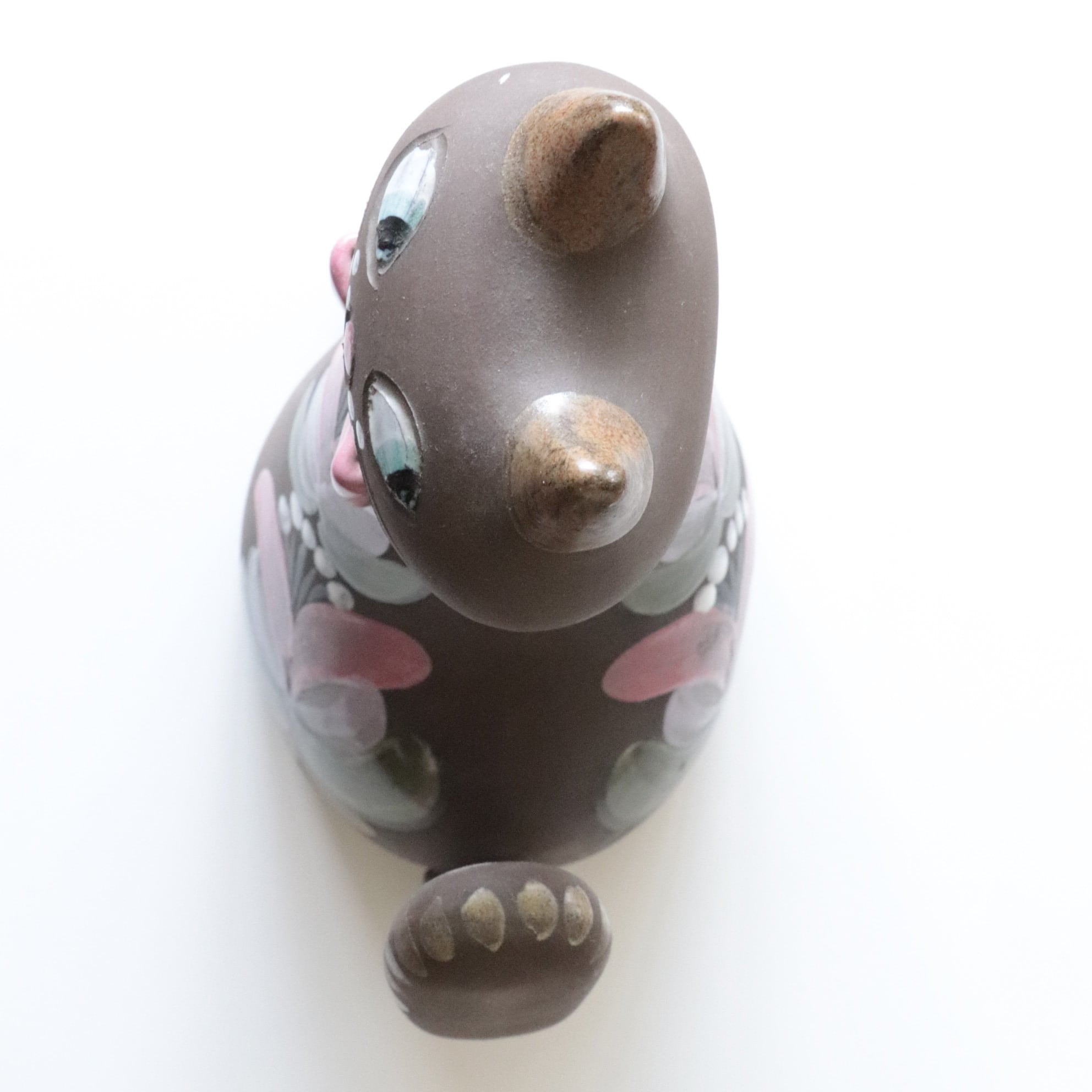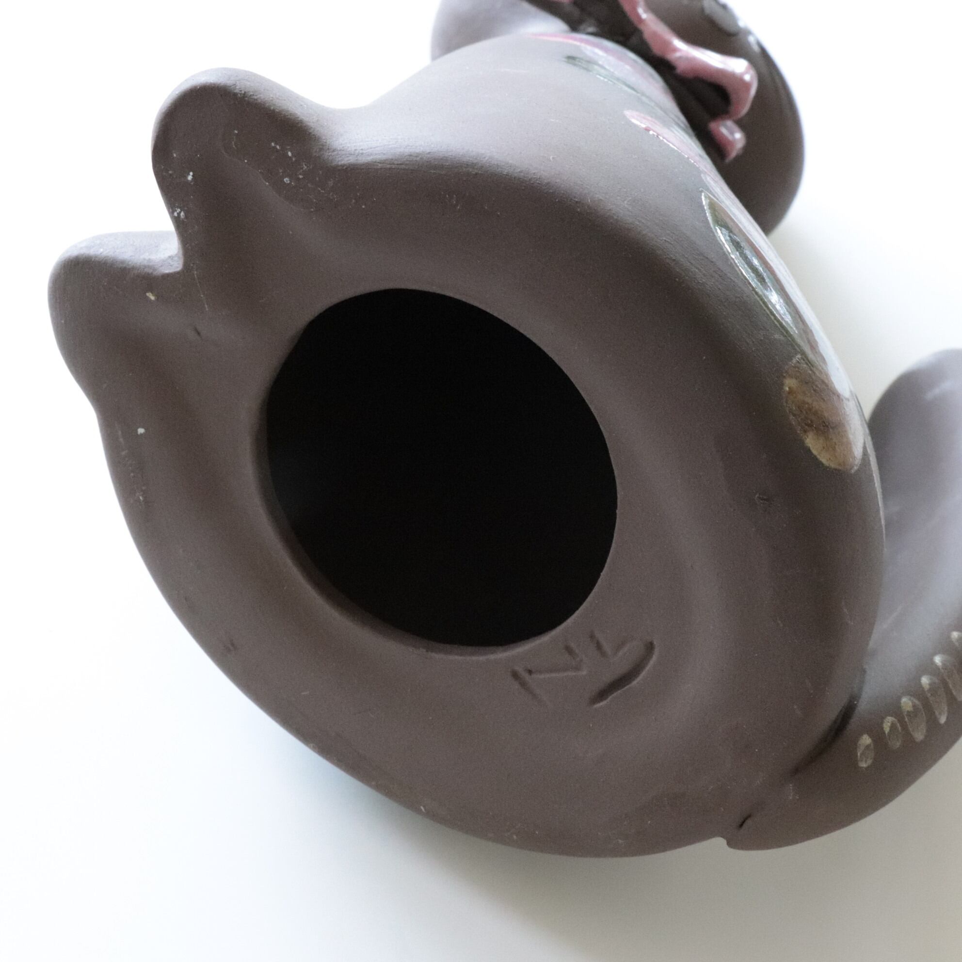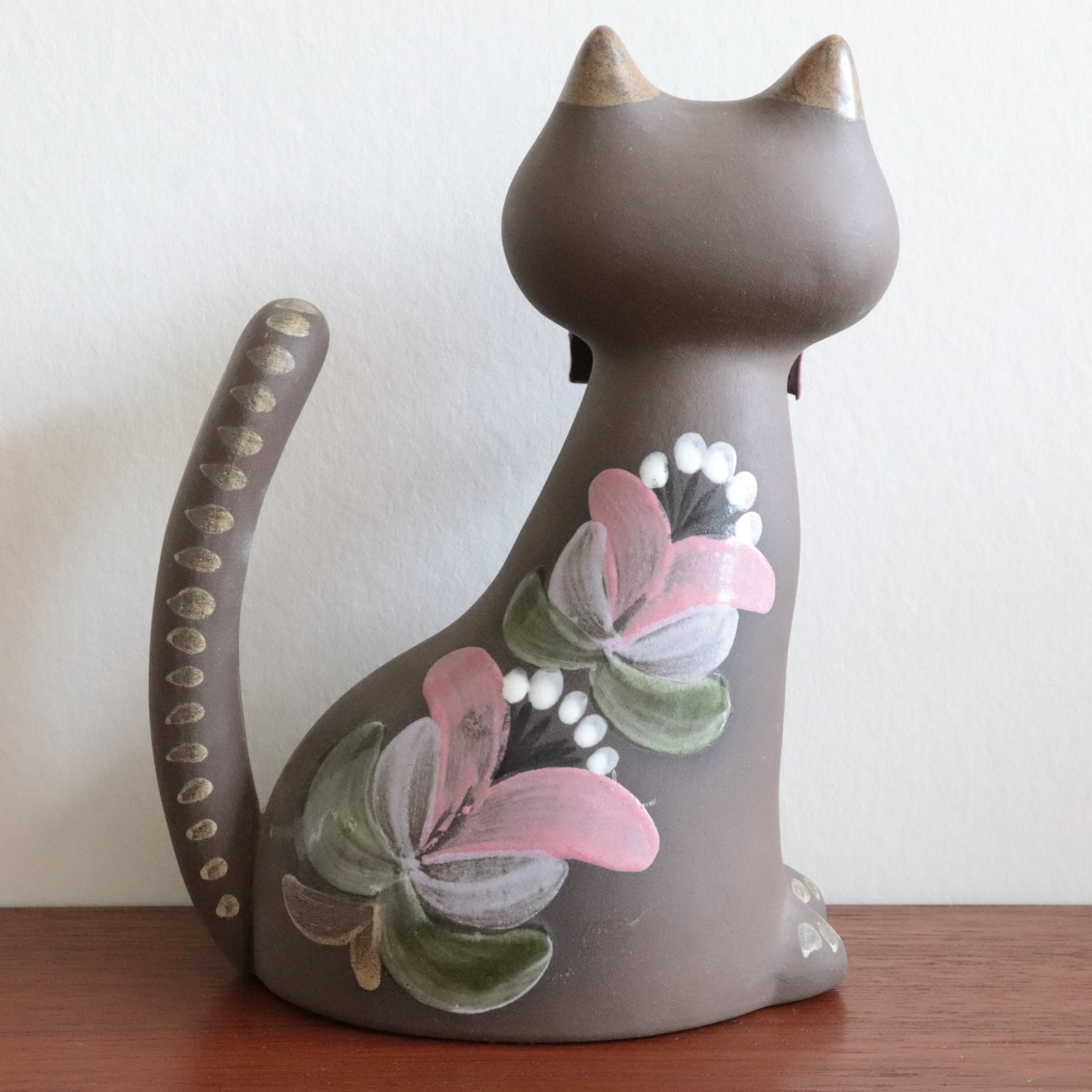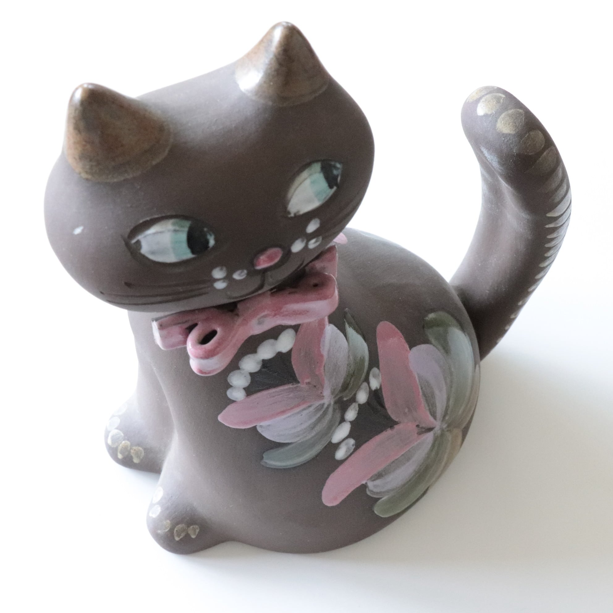 この猫のフィギュアは、素朴で土の風合いをそのまま感じられる素地が特徴で、手仕事の温かみがしっかりと表現されています。剽軽で愛らしい表情が魅力的で、見る人の心を和ませます。また、ミッドセンチュリーらしい自然をモチーフとした柄がフィギュアに彩りを添え、時代を感じさせるデザイン性が際立っています。