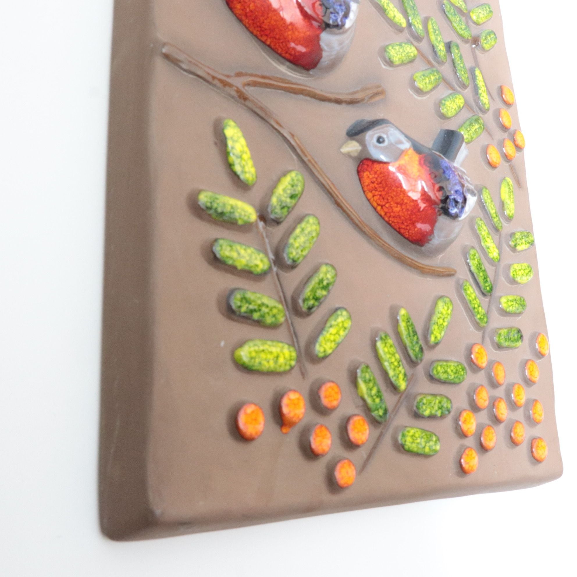 ウソ(Bullfinch)とナナカマドが描かれた作品で、ナナカマドの赤い実の鮮やかな色彩が、陶板全体を生き生きとさせており、見る人に自然の暖かさを感じさせます。また、立体感を強調する造形技法が使われており、小鳥たちがまるで飛び出してくるような動きを生み出しています。