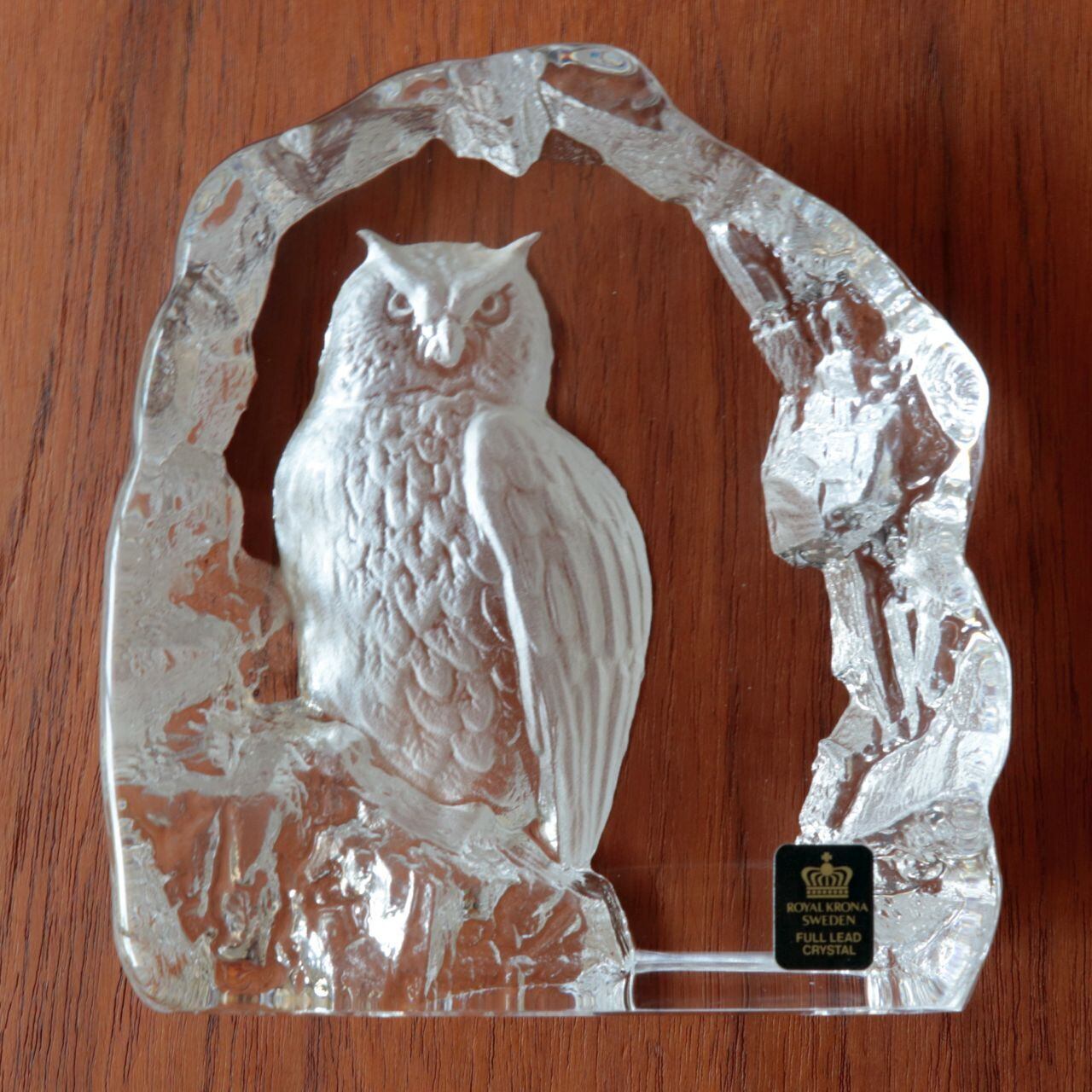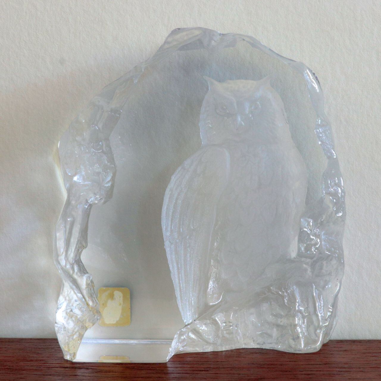マッツ・ヨナソンは比較的大柄な作品を得意としており、こちらも重量感のあるクリスタルに写実的なフクロウ(ミミズク)がサンドブラストで製作されています。