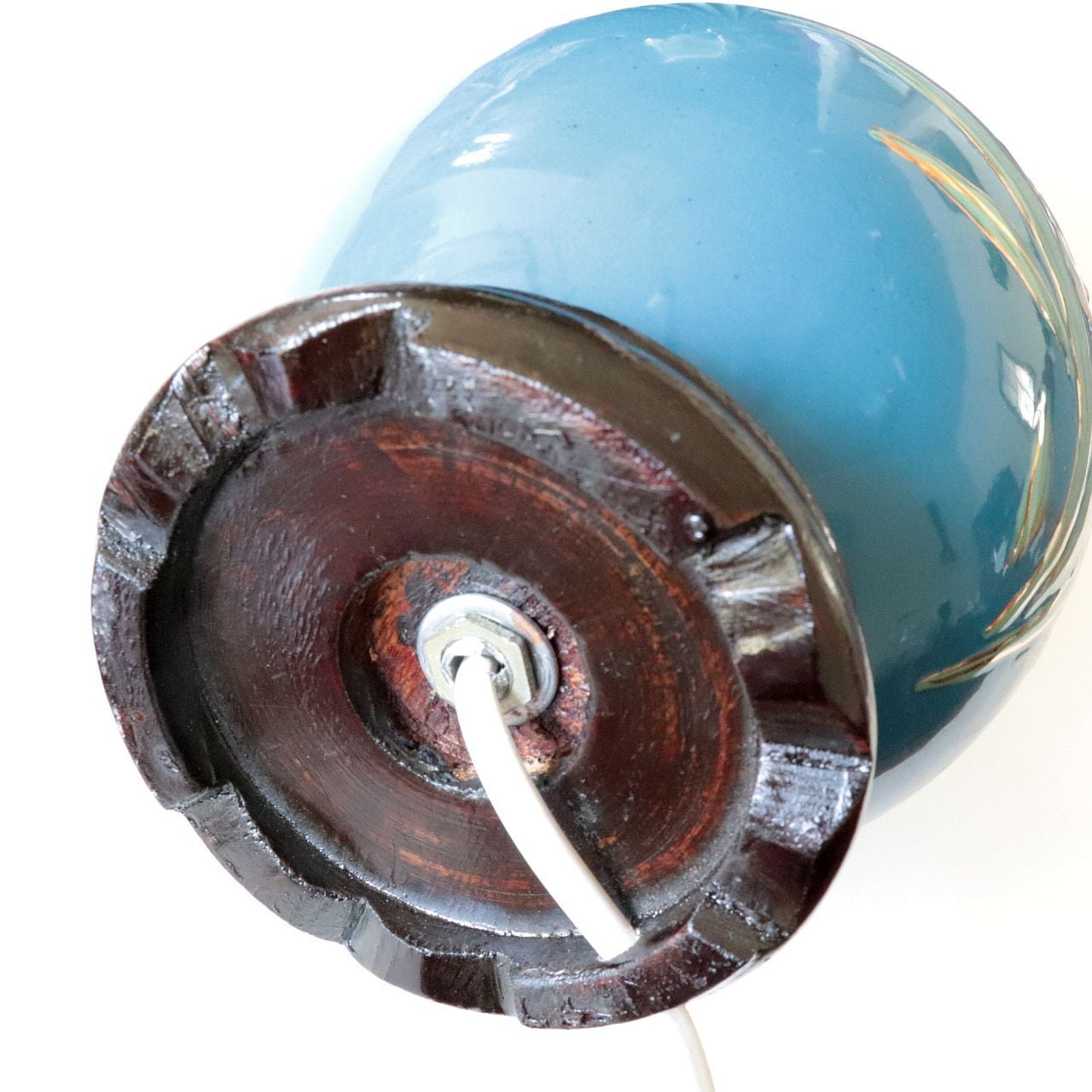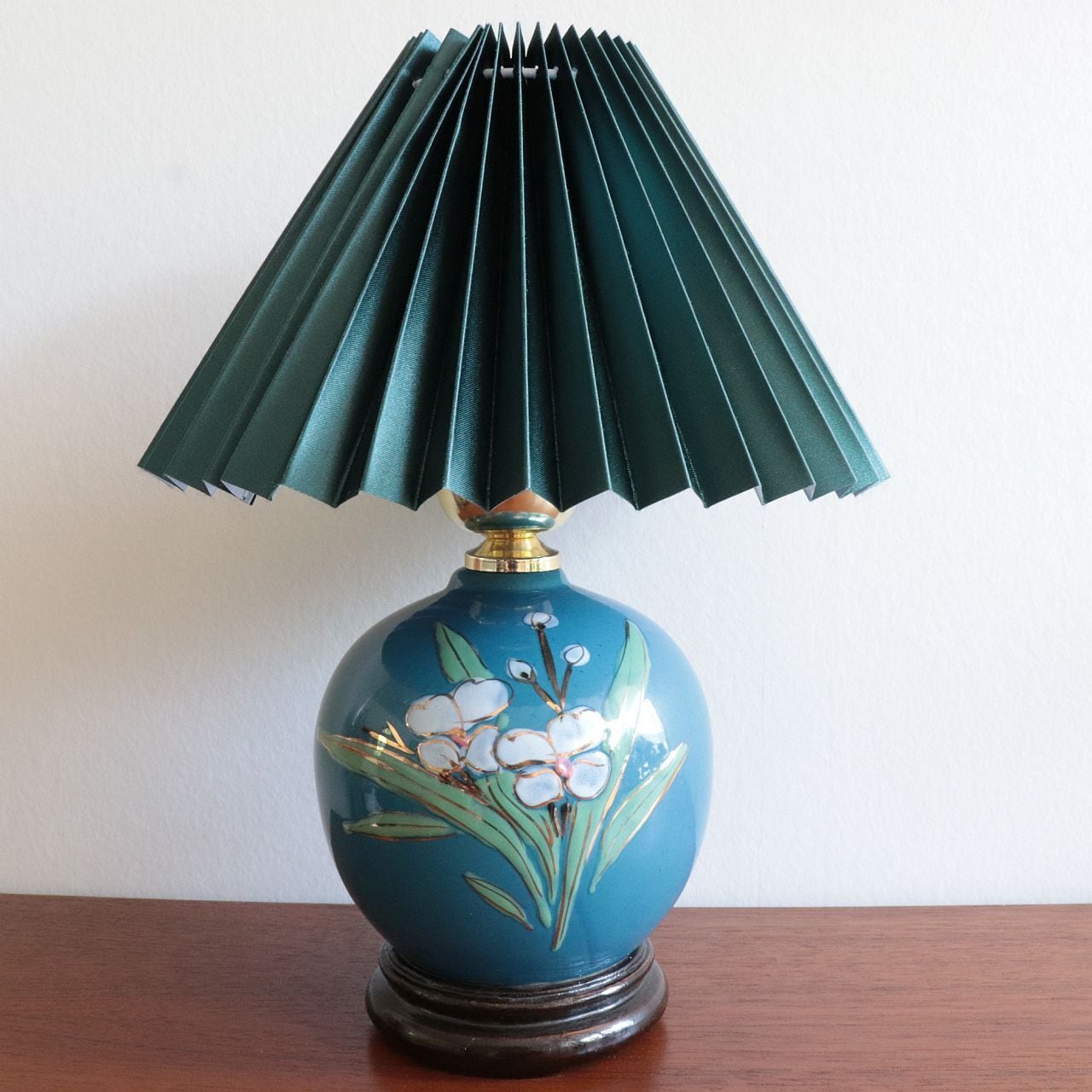 1960-70年代スウェーデン製のヴィンテージテーブルランプ。艶やかな青い釉薬に白い花が上品に描かれています。花の縁取りに金彩が施されており、照明をつけると光を反射し、より鮮やかに空間を彩ります。