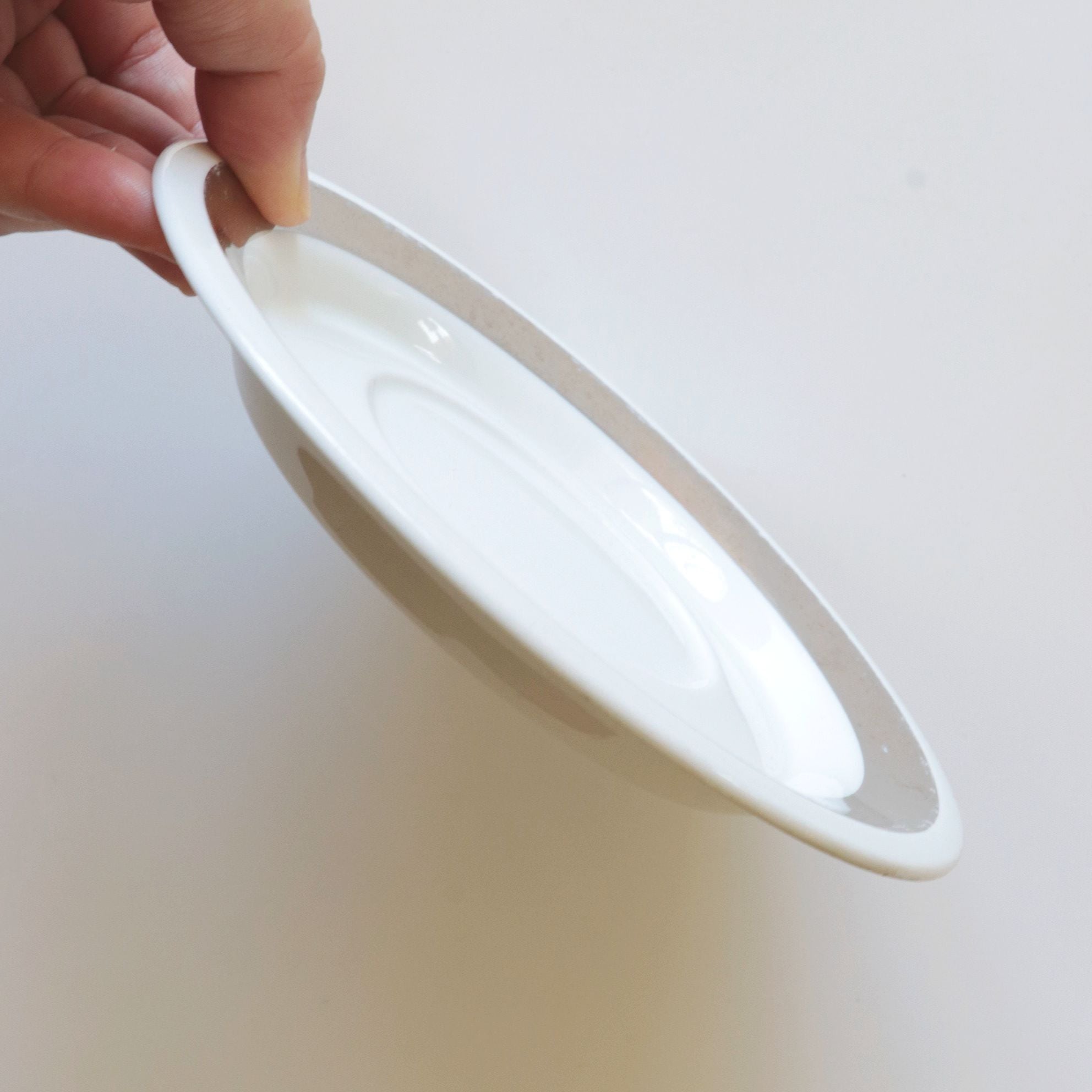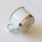 透明感のある白にシルバー(プラチナ)のライン、というシンプルかつ特徴的なデザインで仕上げられています。シルバーのラインは光沢感があり、周辺の色を拾い豊かな表情を見せてくれます。数多くのデザインを手がけたアラビア社の中でも珍しい作品の一つです。