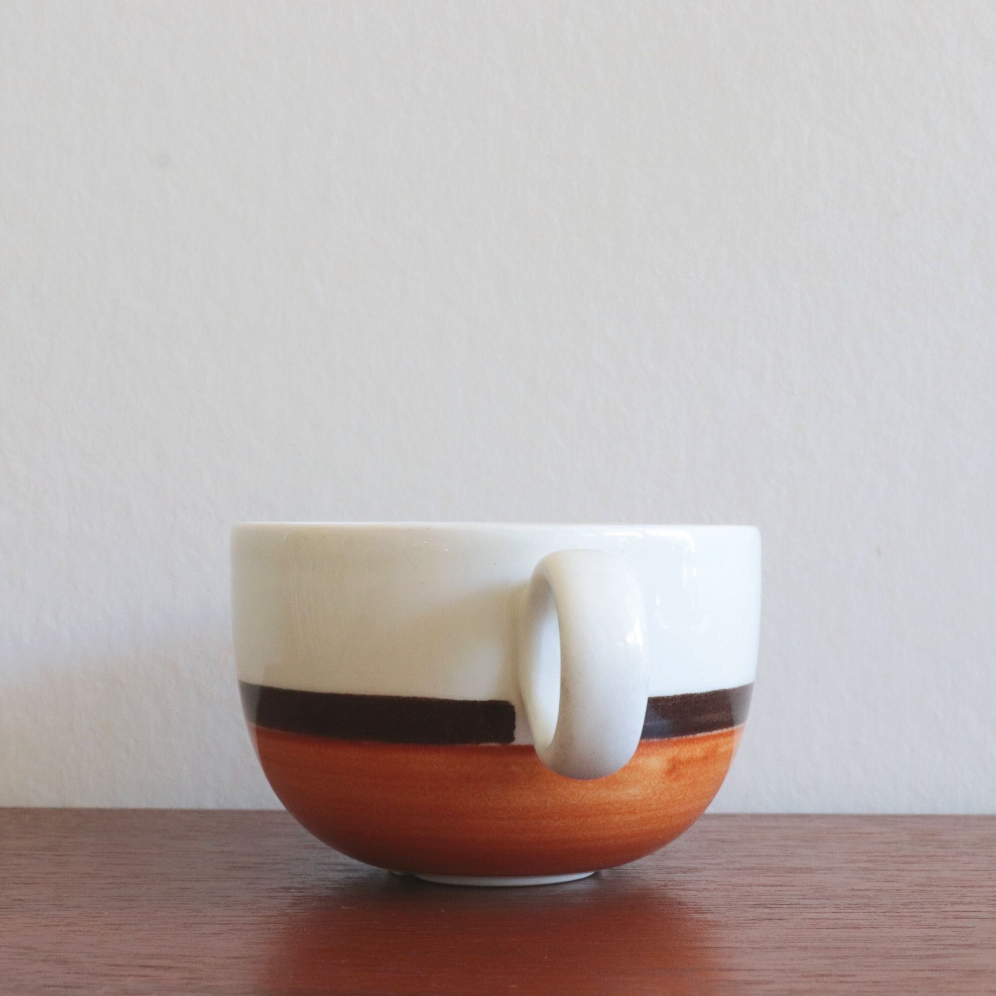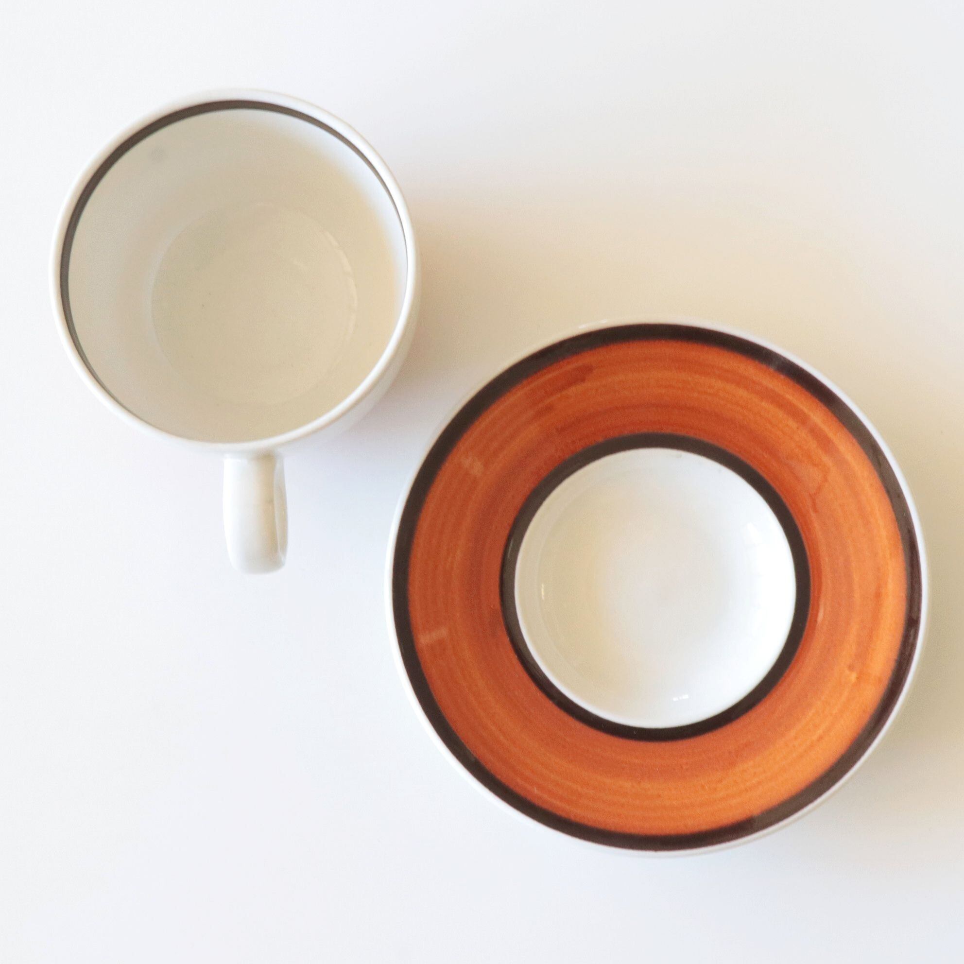 アリーナはホワイト・ブラウン・オレンジの3色で構成されたシリーズで、フォルムは「円形」をベースに設計されています。2サイズのカップ&ソーサー、3種類のプレート、ボウル、2つのポット、2つのソースパン、クリーマーから構成されています。