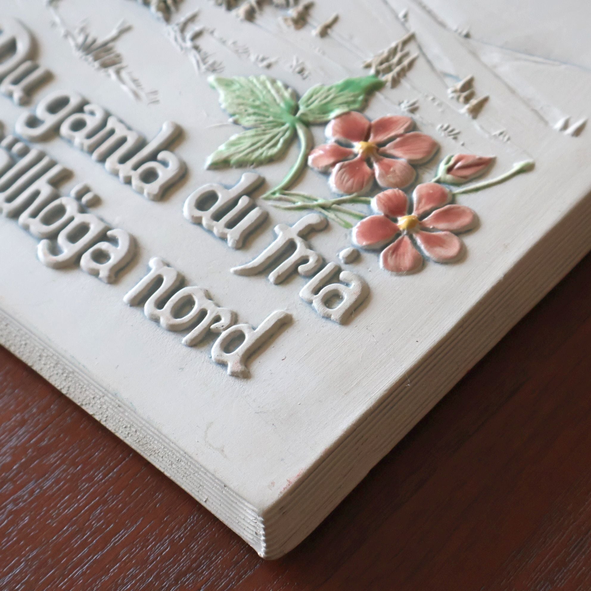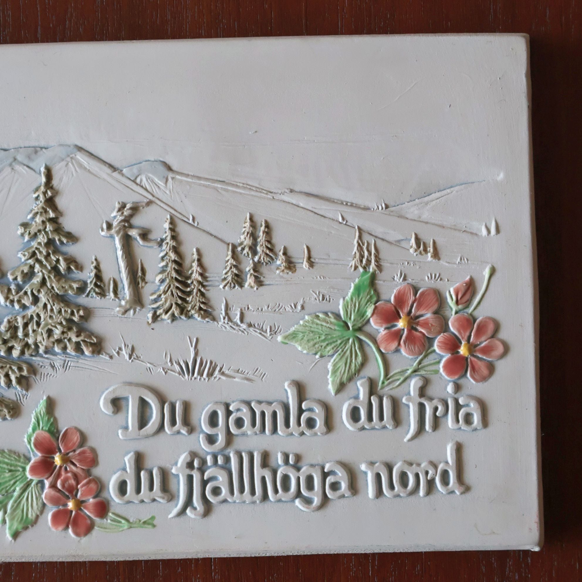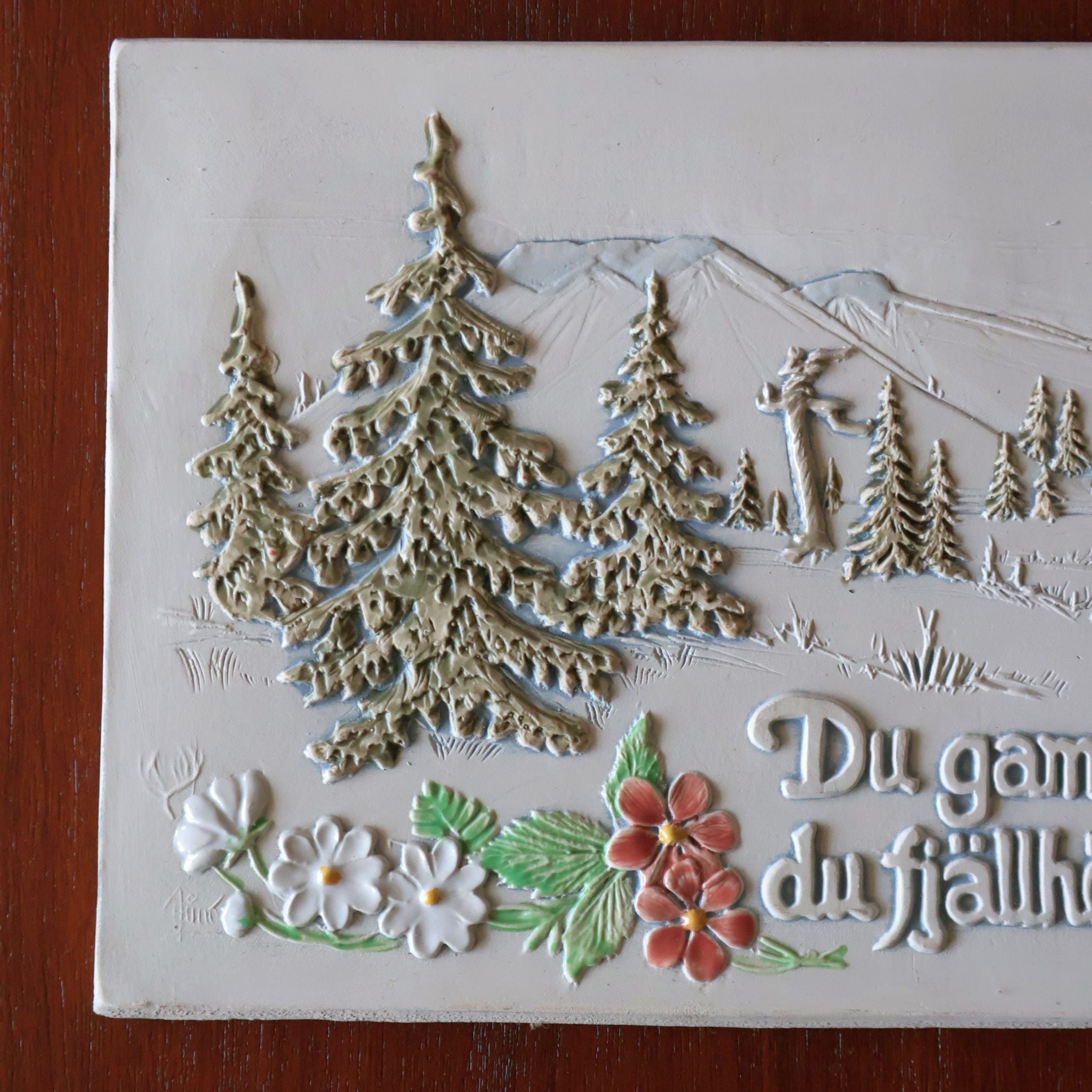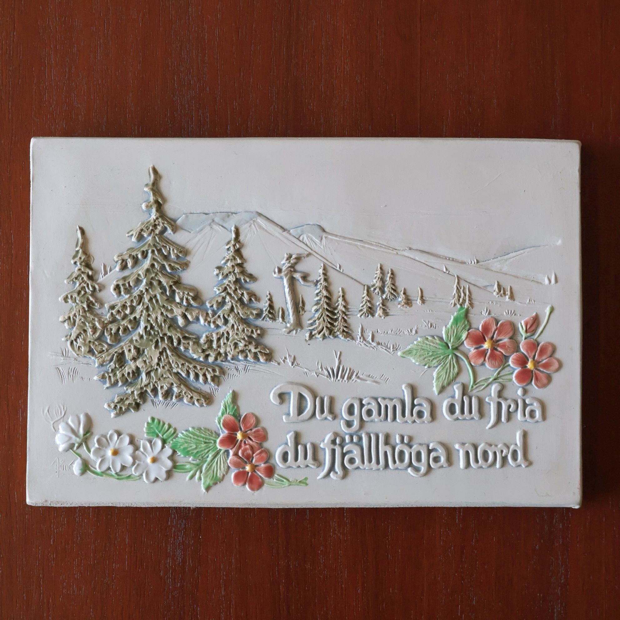 雄大な山脈と野花が描かれたこの作品には「Du gamla, du fria, du fjällhöga Nord」とスウェーデン国歌「古き自由な北の国」の出だしが書かれています。スウェーデンの自然を称えた文章で、それにふさわしい風景とともに北欧らしい印象を受ける作品です。
