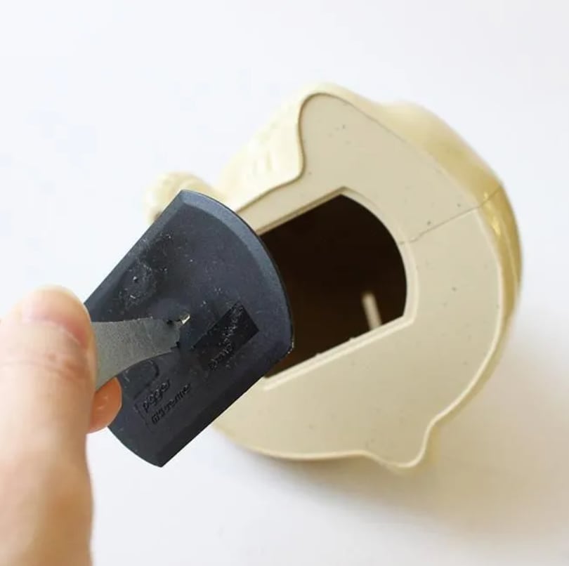 C型の鍵を鍵穴に差し込んて90度回転させ、ひっぱると蓋が外れます。白くま貯金箱はもともとフィンランドのNordea Bankのノベルティとして永く用いられ、貯めたお小遣いを貯金してもらおうと子供たちに贈られたそうです。