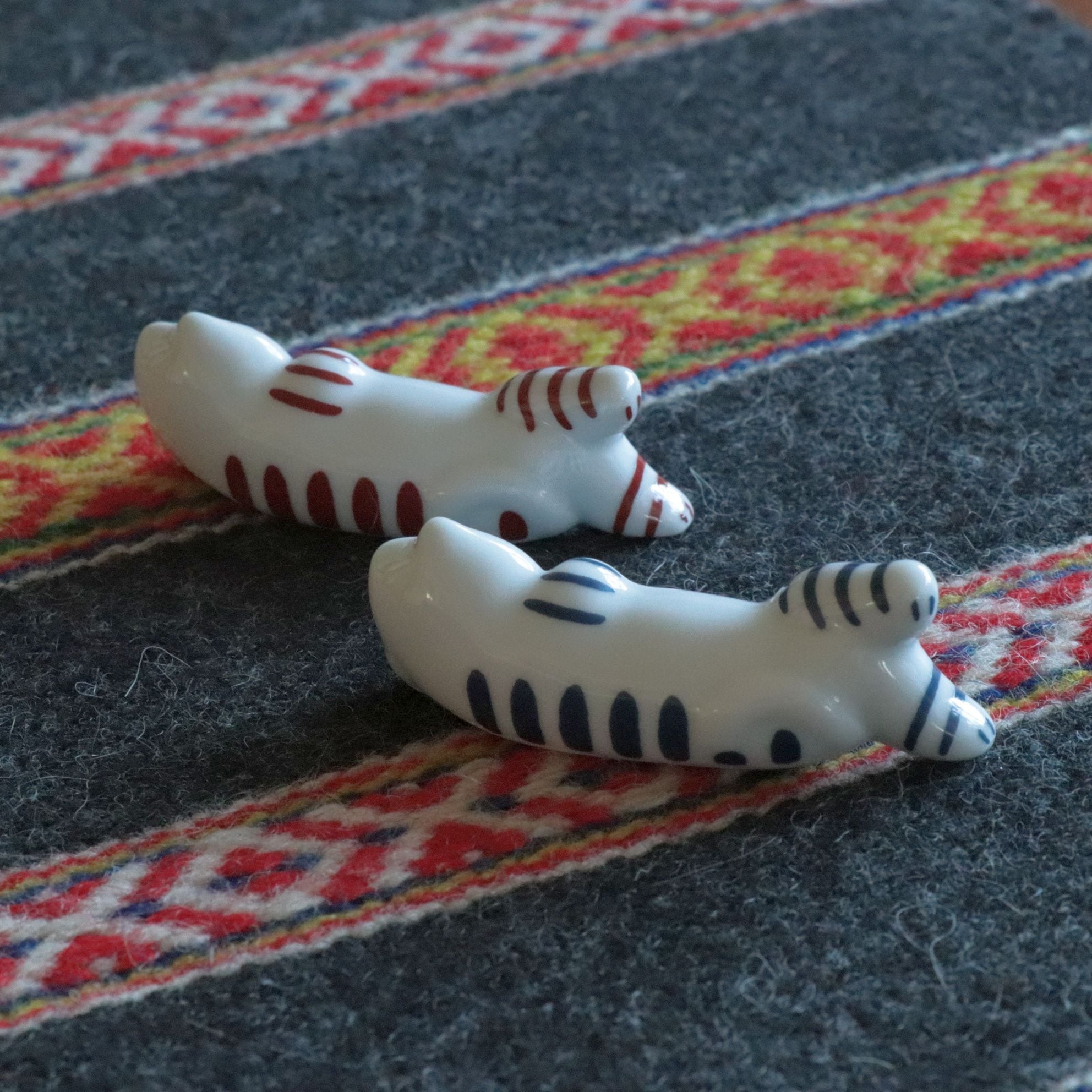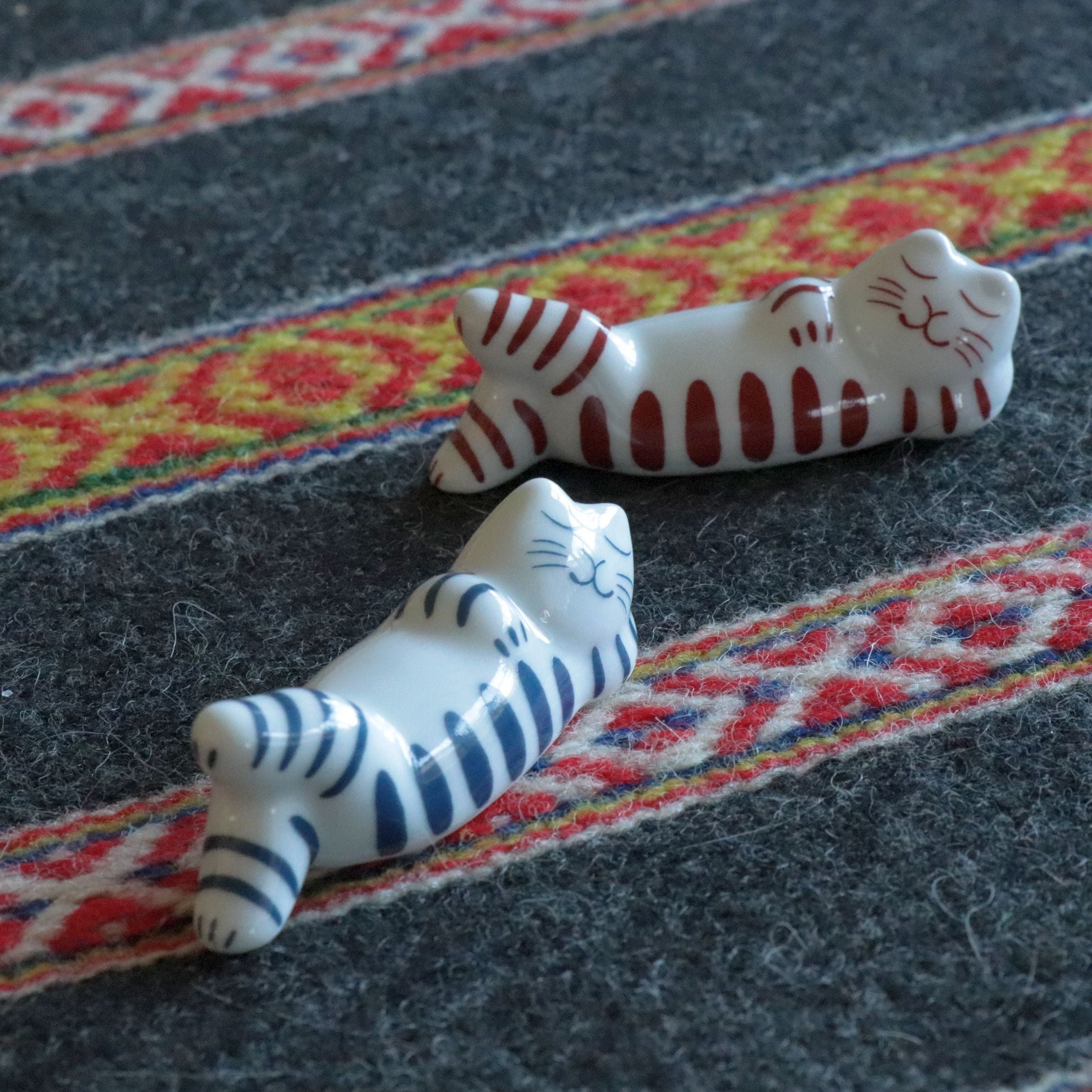 リサ・ラーソンのアイコン的存在「マイキー」をキャラクターに、波佐見焼で製作された「寝る猫」の箸置き。赤と青の2点セットです。