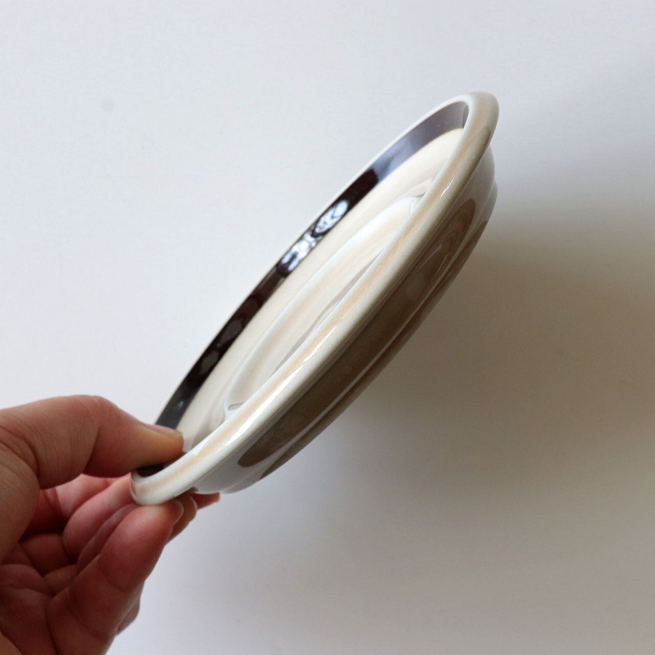 ベージュの落ち着いた素地に茶色の暖かみのある花/果実のようなデザインが手描きで描かれています。 カップ、ソーサーの2点セットとなります。