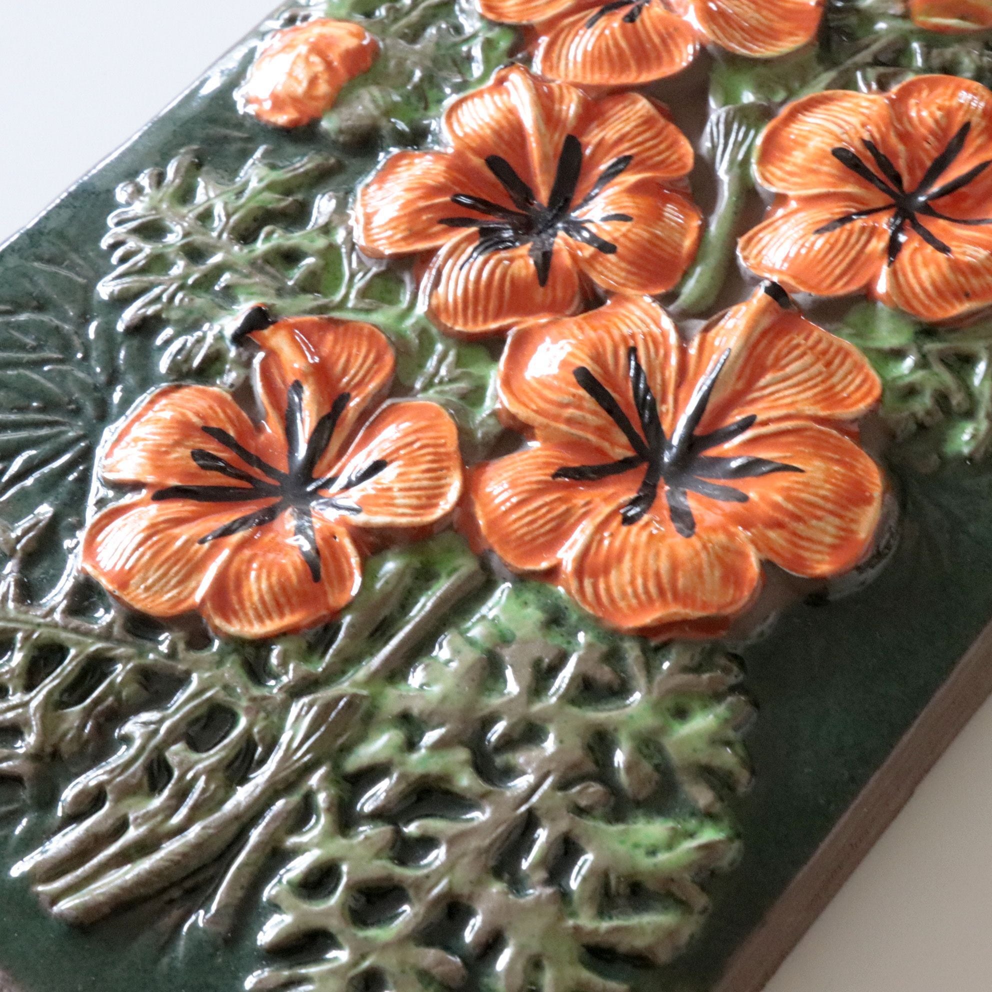 同社の代表的デザイナーAimo Nietosvuori による作品で、艶やかなオレンジ色の花が陶板全面に描かれています。背面には通し穴と針金が付いていますので、そのまま壁に飾ることも可能です。