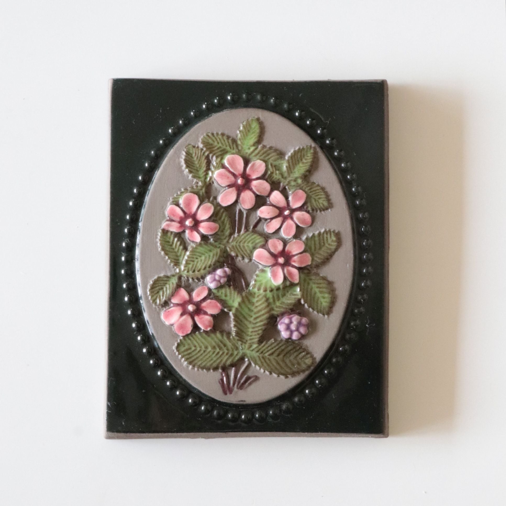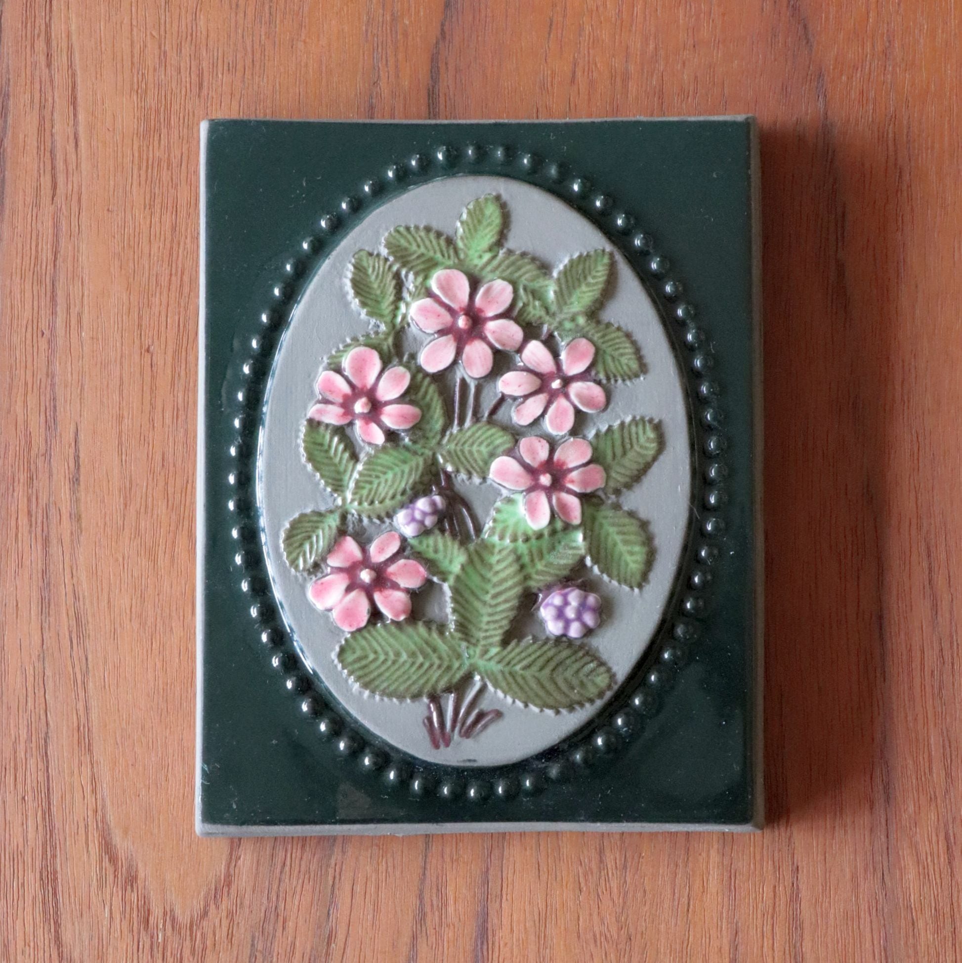 同社の代表的デザイナーAimo Nietosvuori による作品で、チシマイチゴの実と花が陶板全面に描かれています。背面には通し穴と針金が付いていますので、そのまま壁に飾ることも可能です。