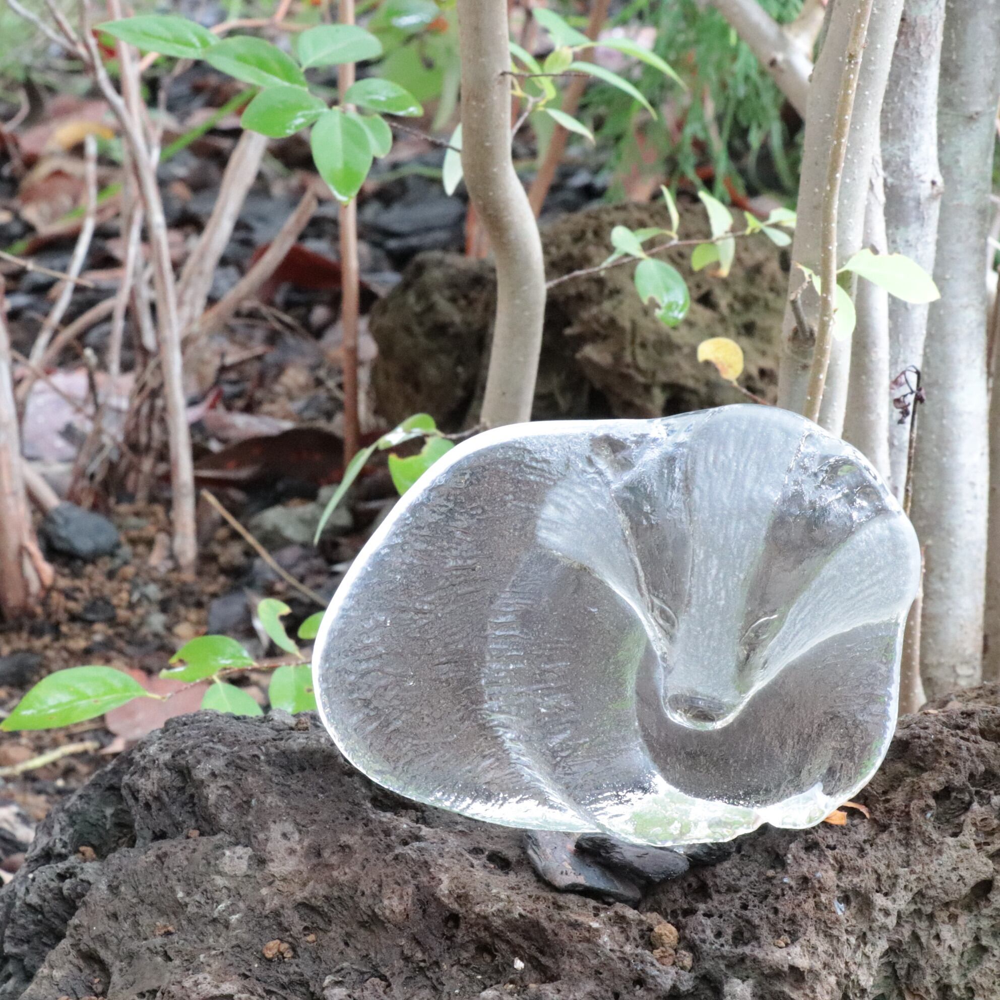 同社のガラスフィギュア作品は背面からの光を受けやすくするため、背面は平たく仕上がったいます。窓辺などに飾ると外光を受けとても存在感の増す作品です。