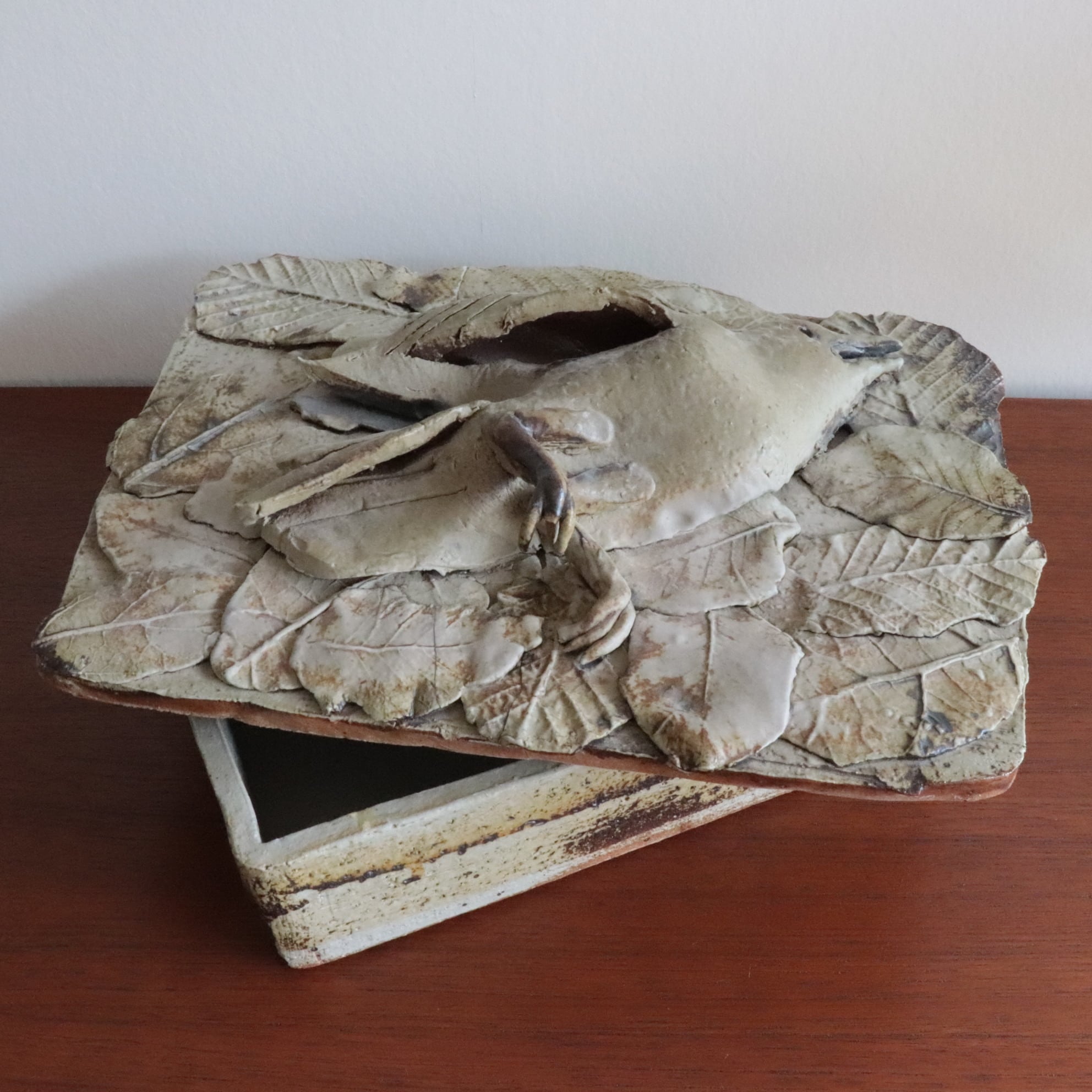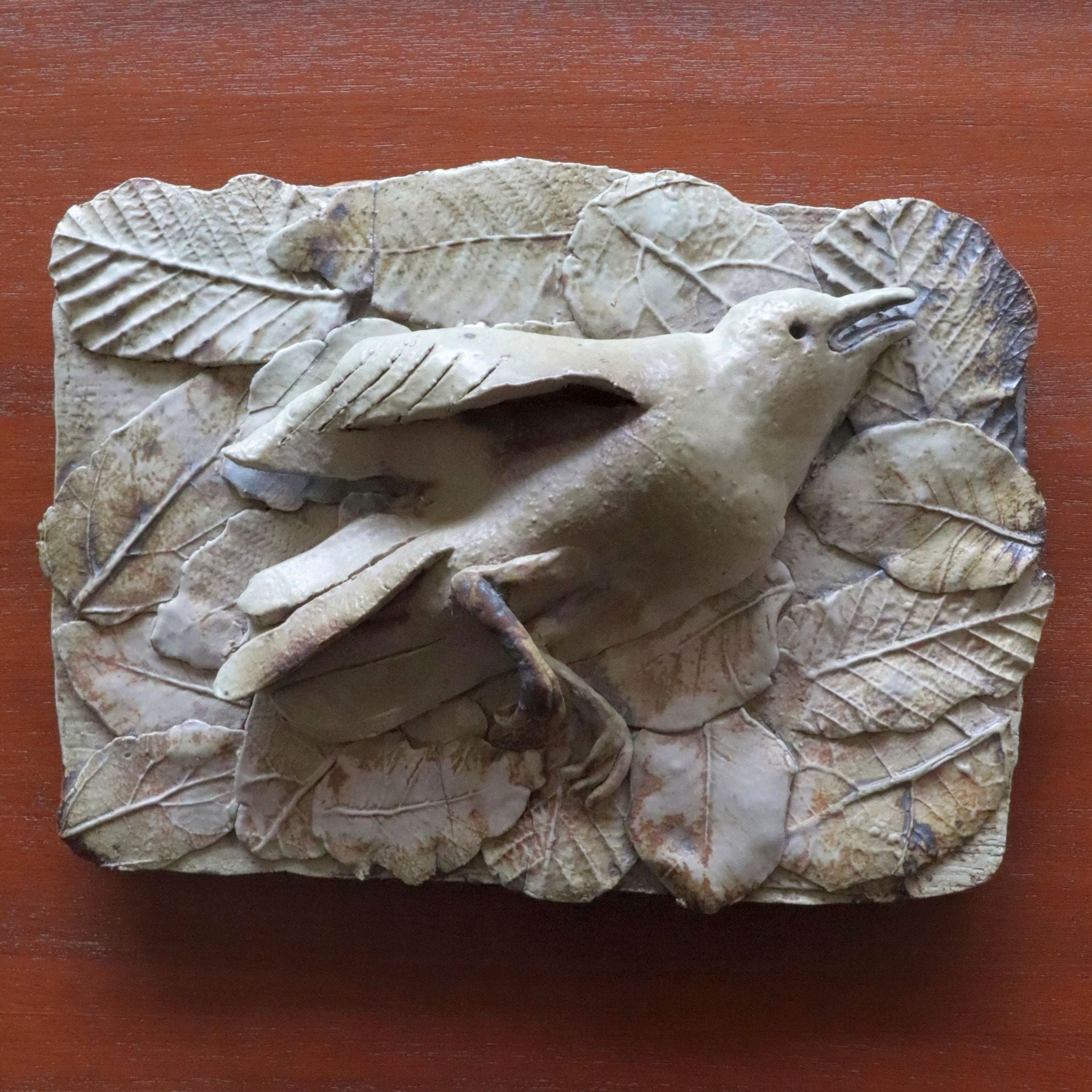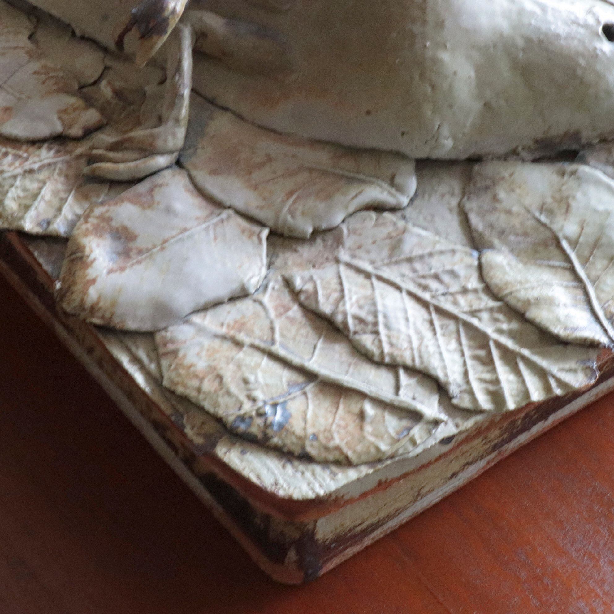 作品は上蓋(鳥と葉っぱをモチーフ)にしたものと箱との2つで構成されています。そのうち上蓋は①支えとなる陶板、その上の②上蓋の基礎となる陶板、そして③鳥と葉っぱから成り立っています。③「鳥」と「葉っぱ」はそれぞれ別に焼かれており、それを②に張り付け、その後①と組み合わせた造りです。