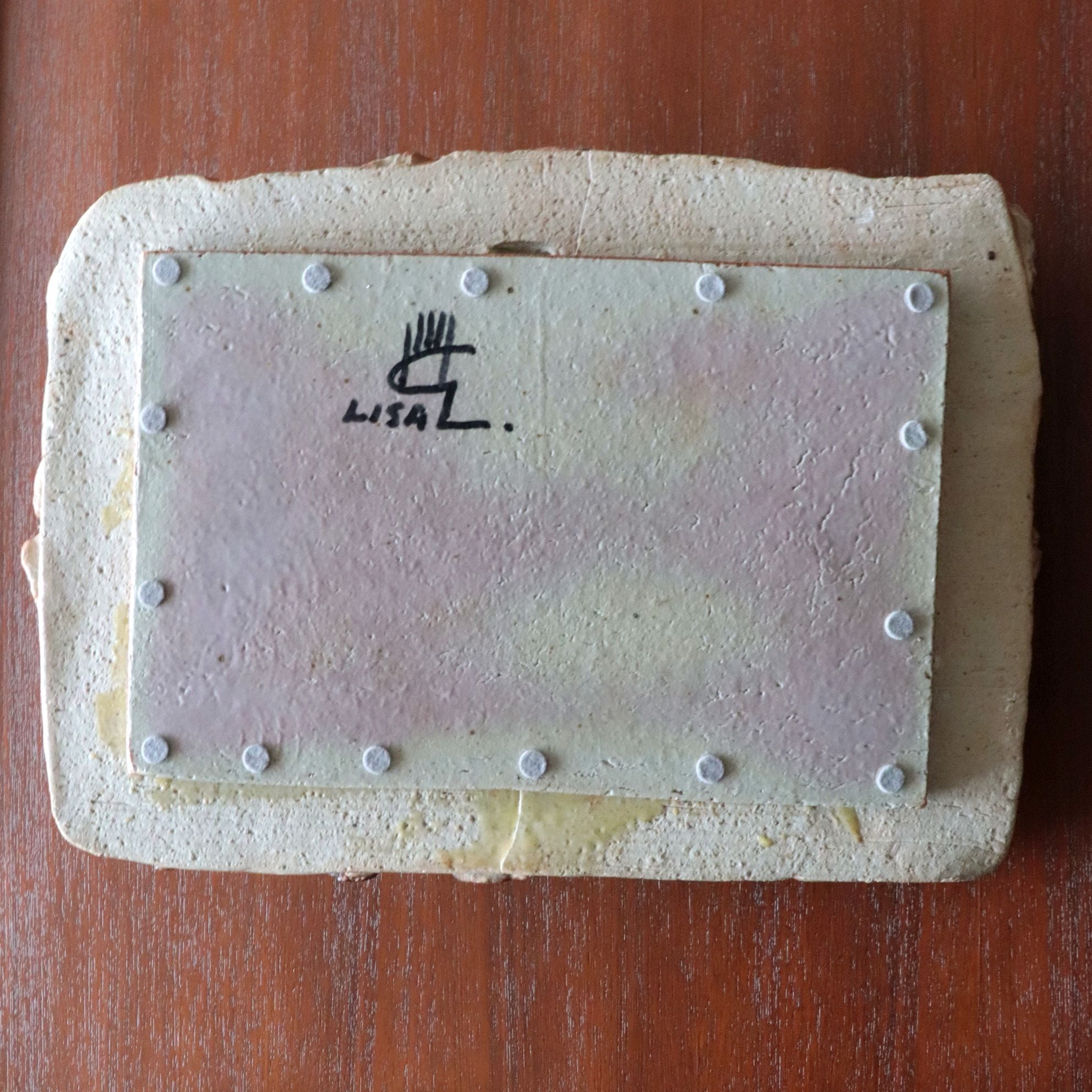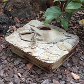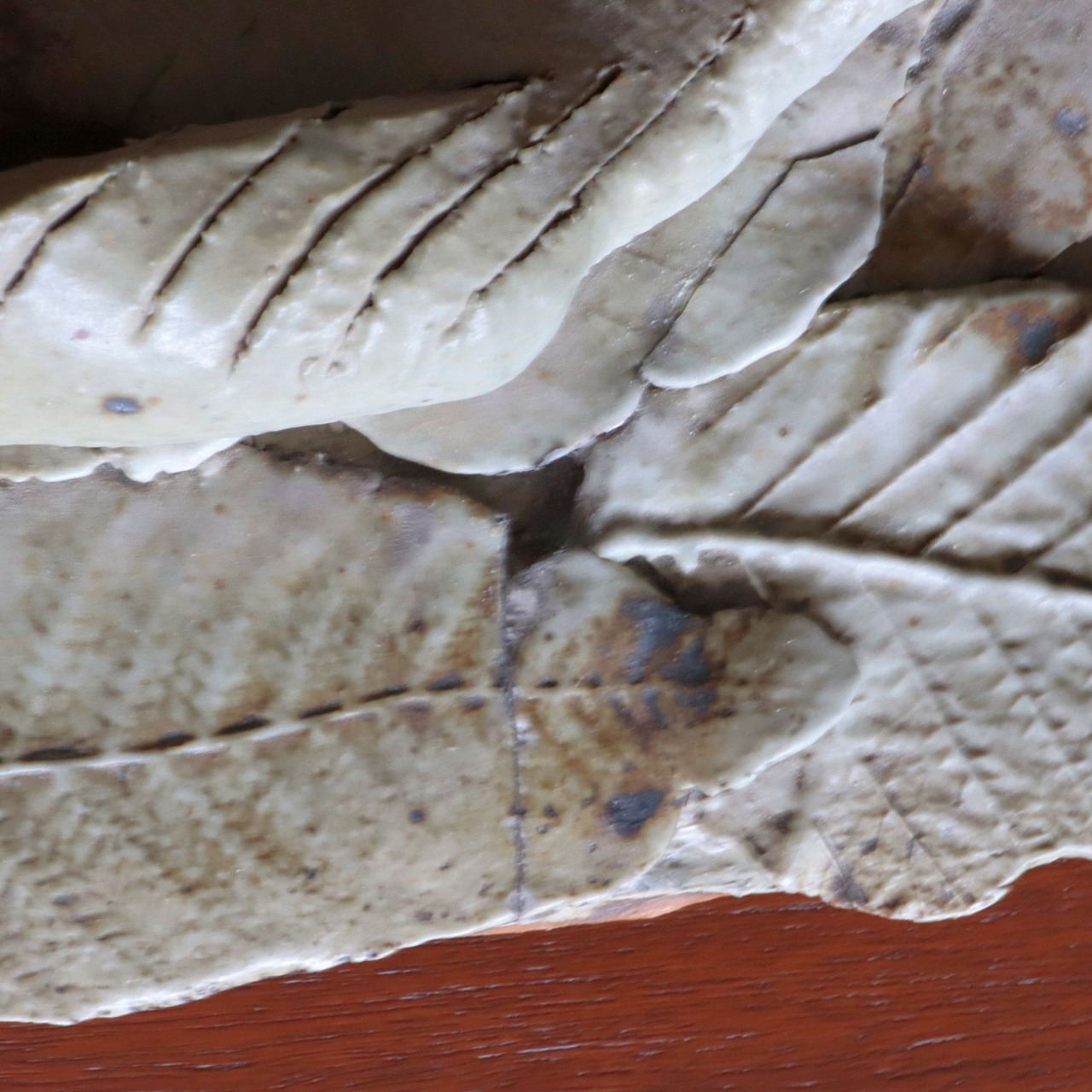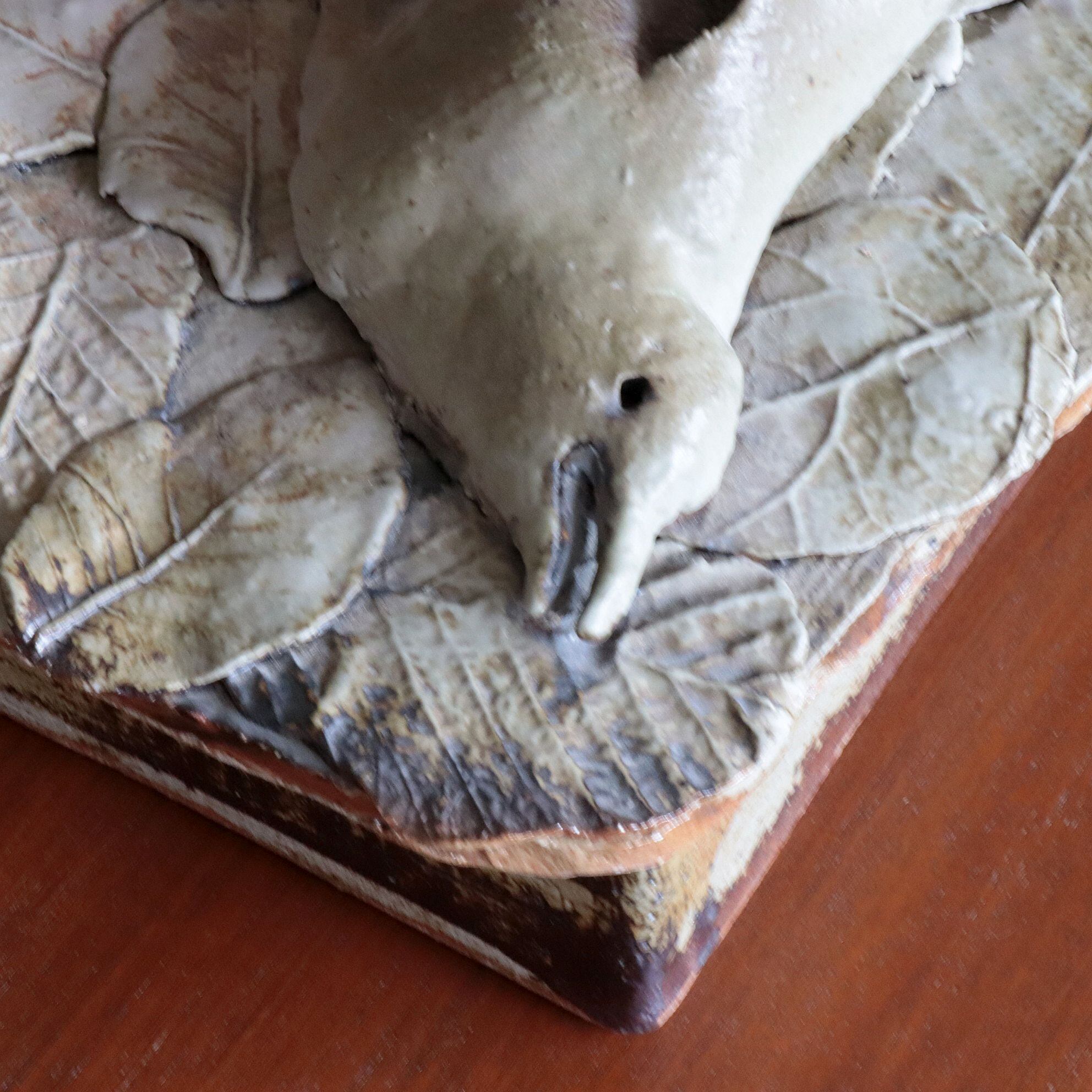 作品は上蓋(鳥と葉っぱをモチーフ)にしたものと箱との2つで構成されています。そのうち上蓋は①支えとなる陶板、その上の②上蓋の基礎となる陶板、そして③鳥と葉っぱから成り立っています。③「鳥」と「葉っぱ」はそれぞれ別に焼かれており、それを②に張り付け、その後①と組み合わせた造りです。