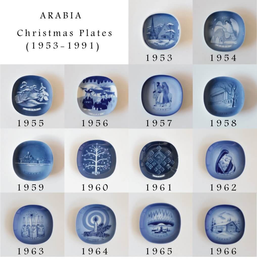 フィンランドのアラビアで製作されたクリスマスプレート。確認出来る範囲で、1953年から1991年まで製作が続いていたシリーズです。