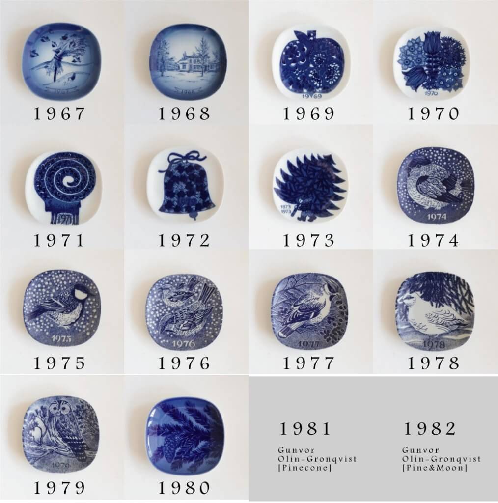 フィンランドのアラビアで製作されたクリスマスプレート。確認出来る範囲で、1953年から1991年まで製作が続いていたシリーズです。