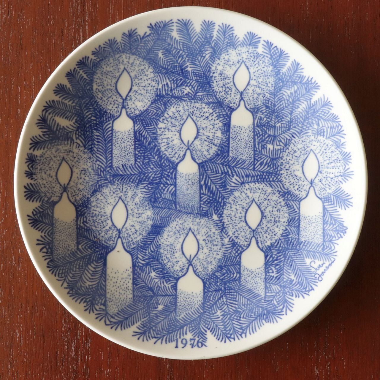 1976年はツリーの前に8本のろうそくが並ぶクリスマスらしいデザイン。光の輪も穏やかで、飾り映えのあるプレートです。