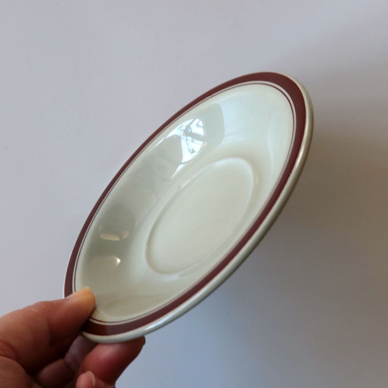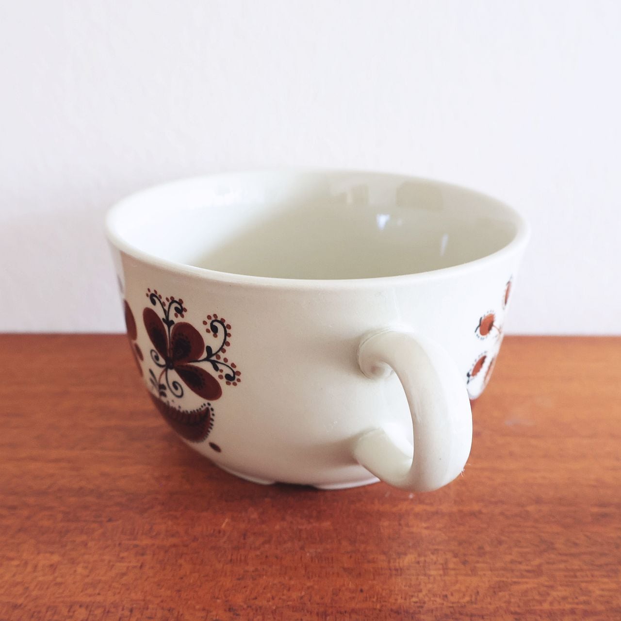 ほんの少しブラウンがかった地に茶色と黒でレトロで意匠的な花が全面に描かれています。単色ながらも豊かな表情で、同時代のFiggjoらしいレトロで味わいあるシリーズです。他の器とも馴染みやすく、空間にやさしい彩りを添えてくれる存在です。