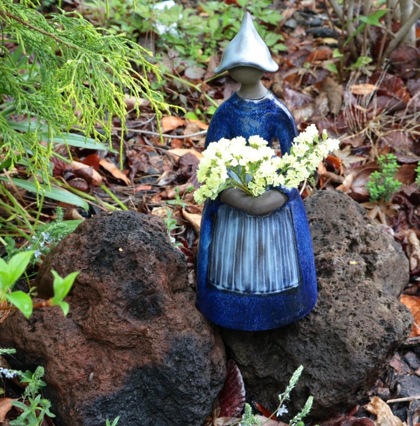 ドライフラワーベースになっており、花を挿すと女性が花を抱えたようなデザインとなるアイテムです。水を貯めることに不向きですので、生花はお勧めできません。