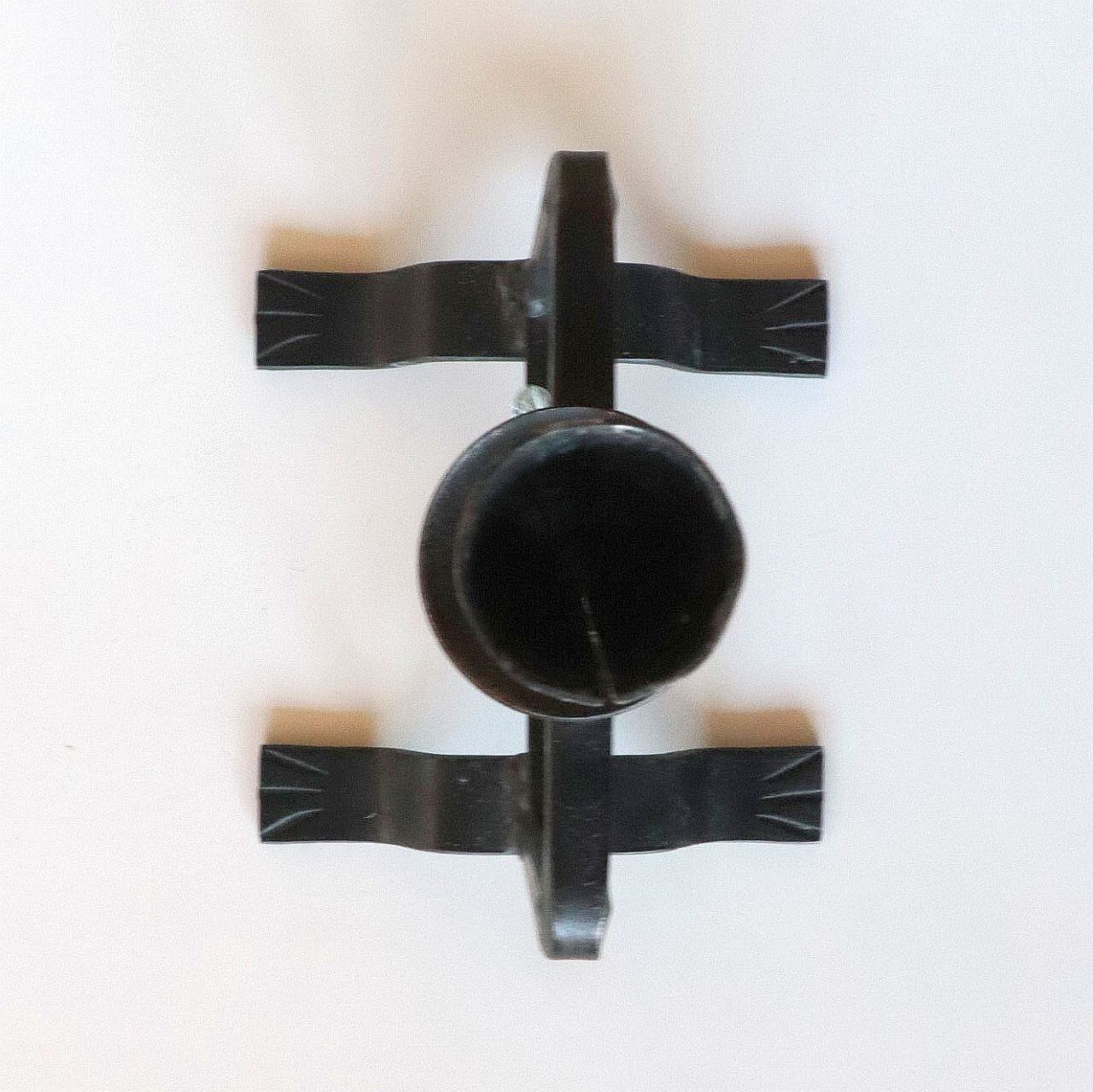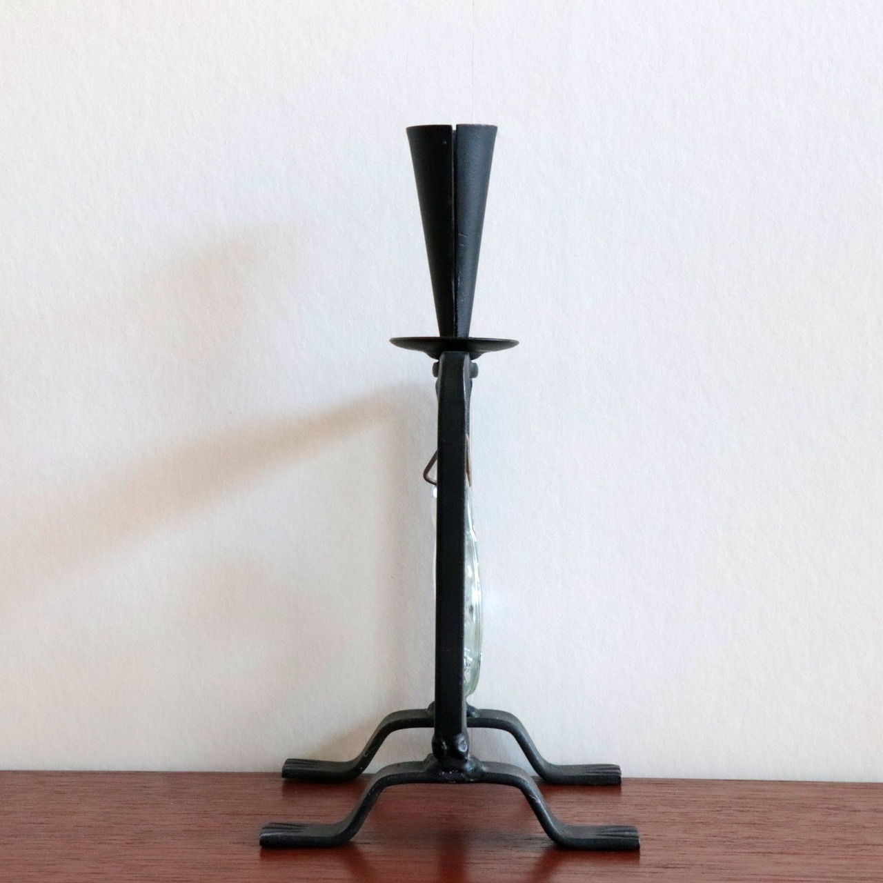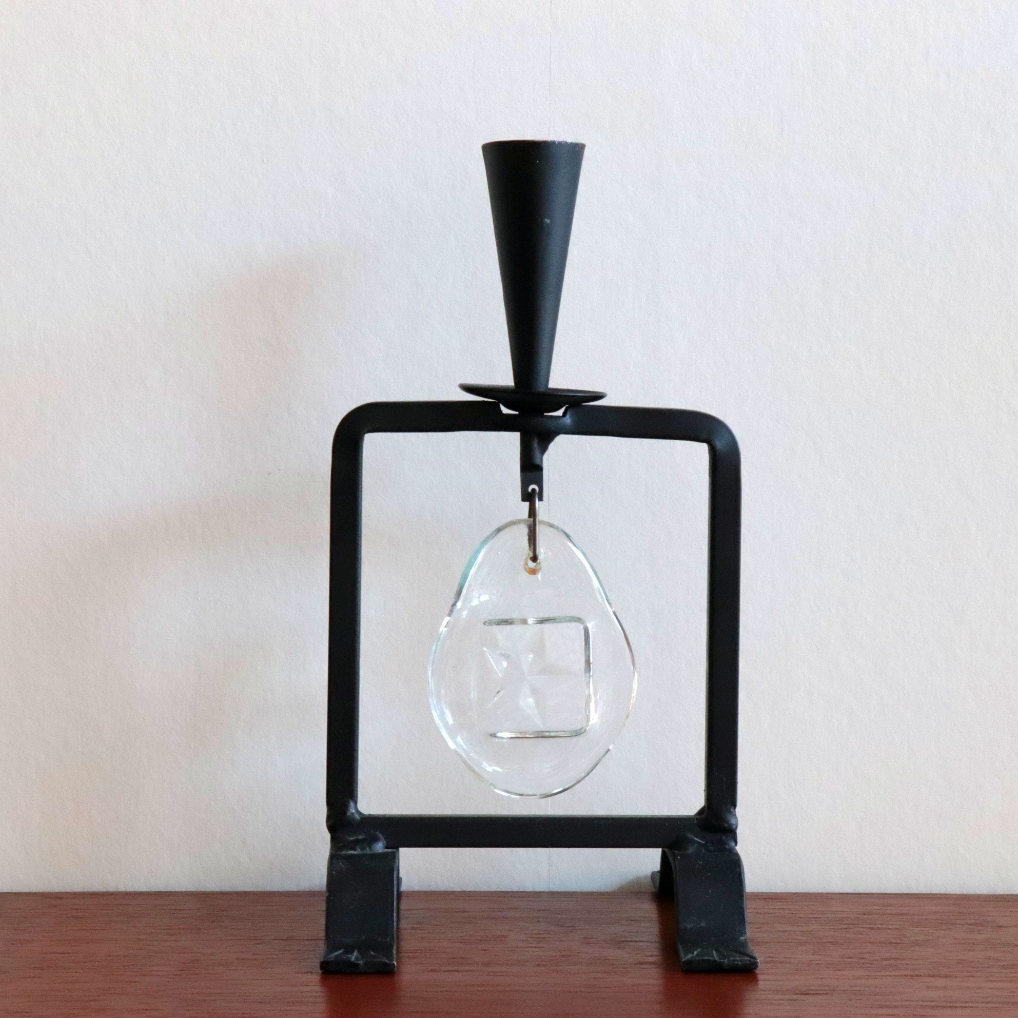 ロートアイアンの本体に、透明な厚いガラスが1つ組み込まれています。このモチーフはサイズ違いや色違いでも製作されており当時のインテリアの中で特に人気の高かったシリーズの一つです。