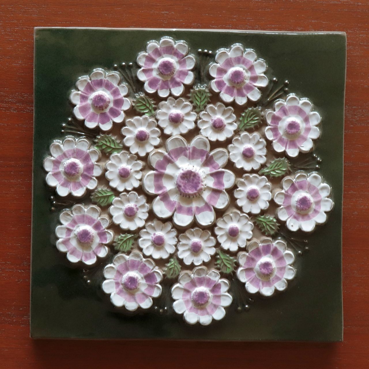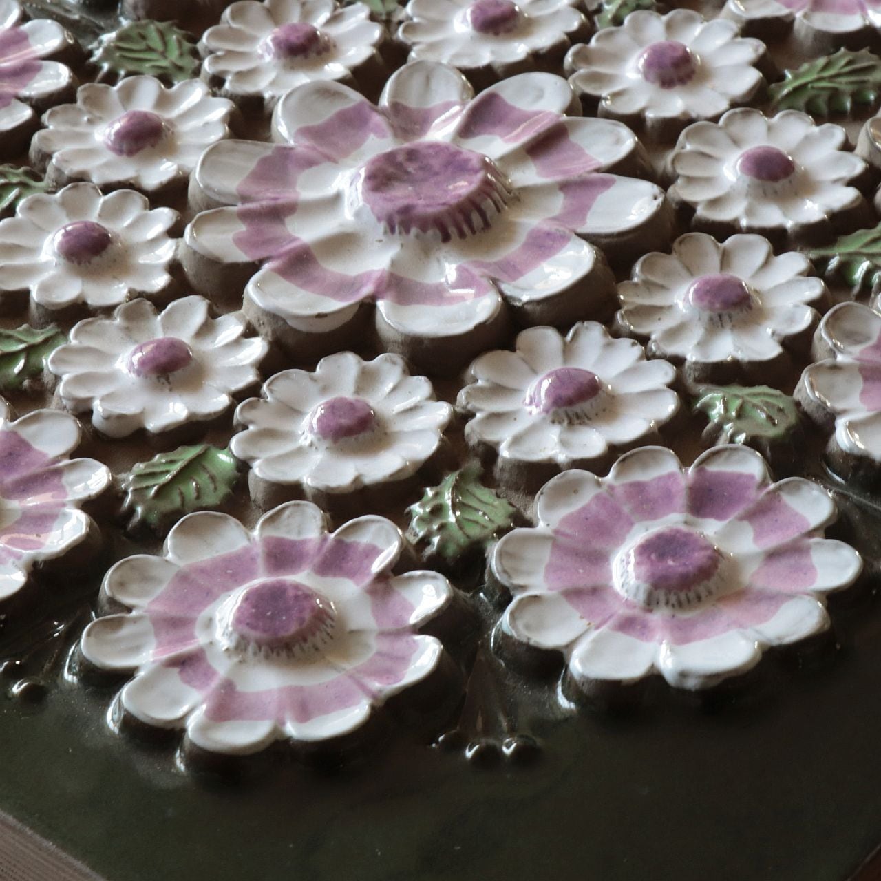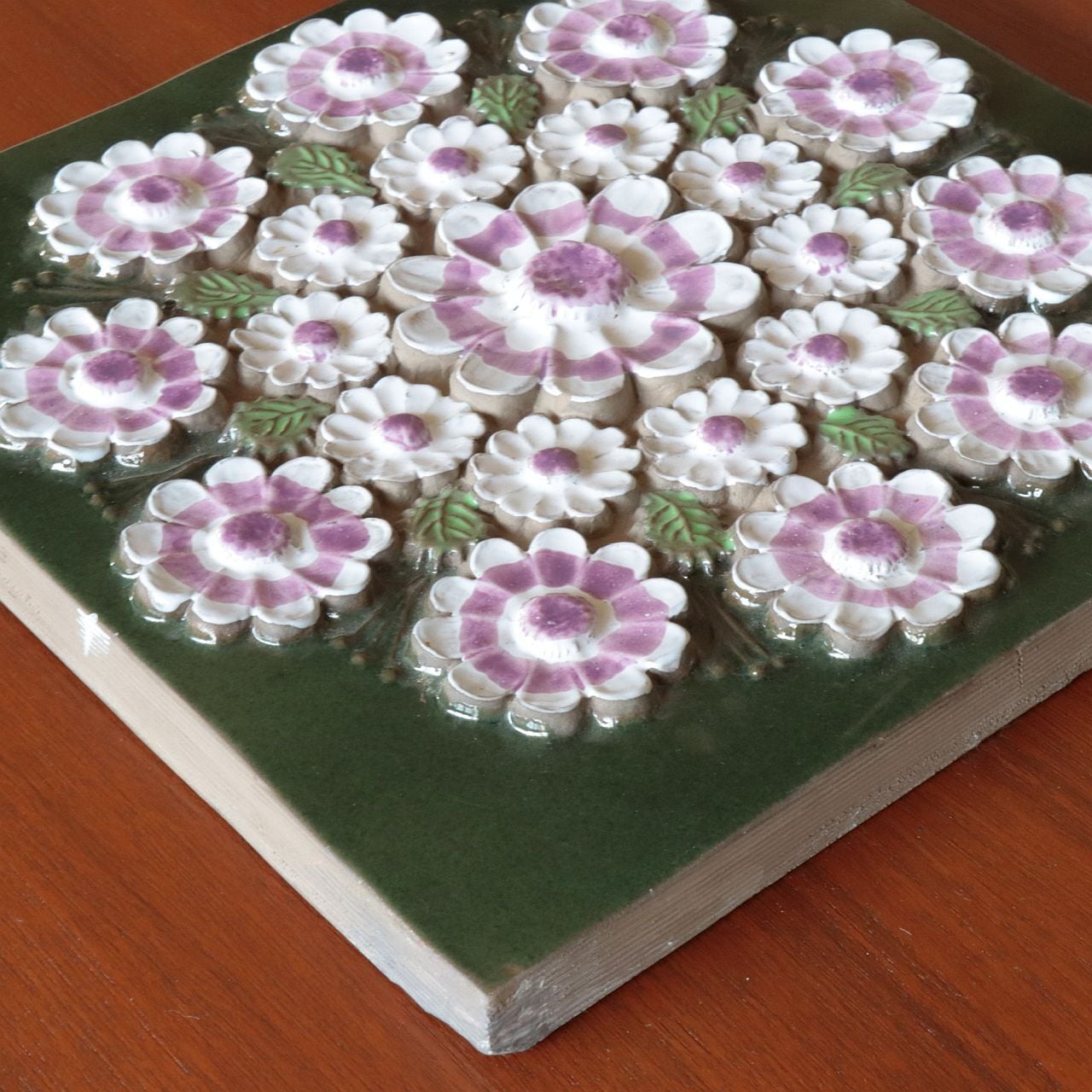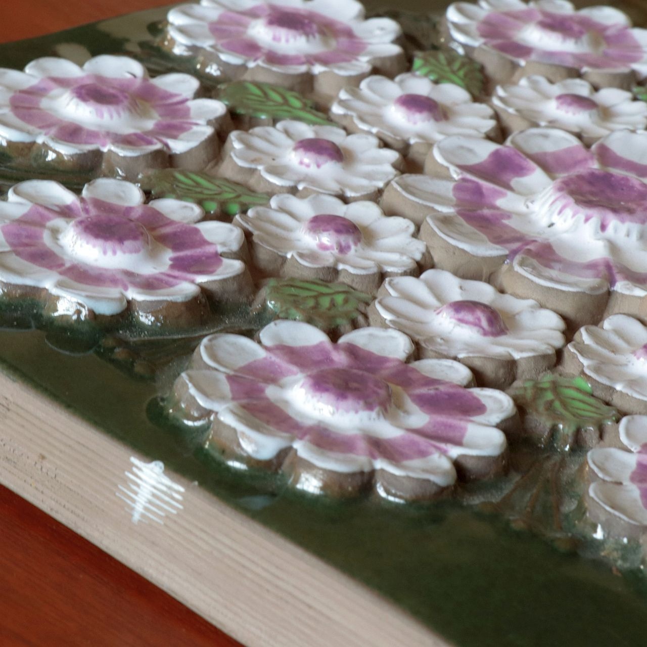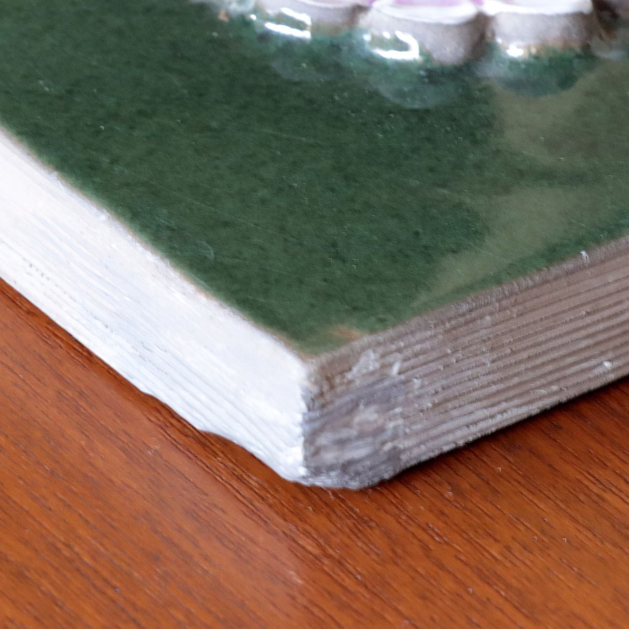 同社陶板の特徴として、製造時にコテやヘラによる成型時の凹凸、焼成時の釉薬抜け・色とび、また製造後の小さな欠けなどが比較的おきやすいアイテムとなります。また同じモチーフの製品でも製造時の個体差により若干のサイズ差が見られる工房となります。