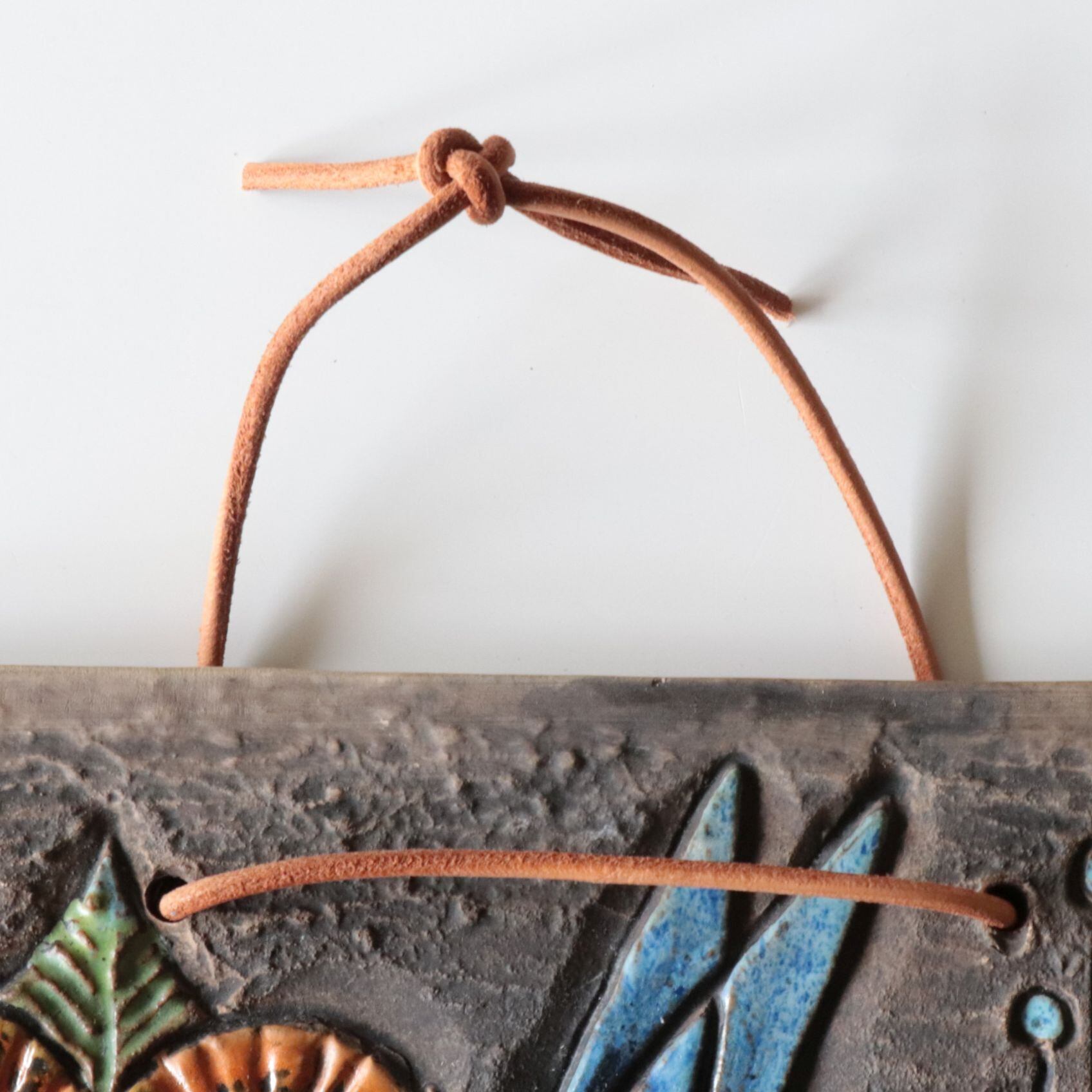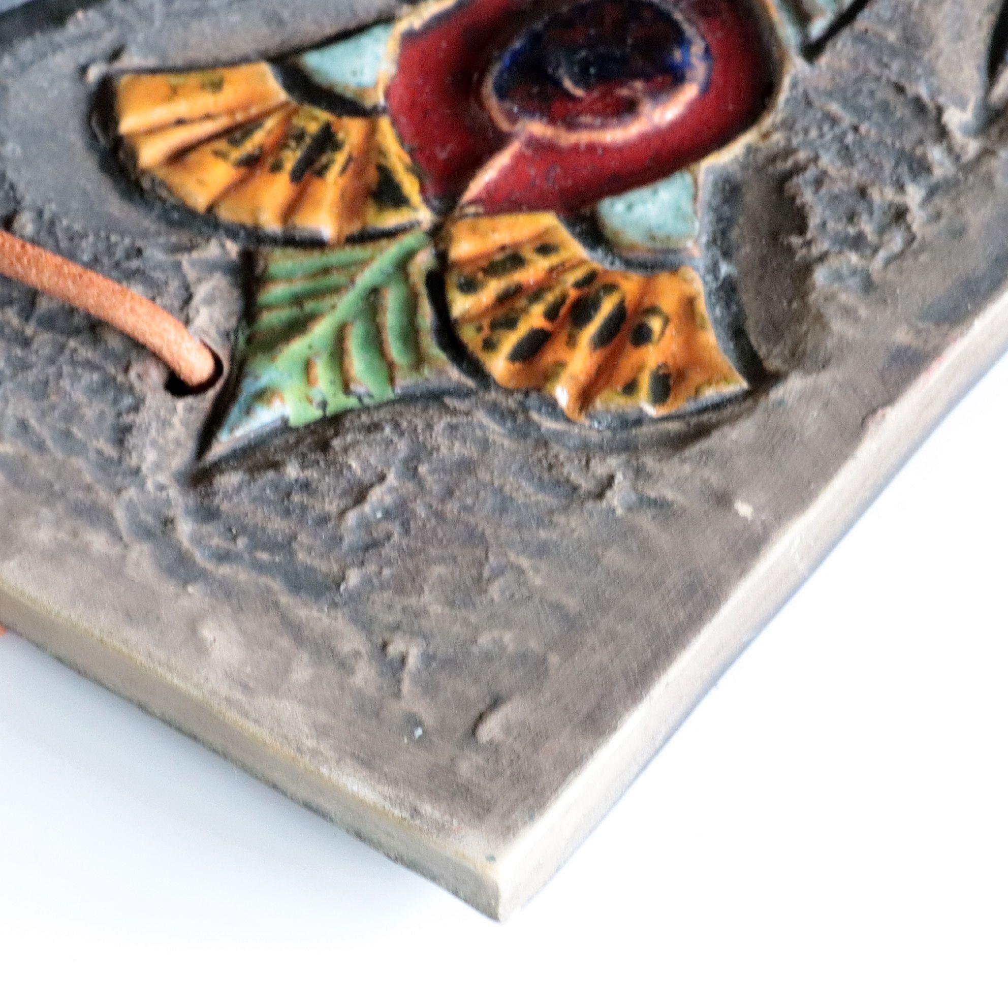 陶板は素朴な土色の素地に、果物や植物、動物などをモチーフにした色鮮やかな釉薬装飾が施されており、素焼きの質感と艶やかな釉薬のコントラストが美しいのが特徴です。バランスよく構成されたデザインは、壁に掛けるだけで空間に温かみとアート性を添えてくれる、一点一点が手作業で仕上げられたオリジナリティの高いアートピースです。