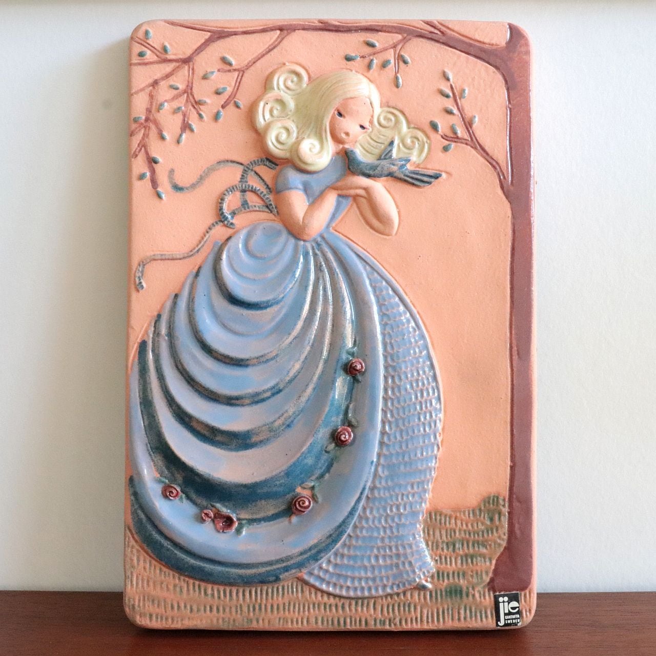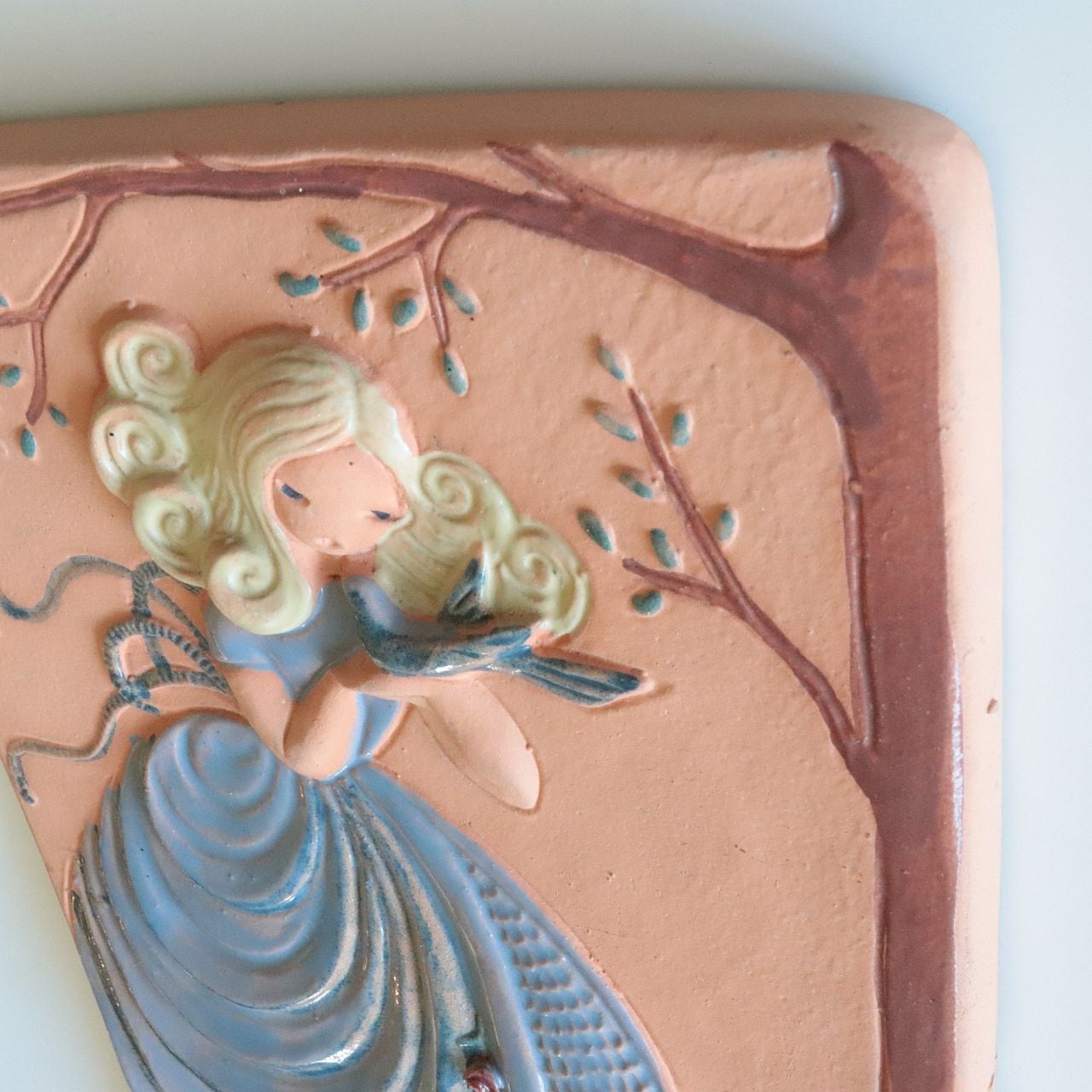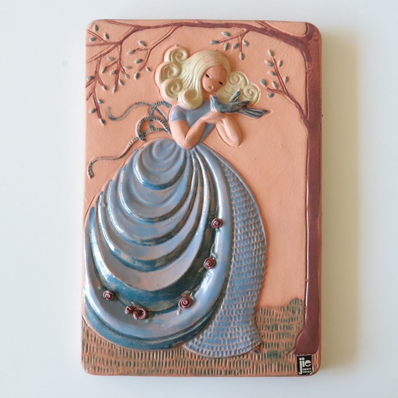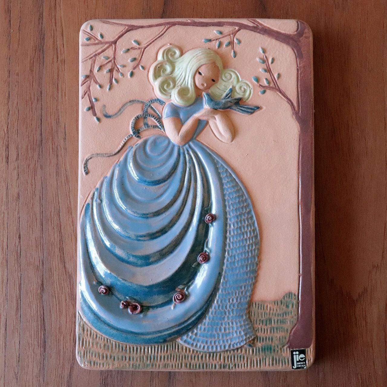【c8001】少女と青い鳥の陶板(29.5㎝) [Jie Gantofta/Sweden]