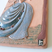 同社陶板の特徴として、製造時にコテやヘラによる成型時の凹凸、焼成時の釉薬抜け・色とび、また製造後の小さな欠けなどが比較的おきやすいアイテムとなります。また同じモチーフの製品でも製造時の個体差により若干のサイズ差が見られる工房となります。